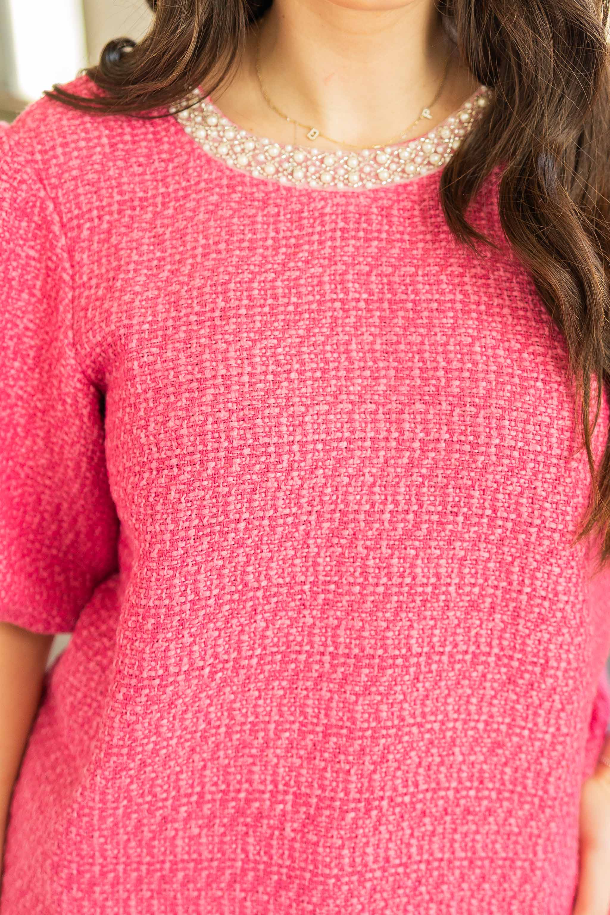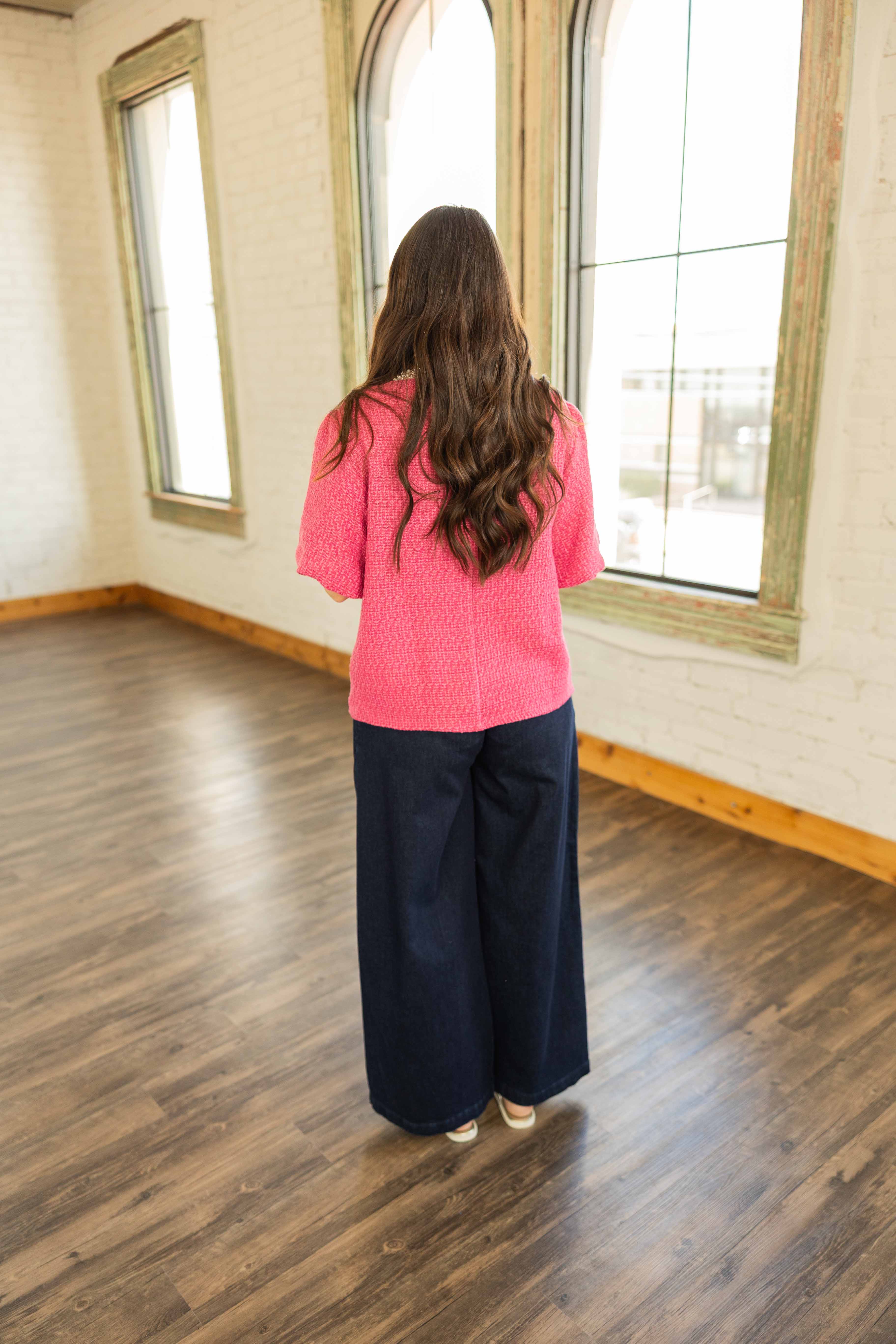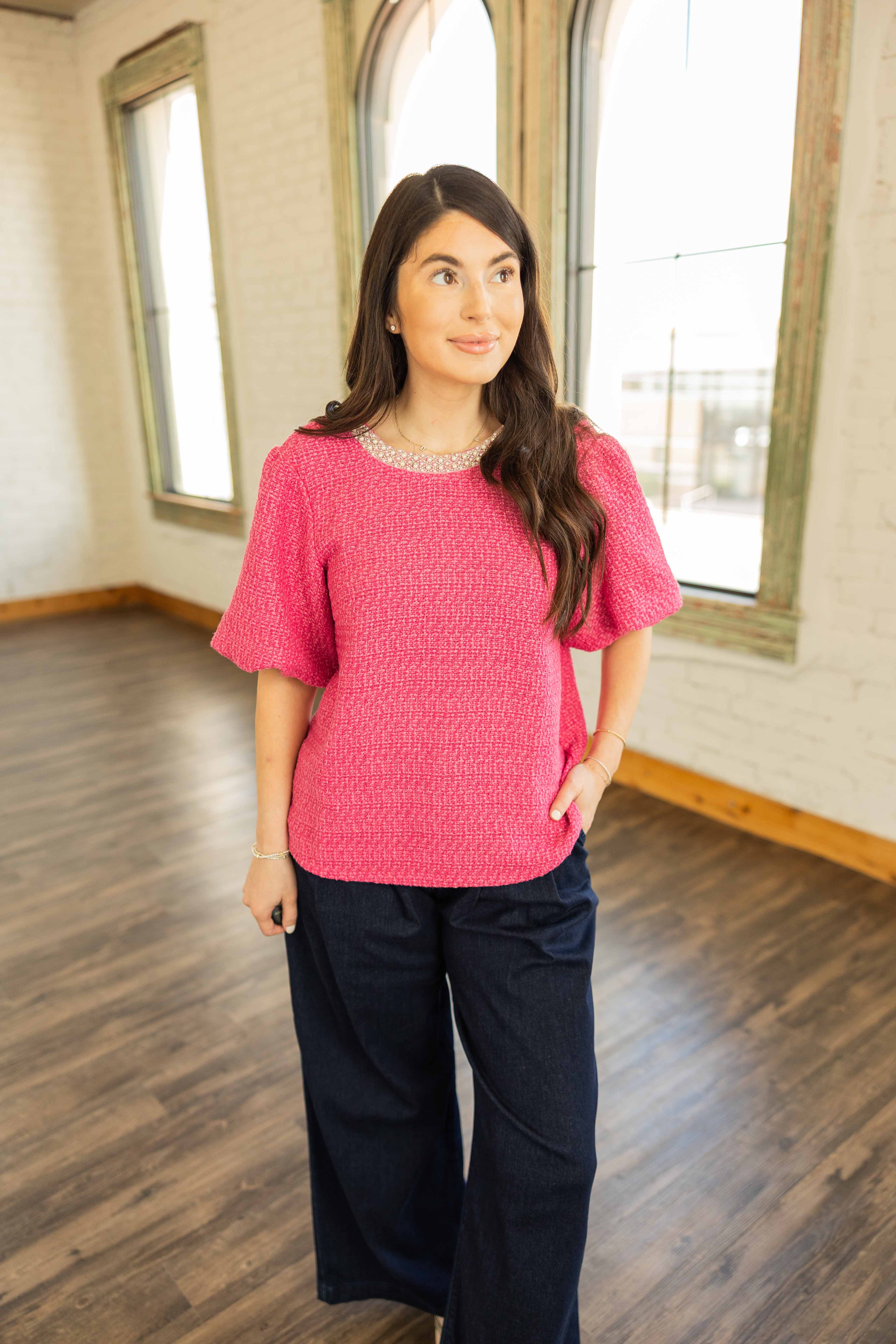 Soft, feminine, and just a little fancy. This bubblegum pink knit top keeps things easy with a roomy fit, then dresses it up with the prettiest pearl trim along the collar. The slight puff sleeve adds shape without feeling overdone, and the back button detail gives it that polished finish. It is one of those tops that makes you look like you tried, even when you did not.