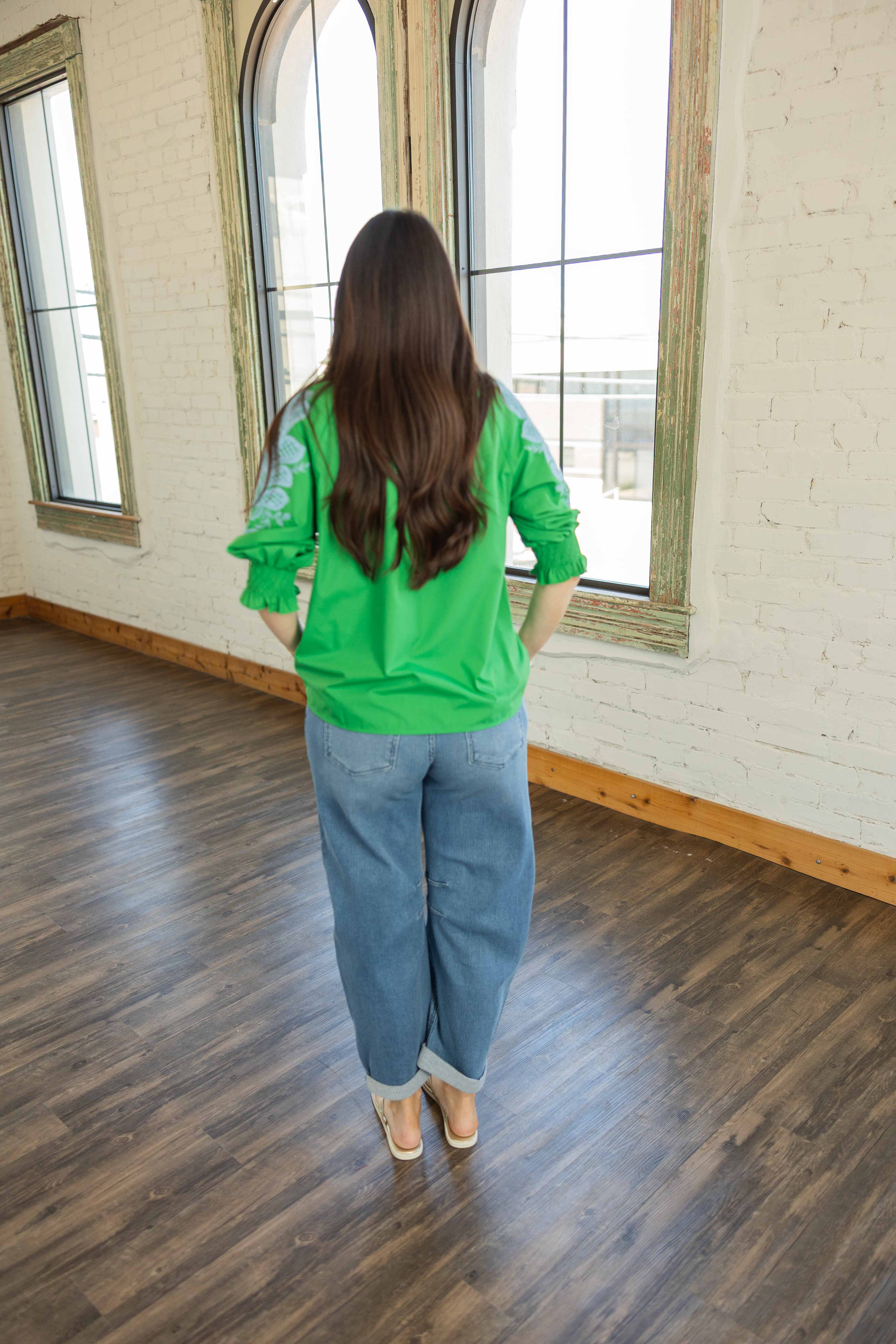This top does all the work for you. Bright. Happy. Put together without trying. The bold green color feels fresh and clean. The white embroidery adds that extra something that makes it feel special but still easy. Relaxed fit so it never feels fussy. This is a walk in and get compliments kind of top.