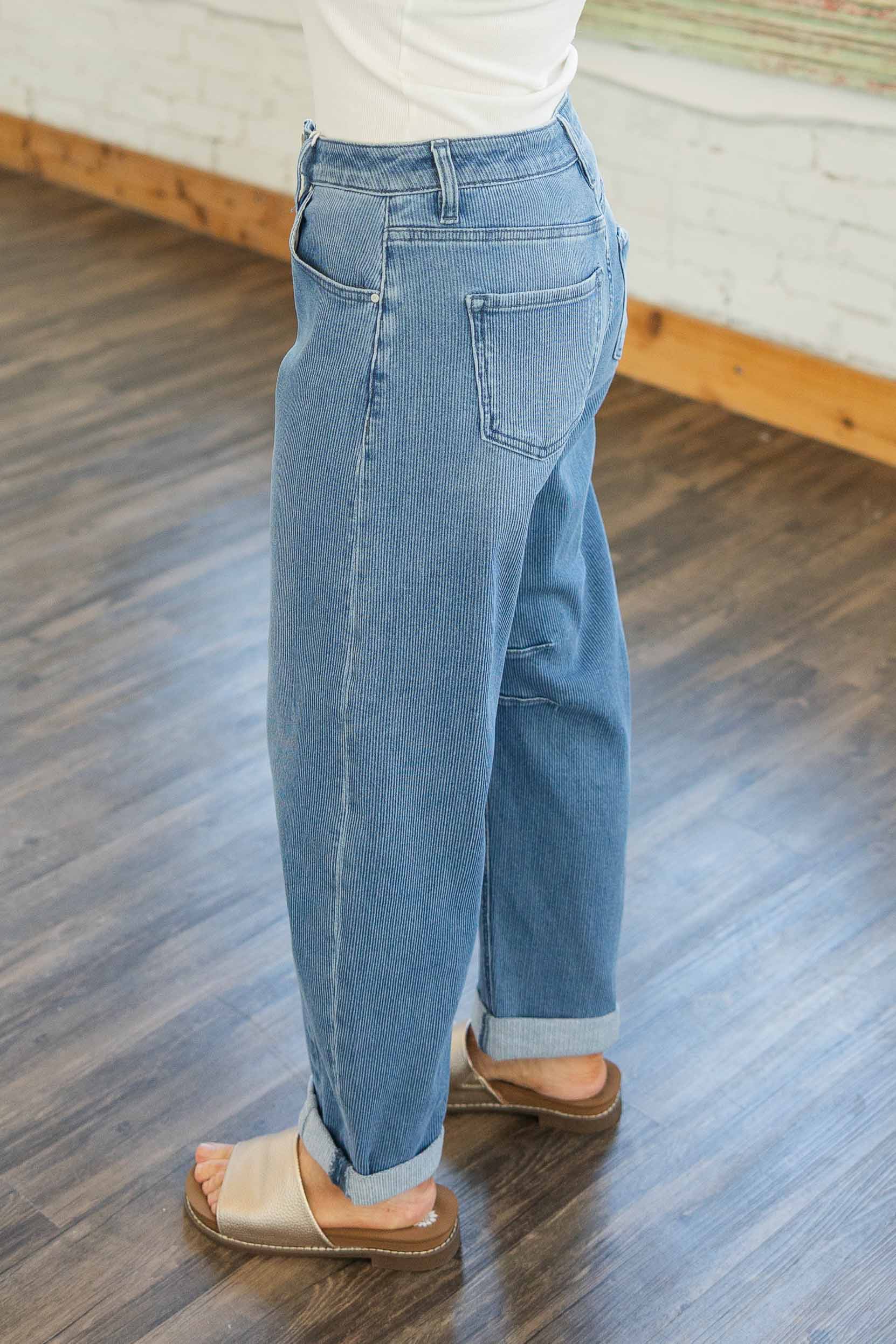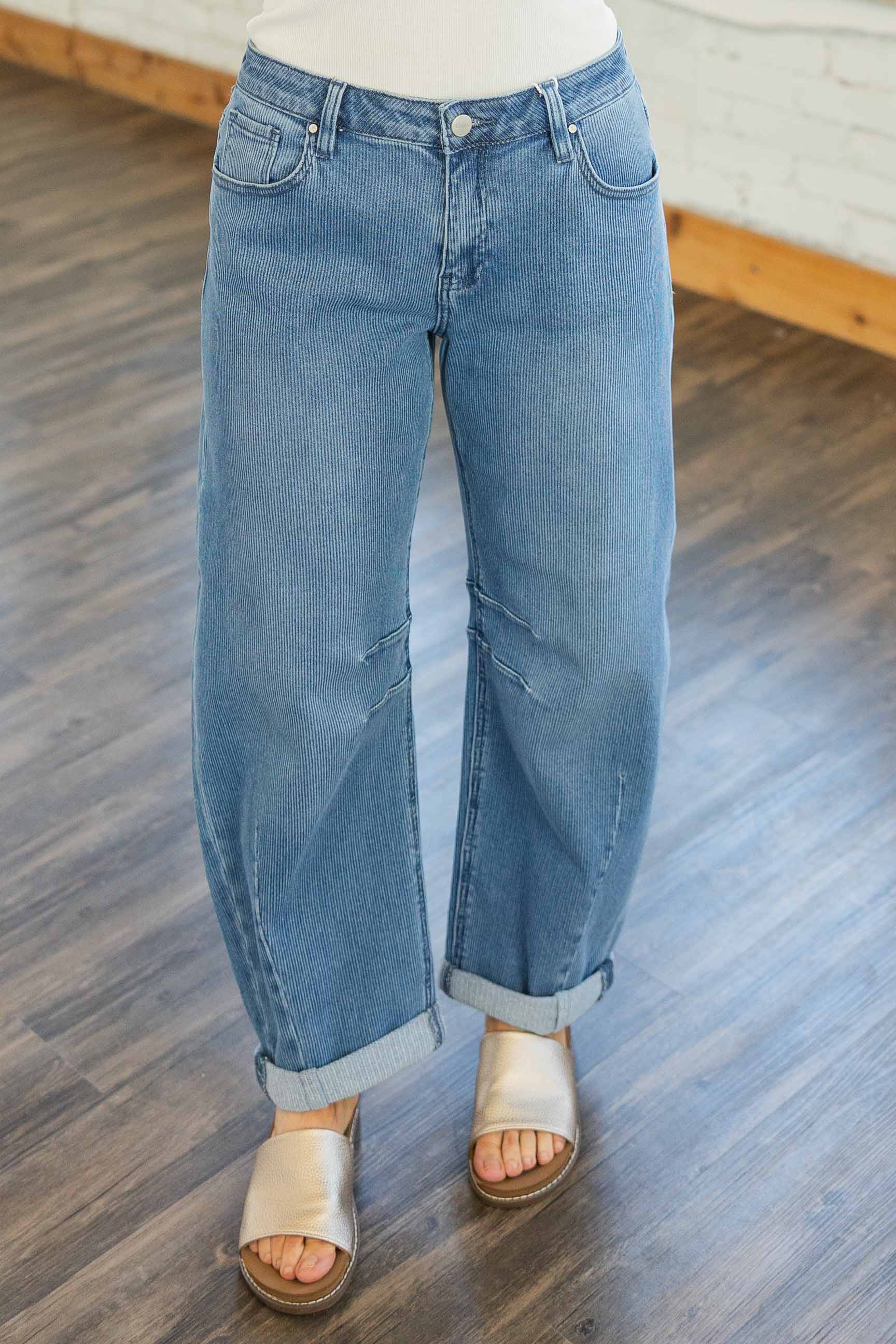 These are the cool girl jeans you reach for when you want structure without stiffness. That textured denim gives them personality. The slouchy barrel shape feels relaxed but still polished. The cuff is optional which means you get two looks in one. Effortless. Flattering. Very wearable.