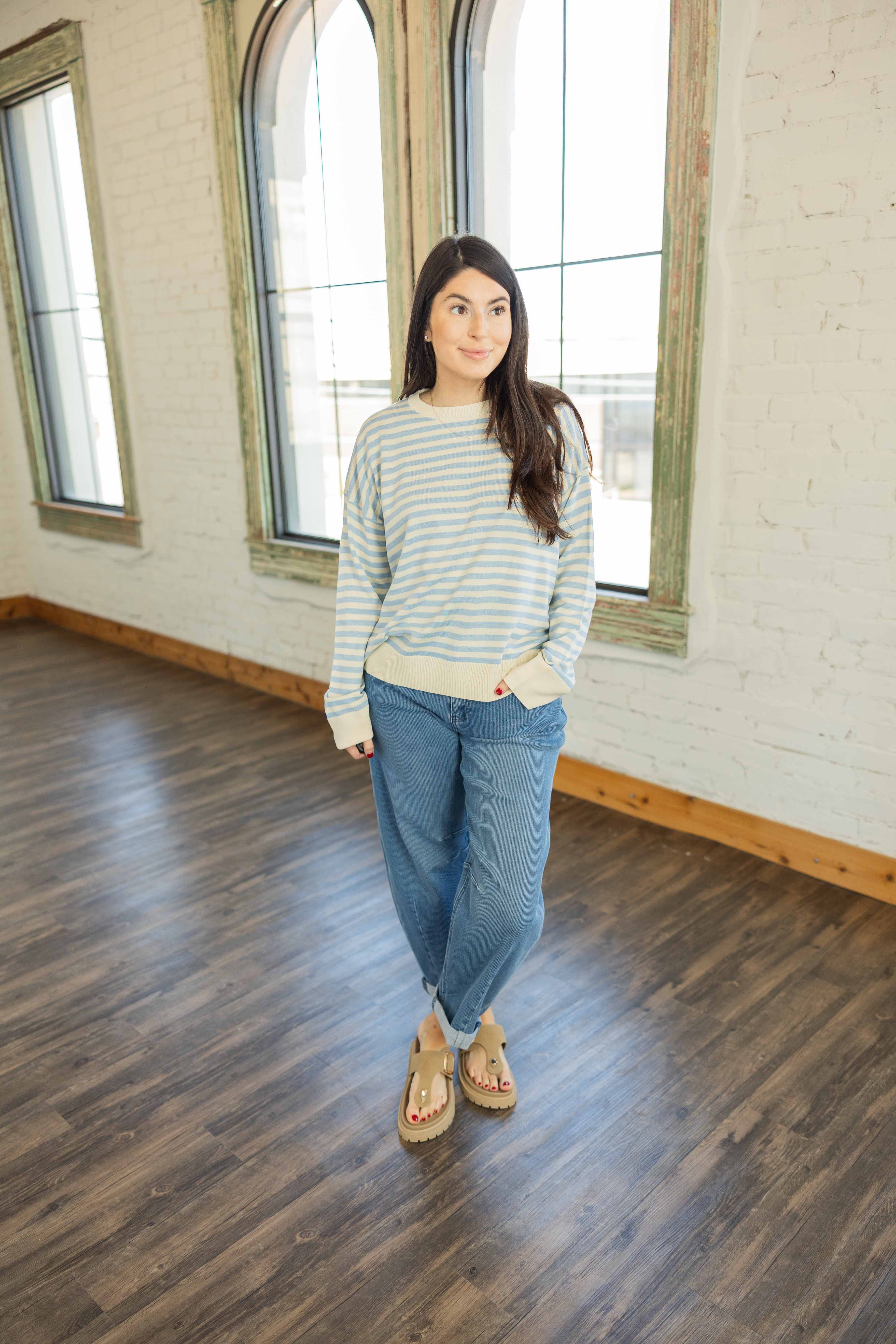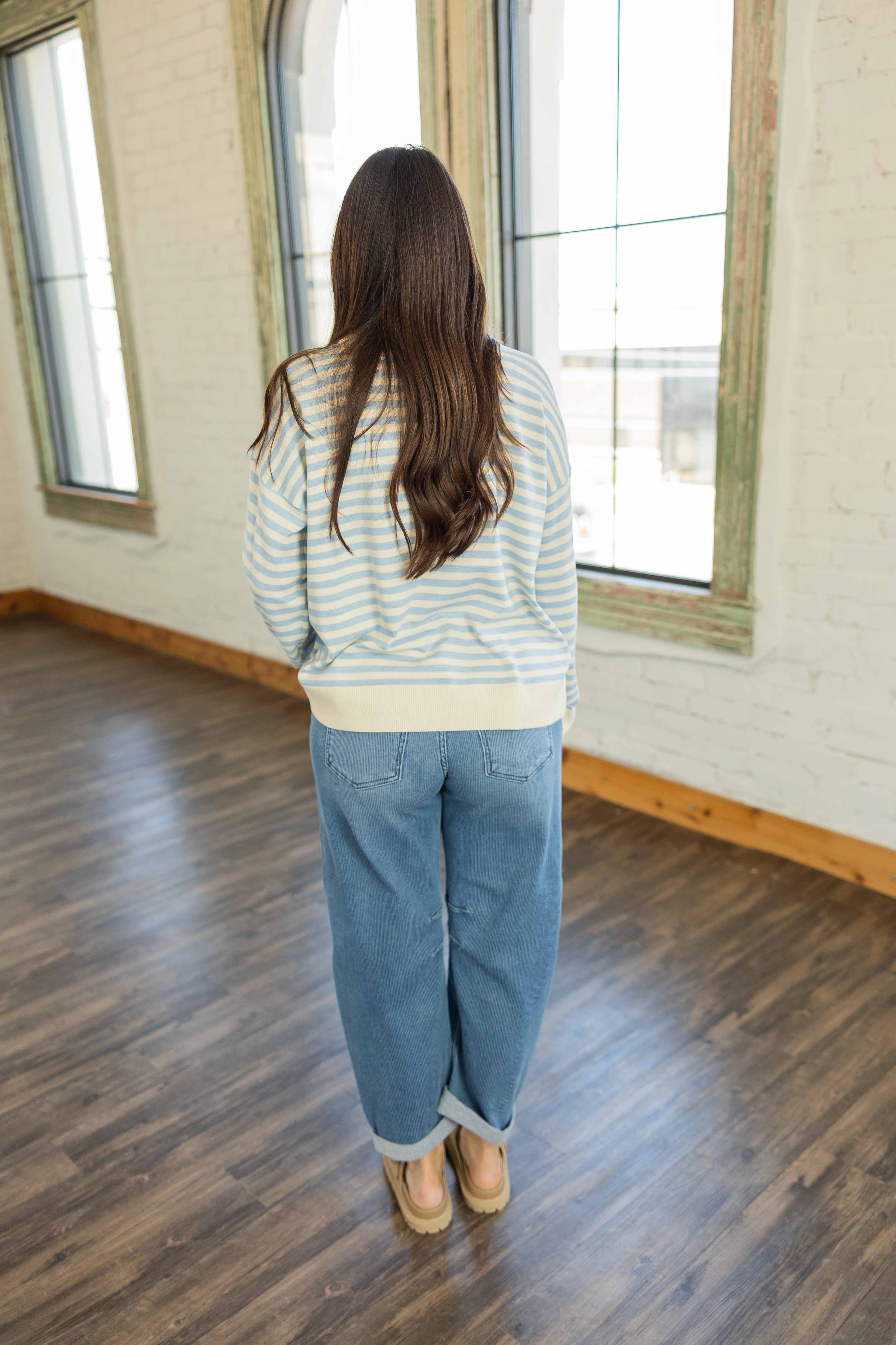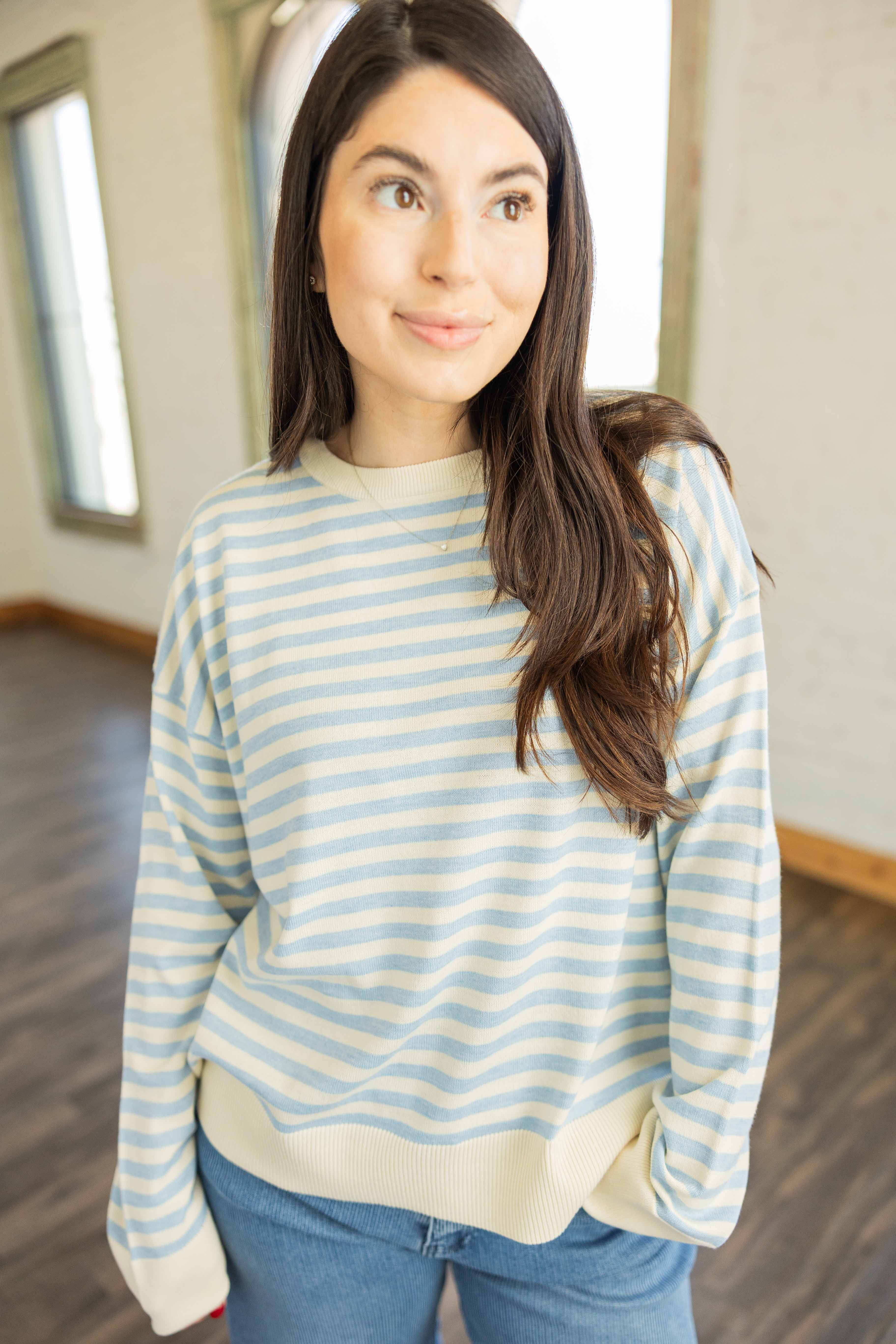 This is that soft easy layer you reach for when you want comfort but still want to look cute. Light. Breezy. Effortless. The cloud blue and ivory stripes feel clean and calm. The boxy roomy fit gives you space without swallowing you. It drapes just right and works tucked, half tucked, or left alone.