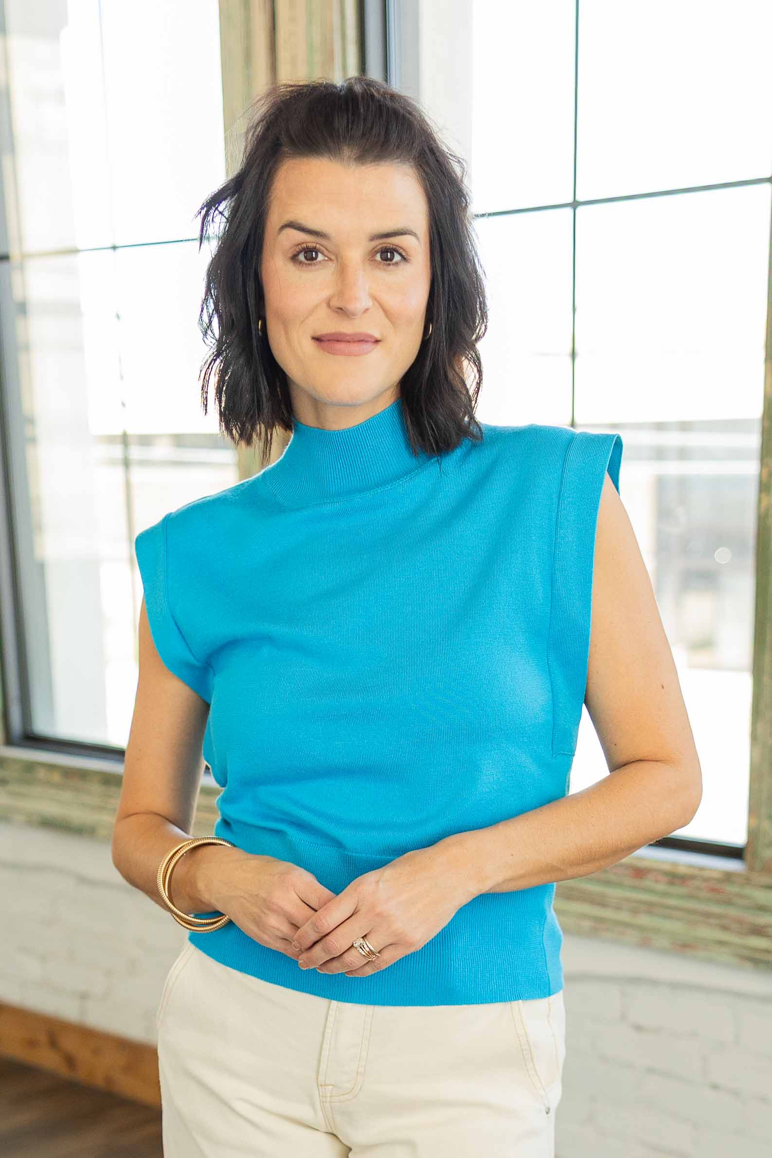 Clean. Polished. Easy. This is one of those pieces that instantly elevates whatever you put it with. The mock neck adds structure while the sleeveless cut keeps it breathable. The knit is smooth and lightweight with just enough drape. It feels modern and effortless. The bright blue color brings a fresh pop that still works as a neutral.