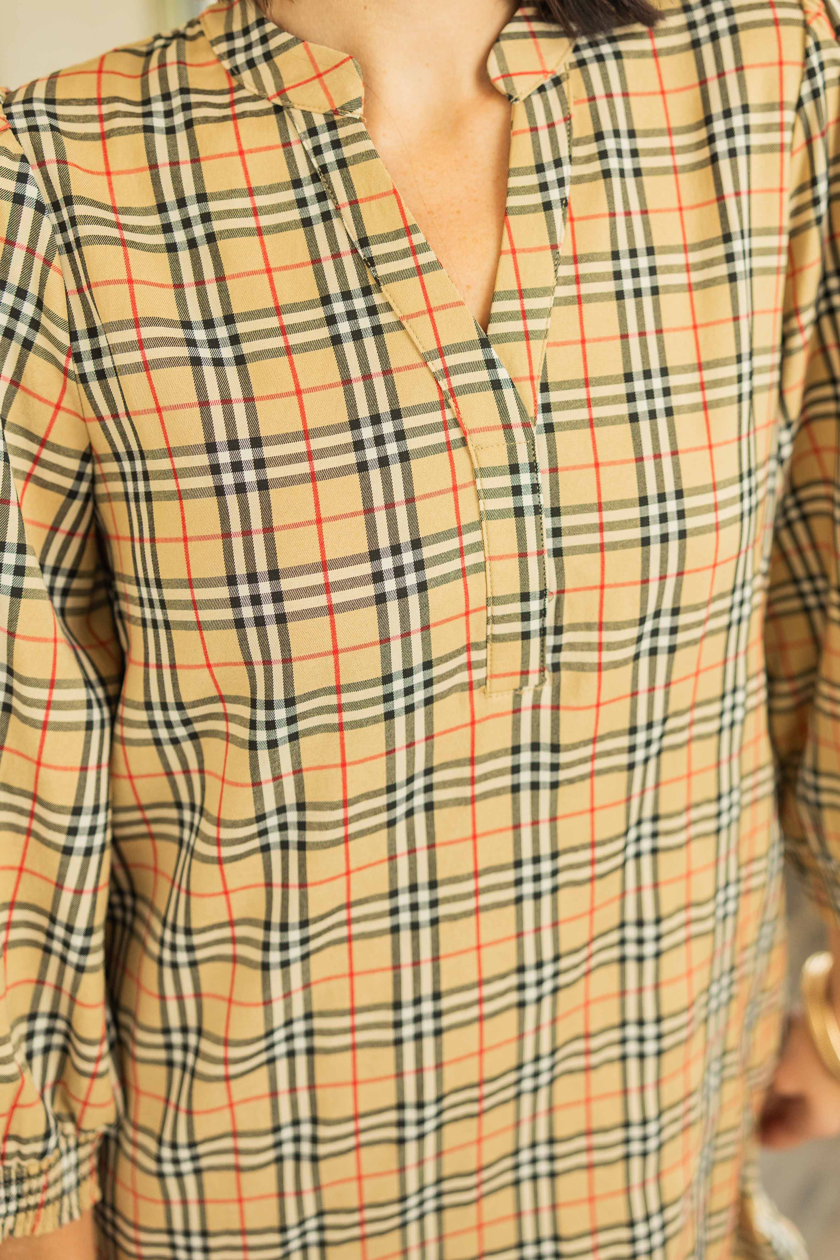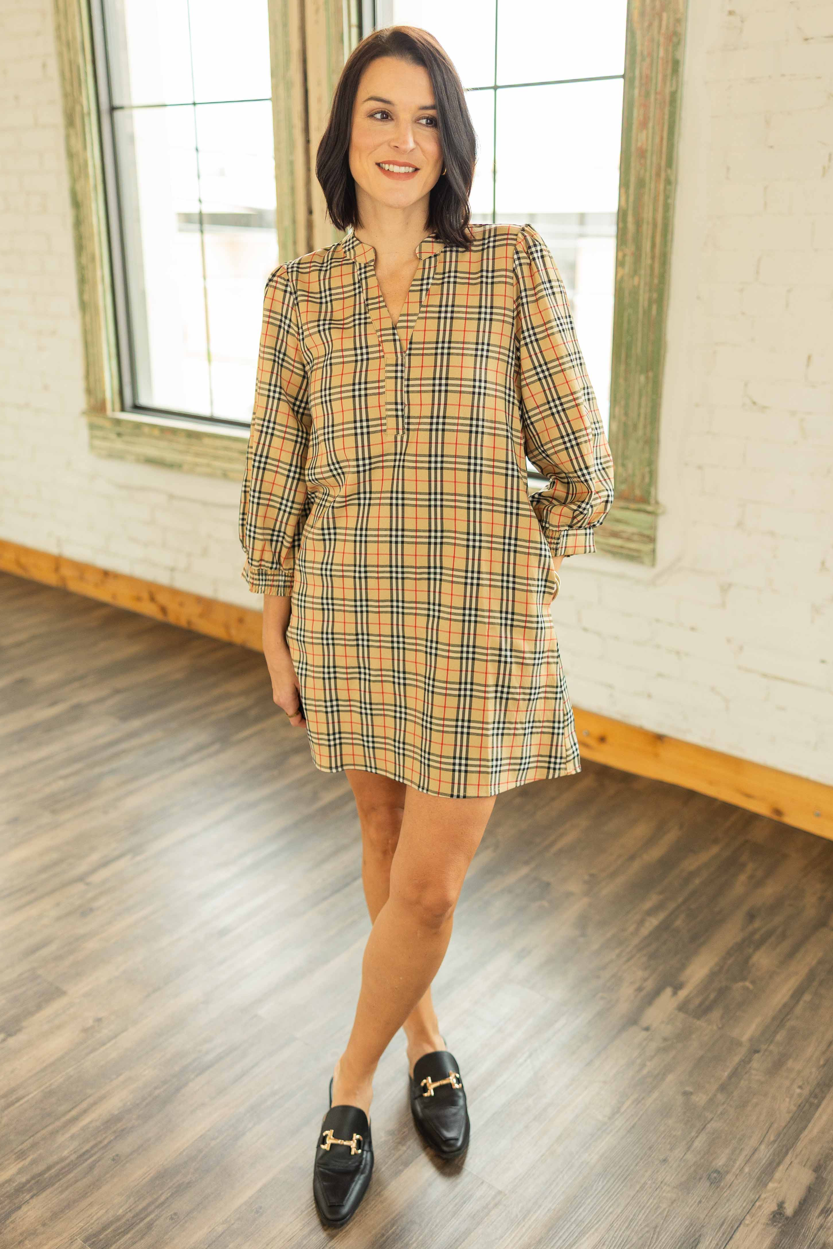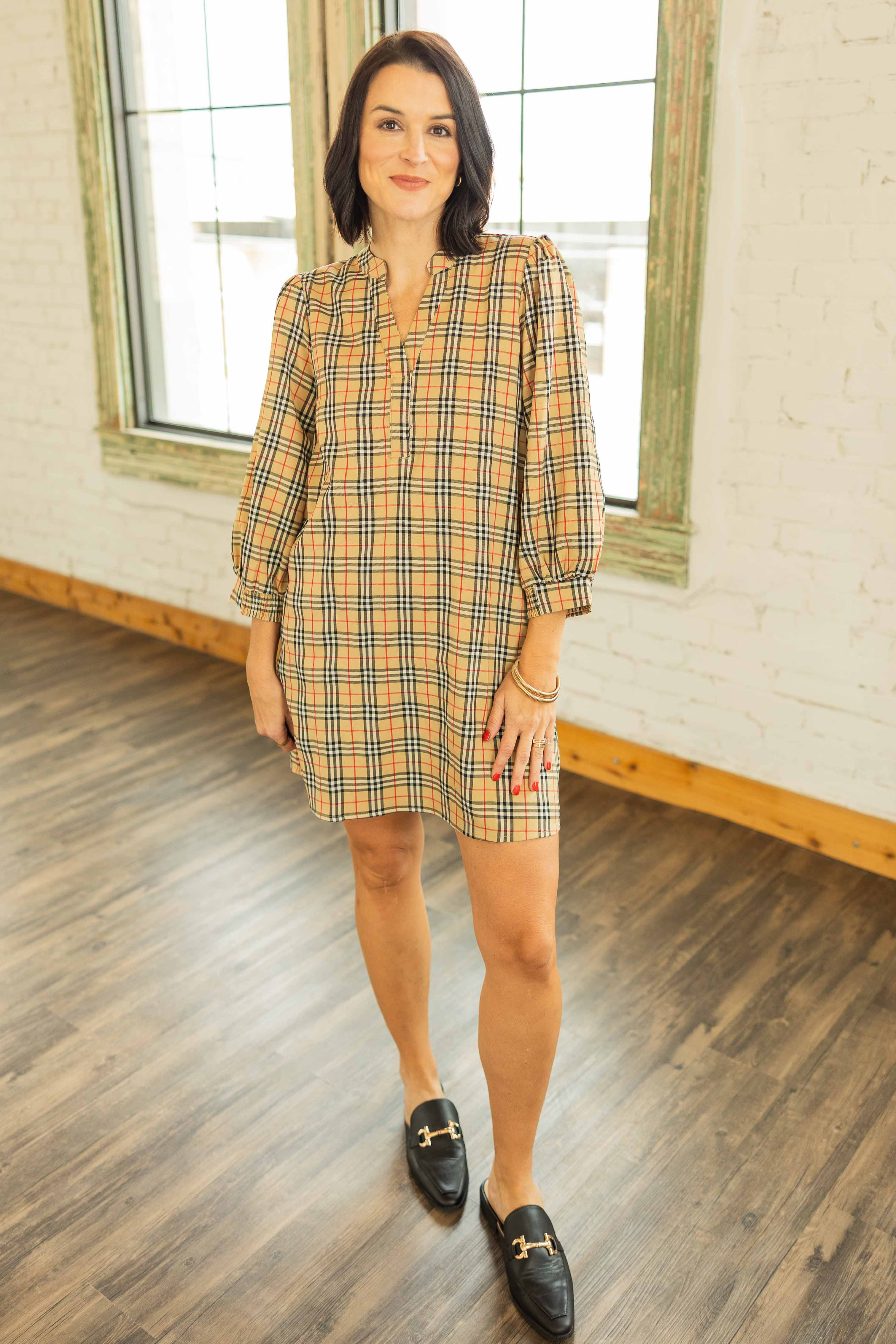 Cute. Classic. Checks all the boxes. This taupe plaid mini dress feels like fall without the heavy layers. Relaxed shape that moves with you. The 3/4 sleeves give a little puff moment that feels polished but still comfortable. And yes, it has pockets. The holiday win we all deserve.