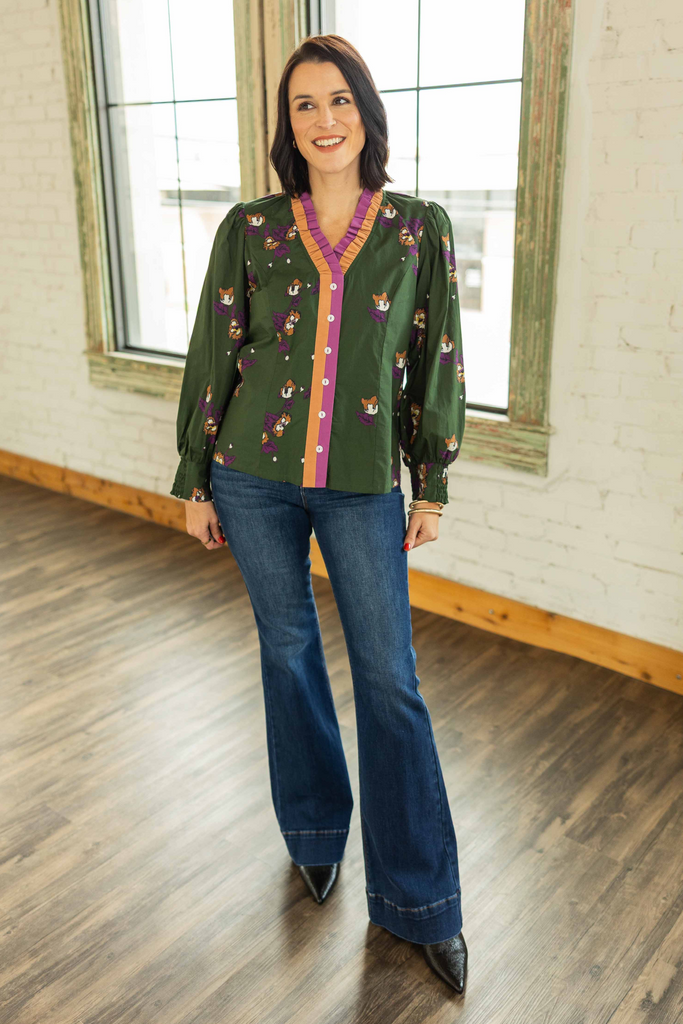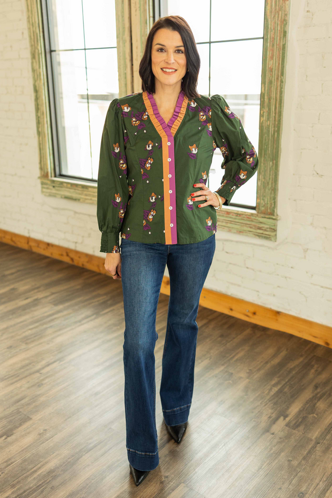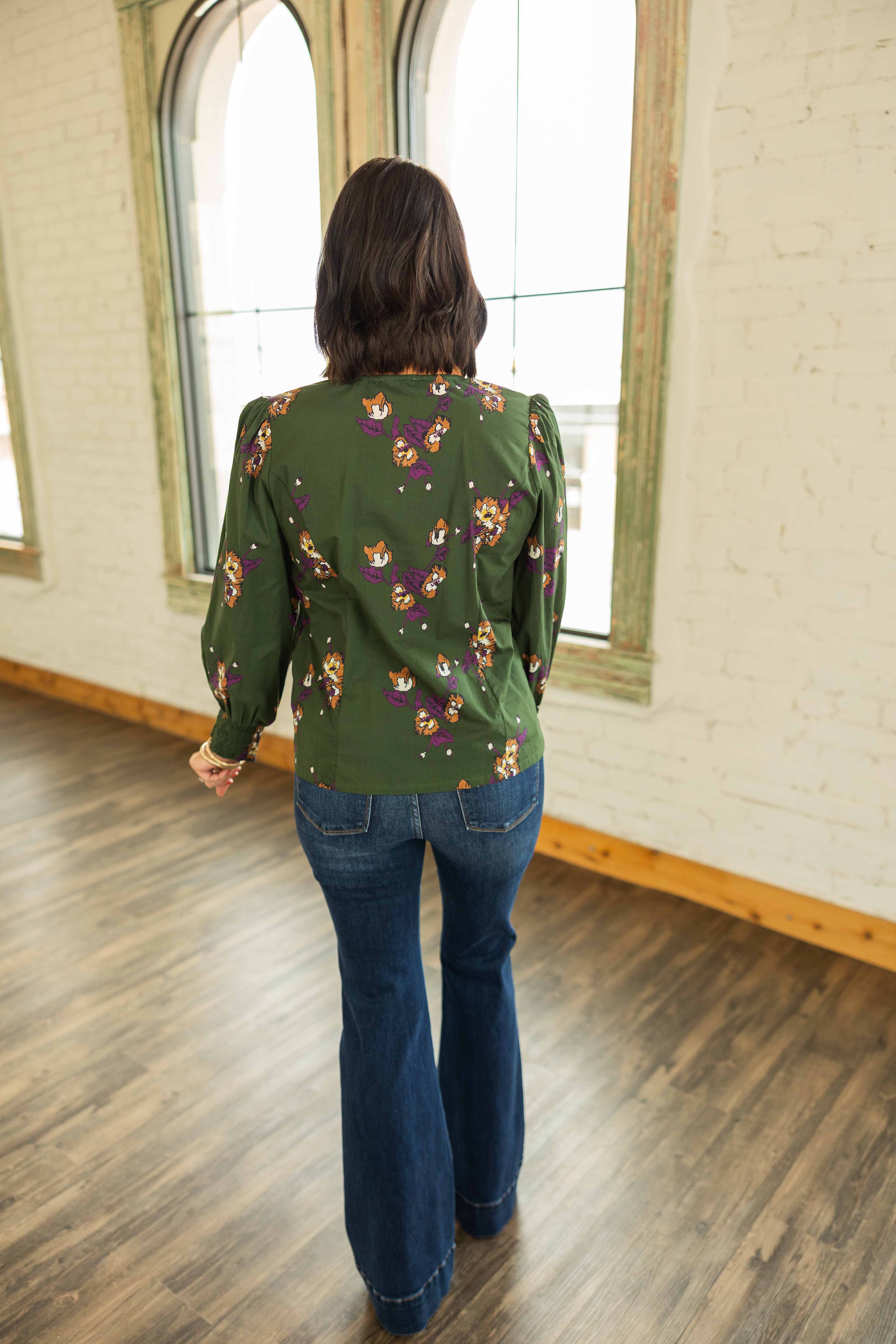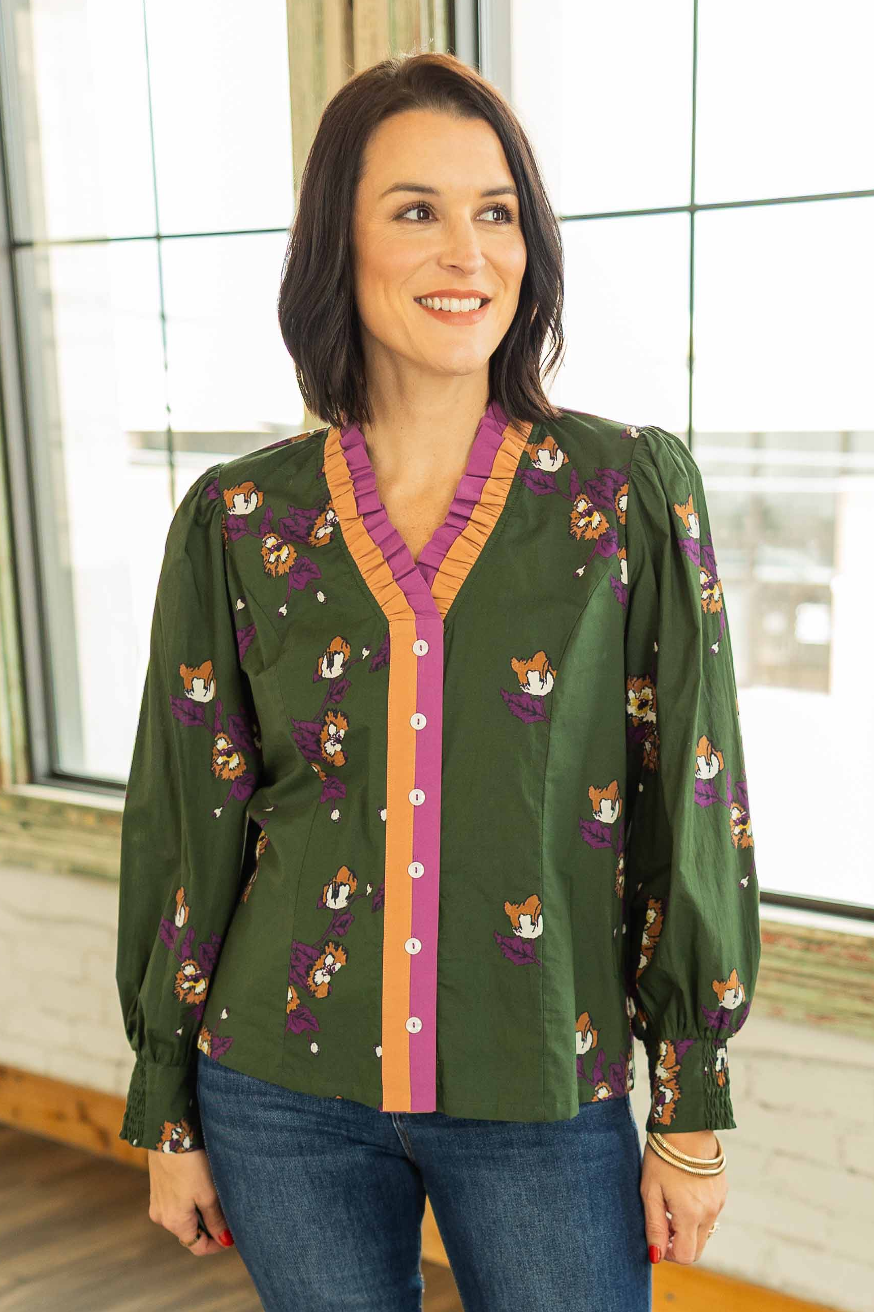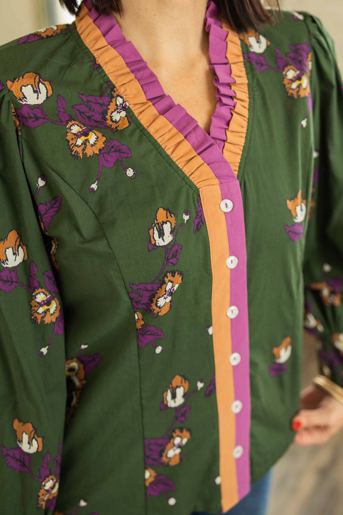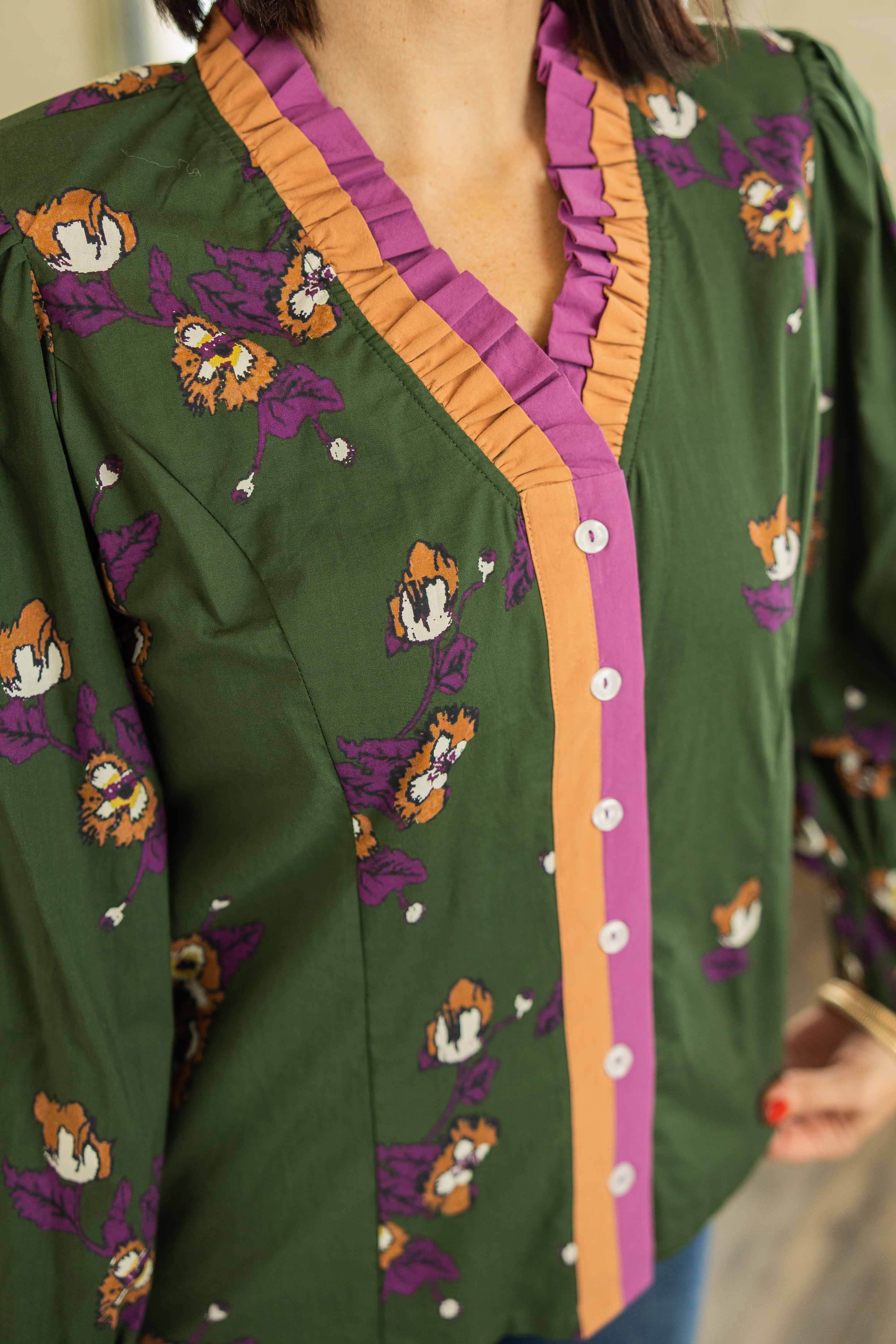 A top that delivers compliments on a platter. Bold mix of olive green with purple and golden florals. The pleated ruffle trim and puff sleeves bring the drama without going over the top. It feels like something you would discover in a cute boutique on vacation. Lucky you, you found it here.