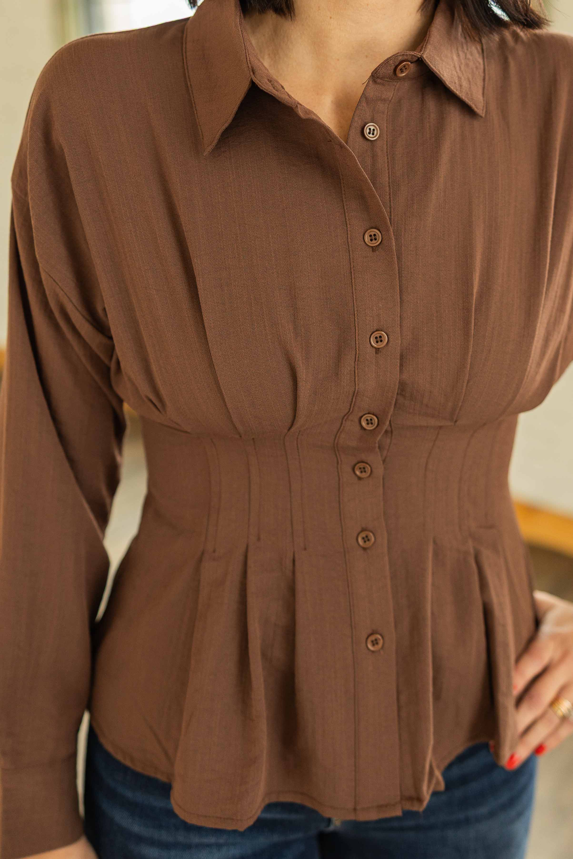 Warm coffee brown that feels like fall in a shirt. The peplum waist gives shape without trying too hard. Soft structure that flatters your middle and still lets you eat pie. Dress it up for the office or keep it casual for school pickup. It is a whole moment.