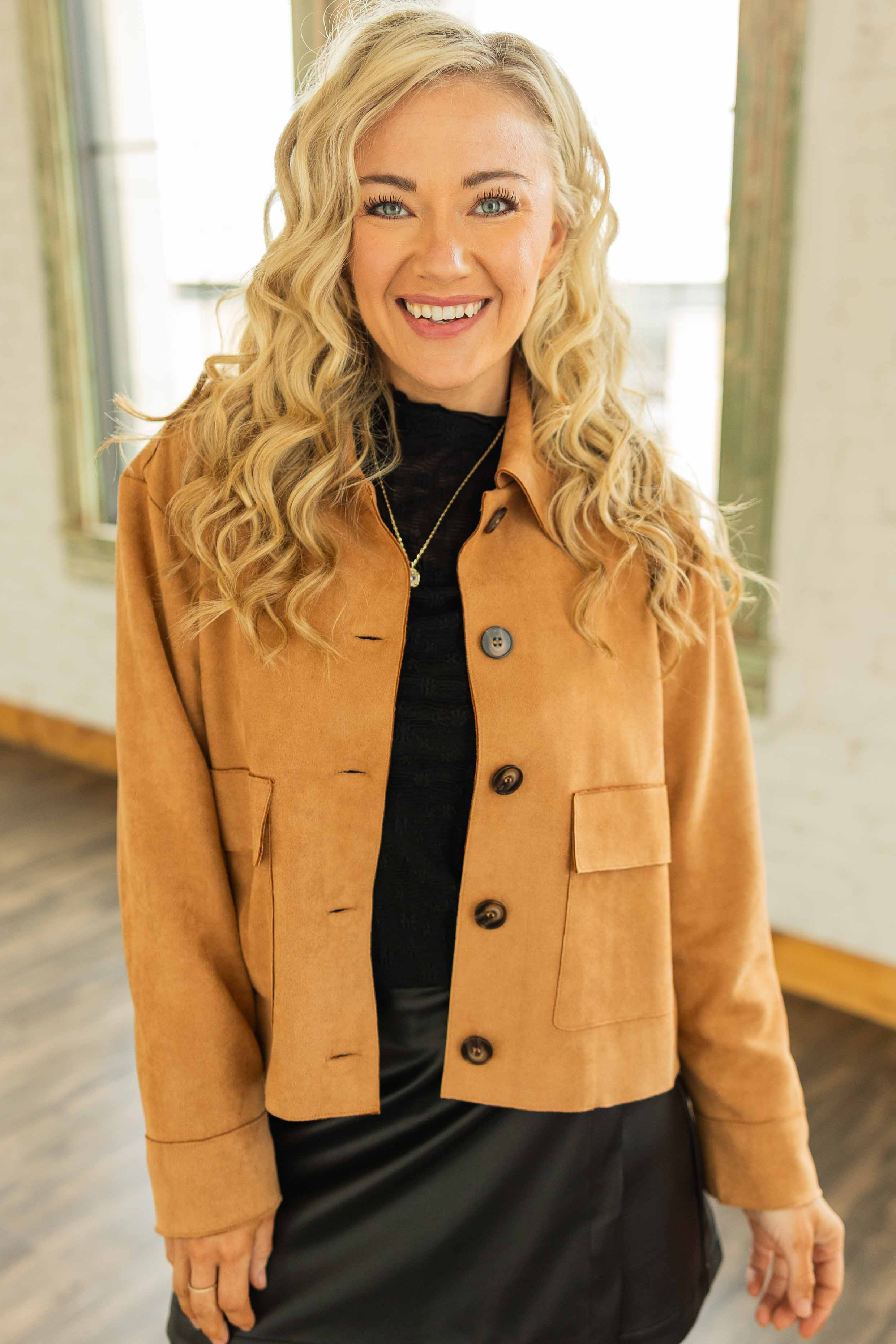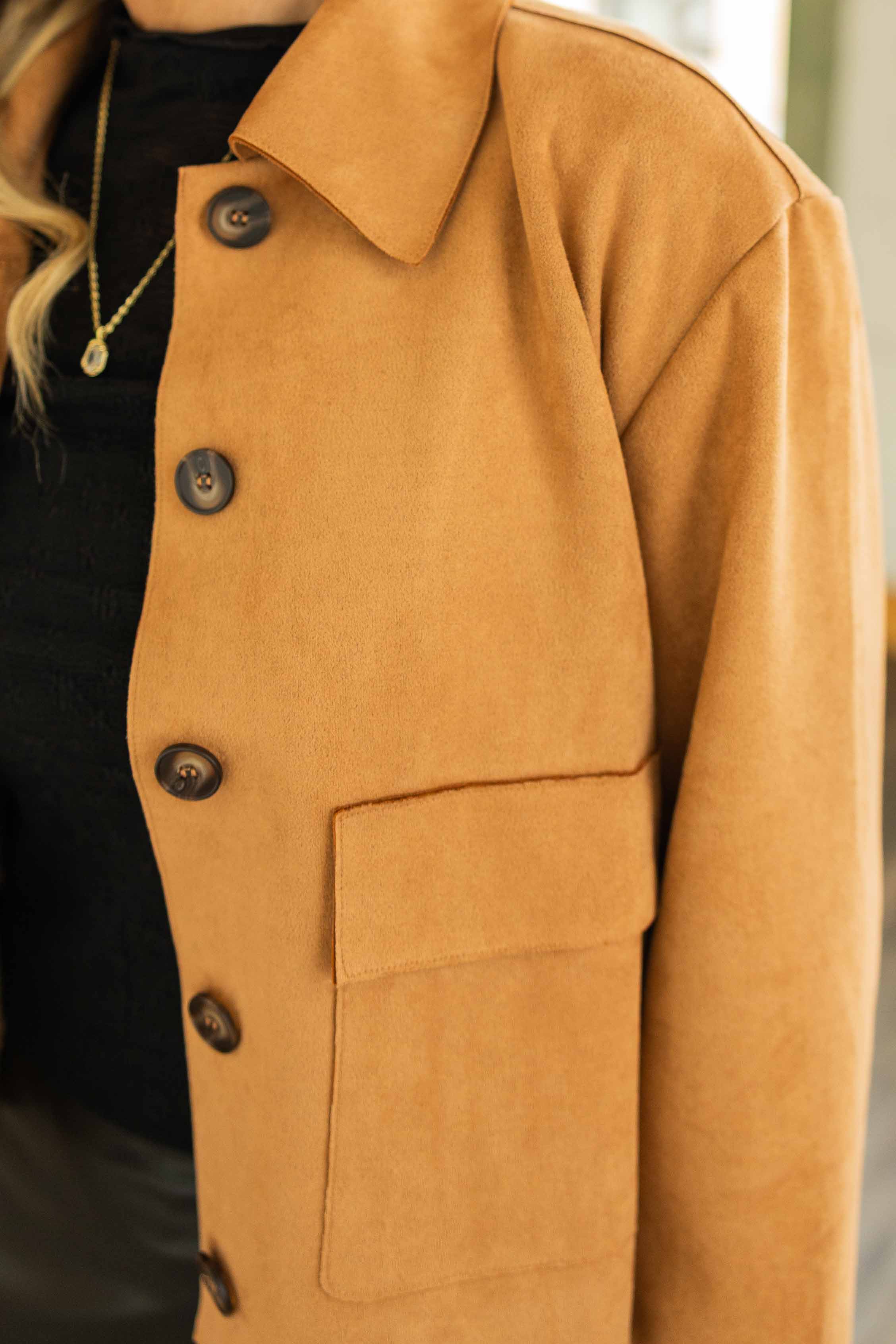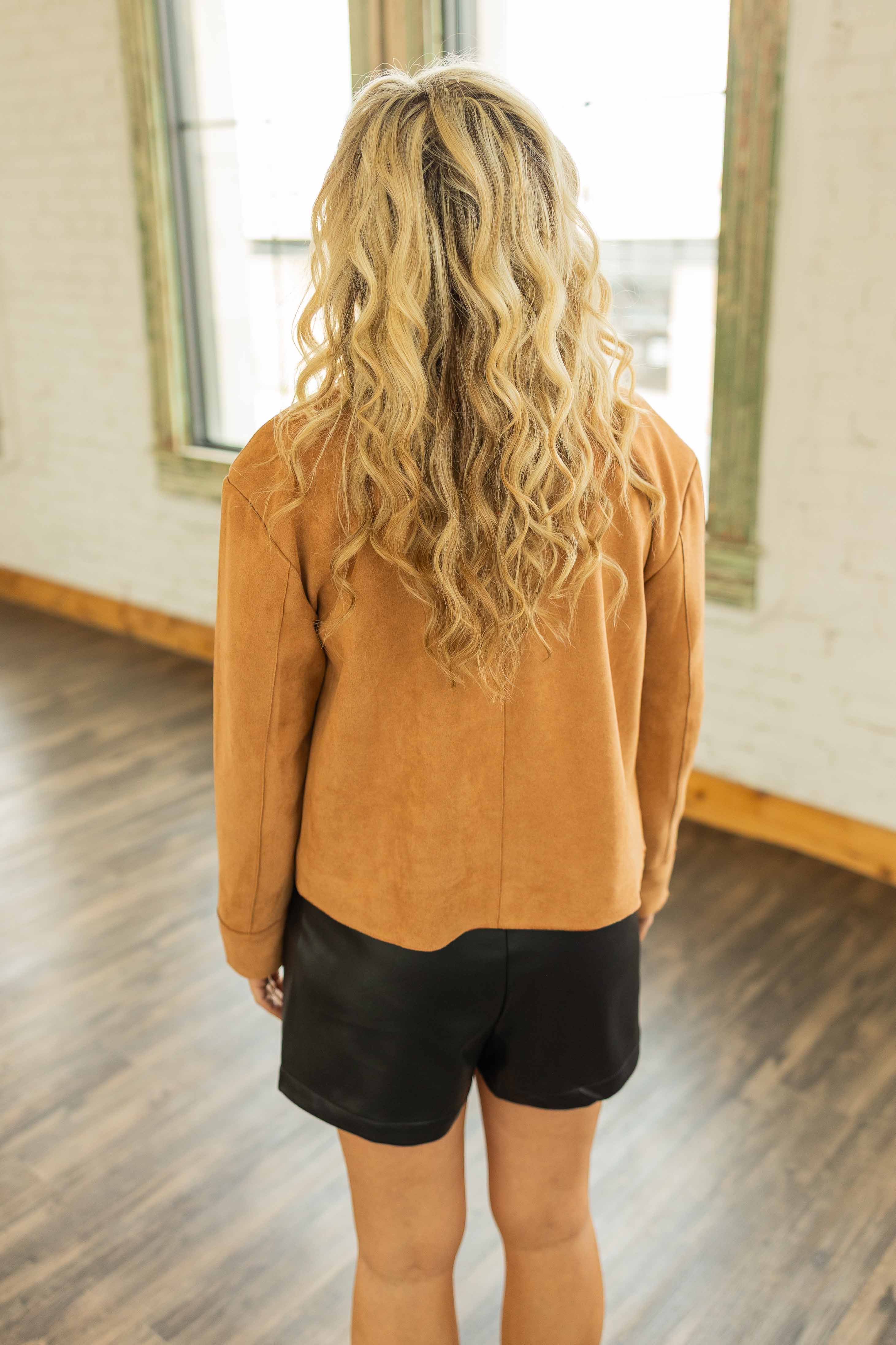 Cool weather staple with major outfit leveling powers. This soft suede jacket feels luxe without trying. The boxy cut gives it a modern touch. Throw it on with denim or dress it up with faux leather. It is the caramel treat your closet deserves this season.