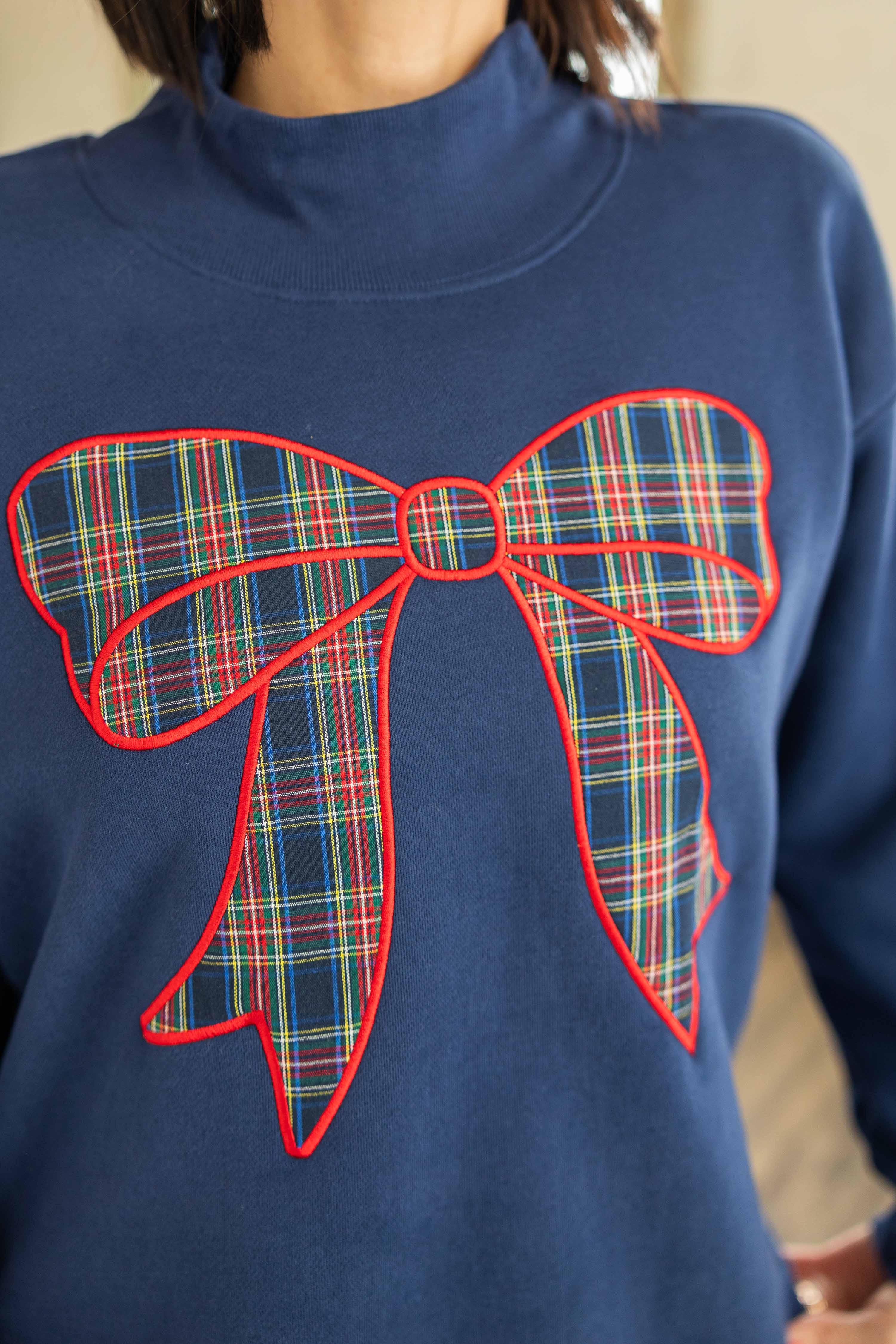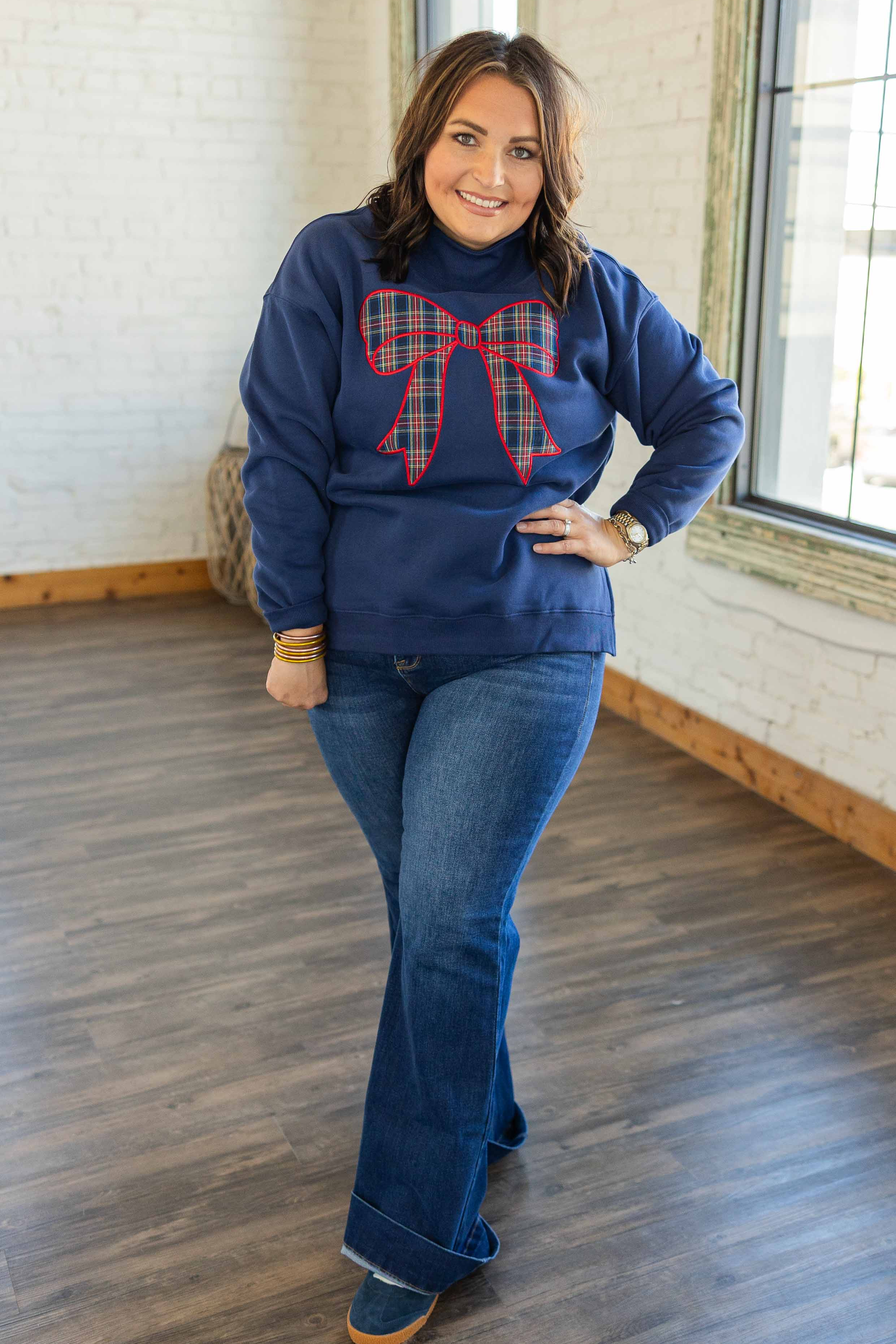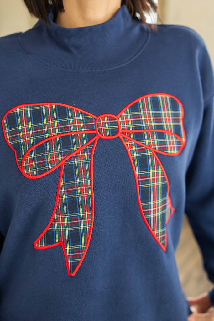 Cute, fun, and festive. This navy sweatshirt features a bold plaid bow applique across the front that brings instant Christmas joy. The mock neck has a small front slit for a polished touch. Oversized fit that is perfect with leggings or jeans. High low hem with side slits for easy movement and comfy layering.