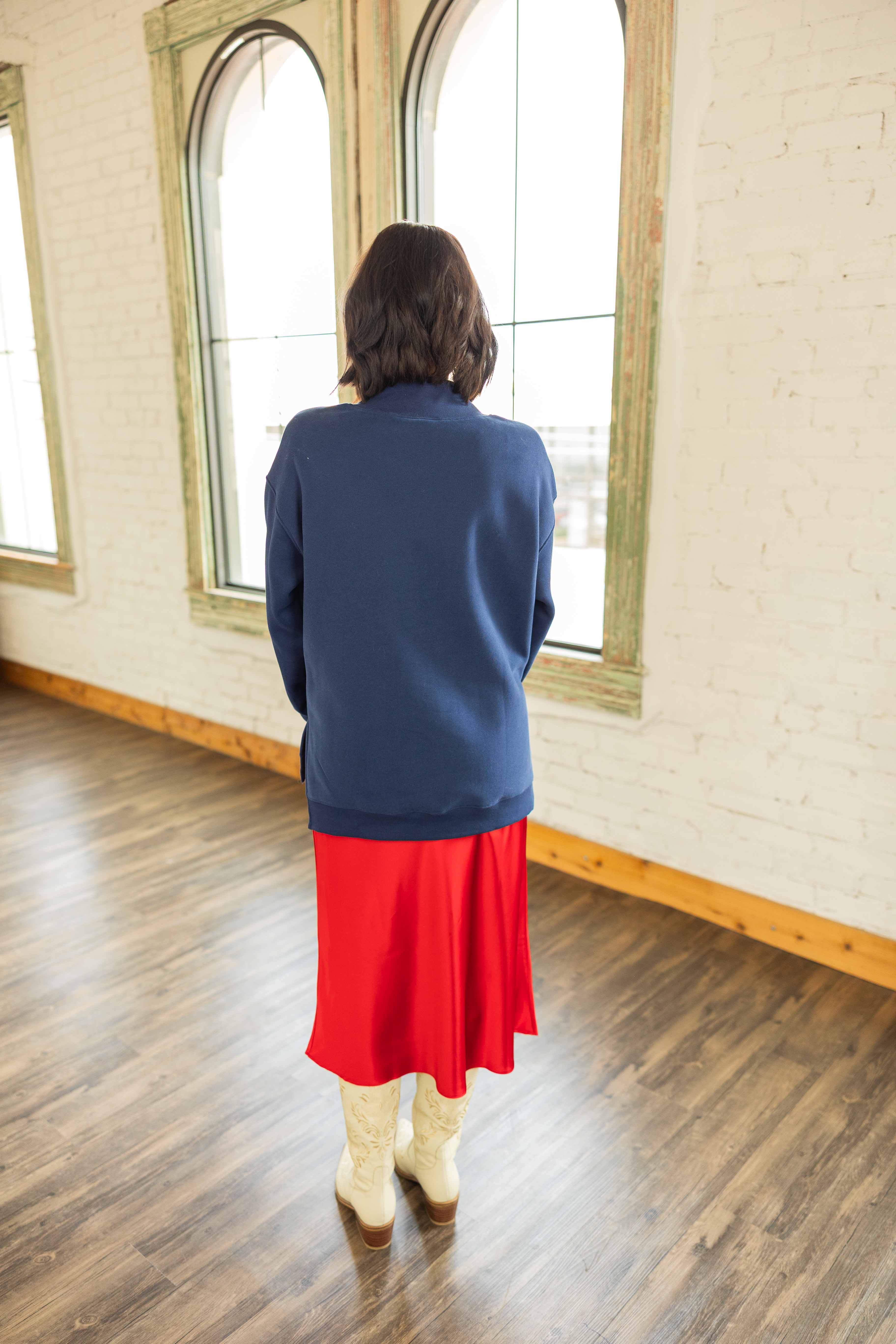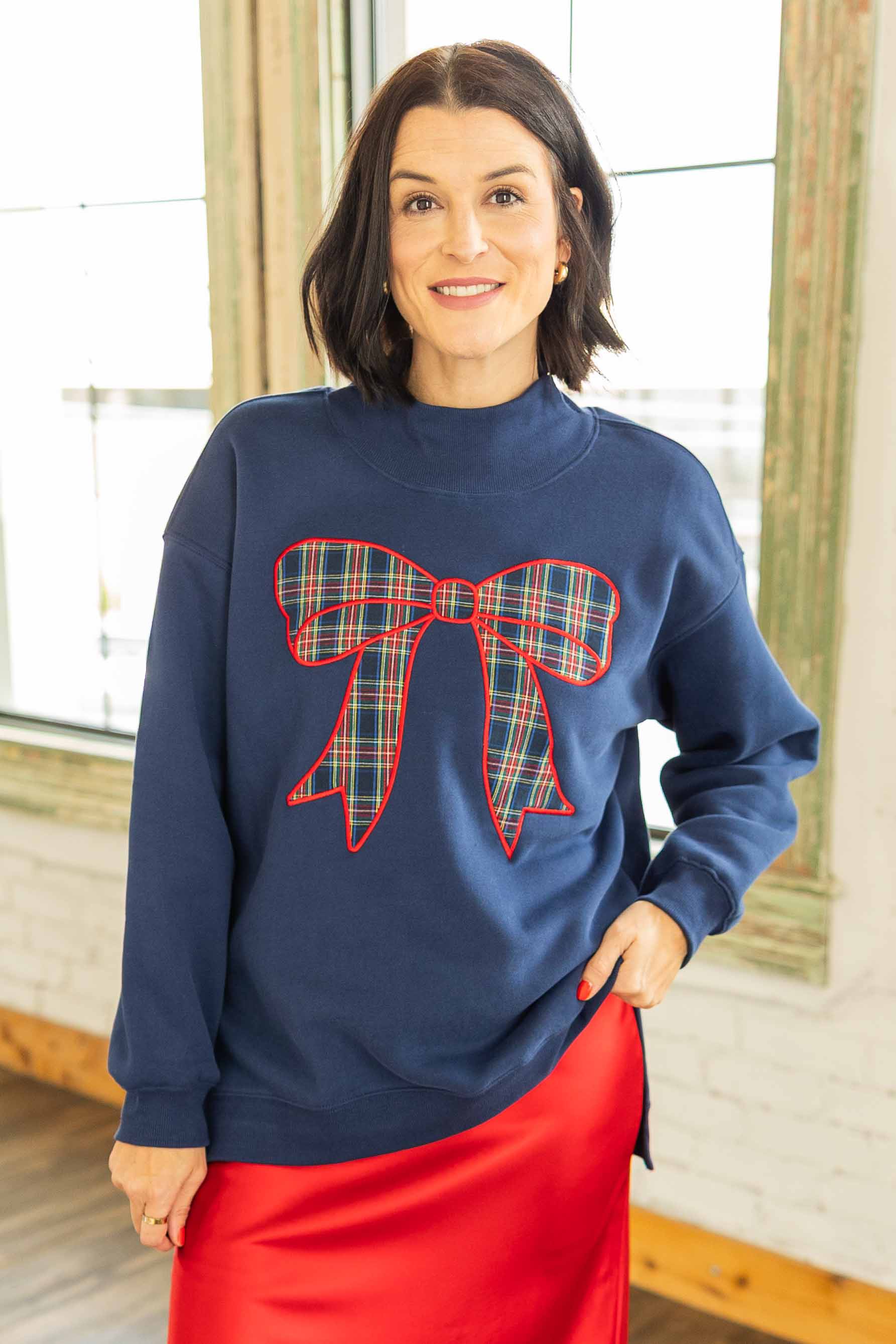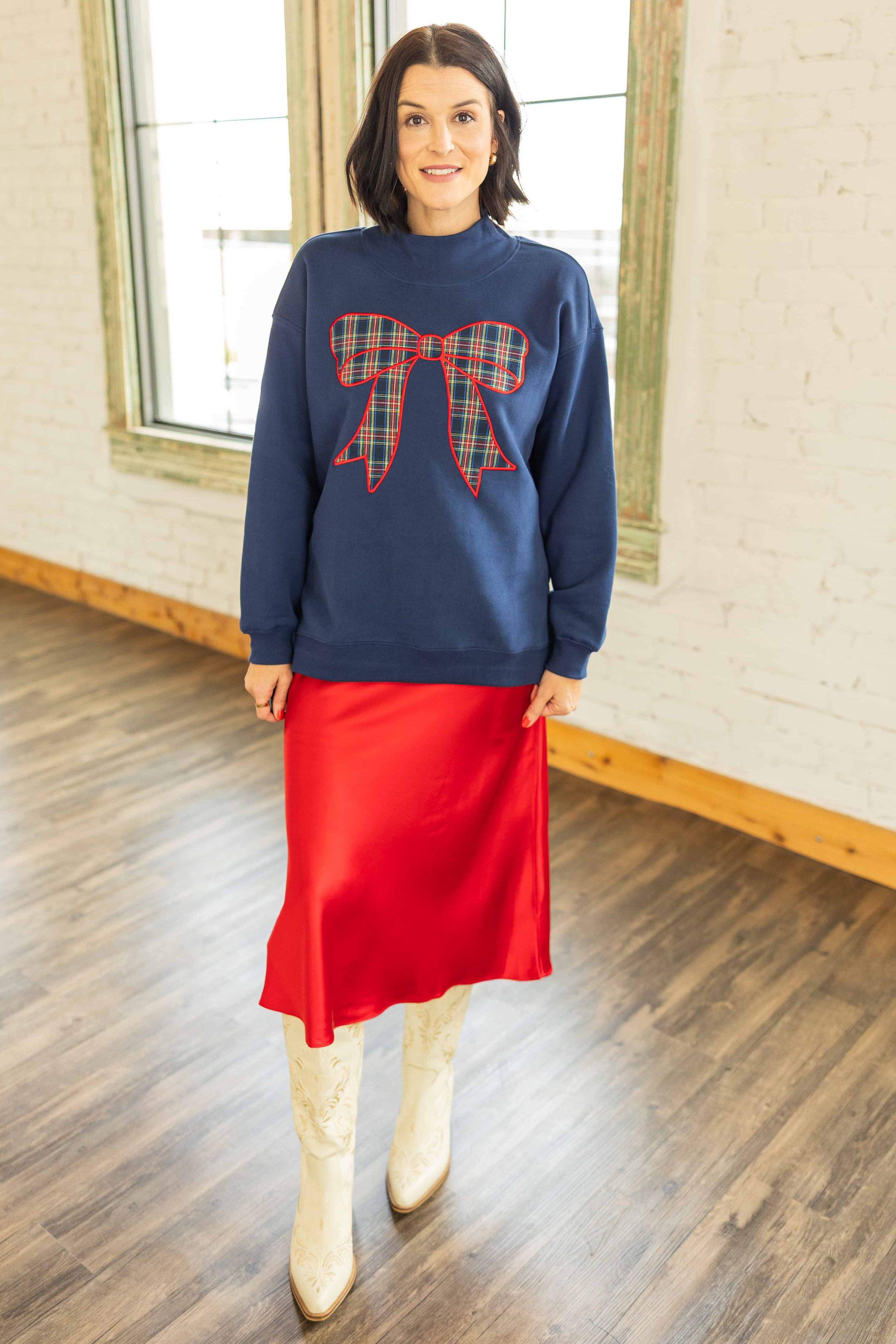 Cute, fun, and festive. This navy sweatshirt features a bold plaid bow applique across the front that brings instant Christmas joy. The mock neck has a small front slit for a polished touch. Oversized fit that is perfect with leggings or jeans. High low hem with side slits for easy movement and comfy layering.