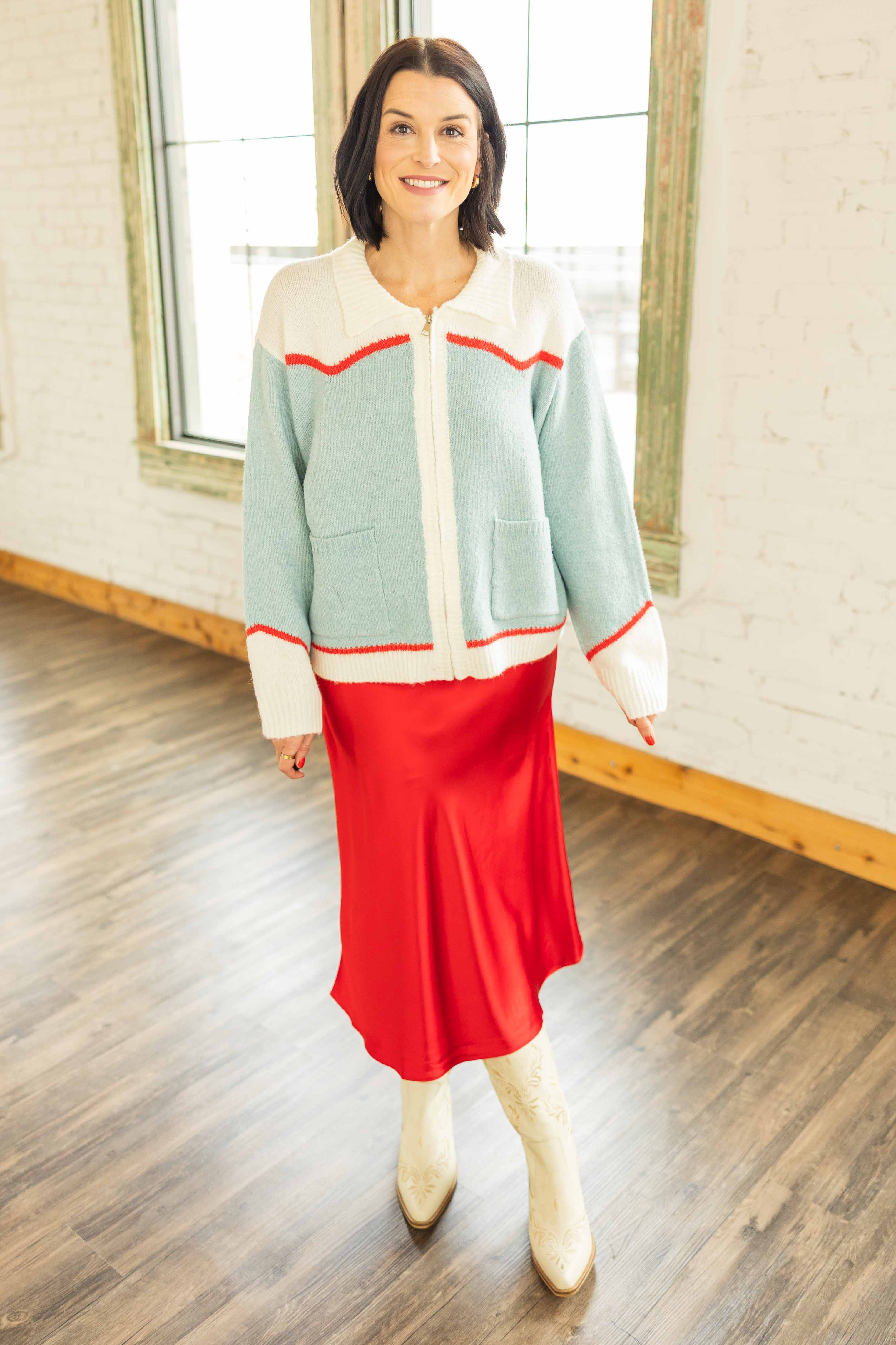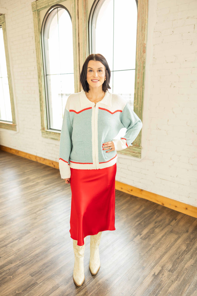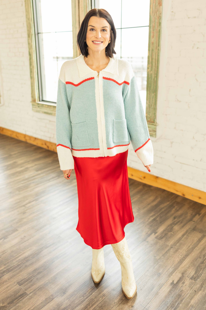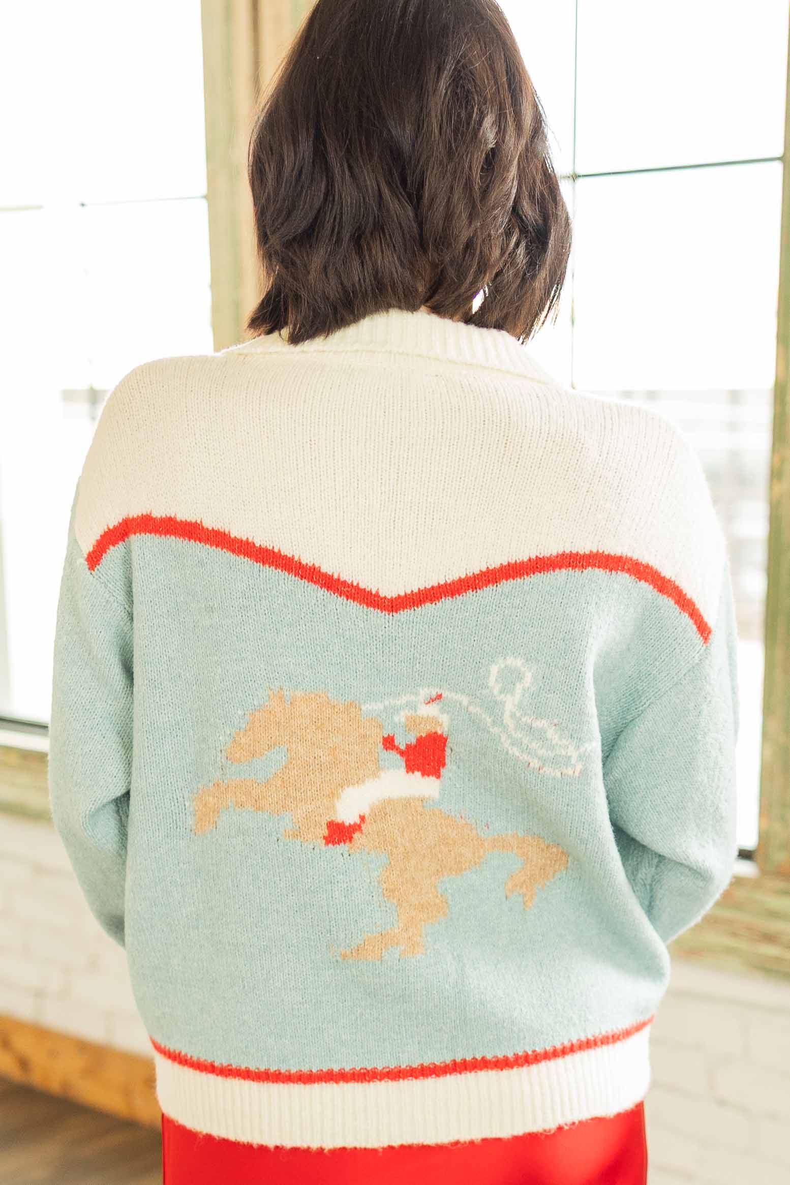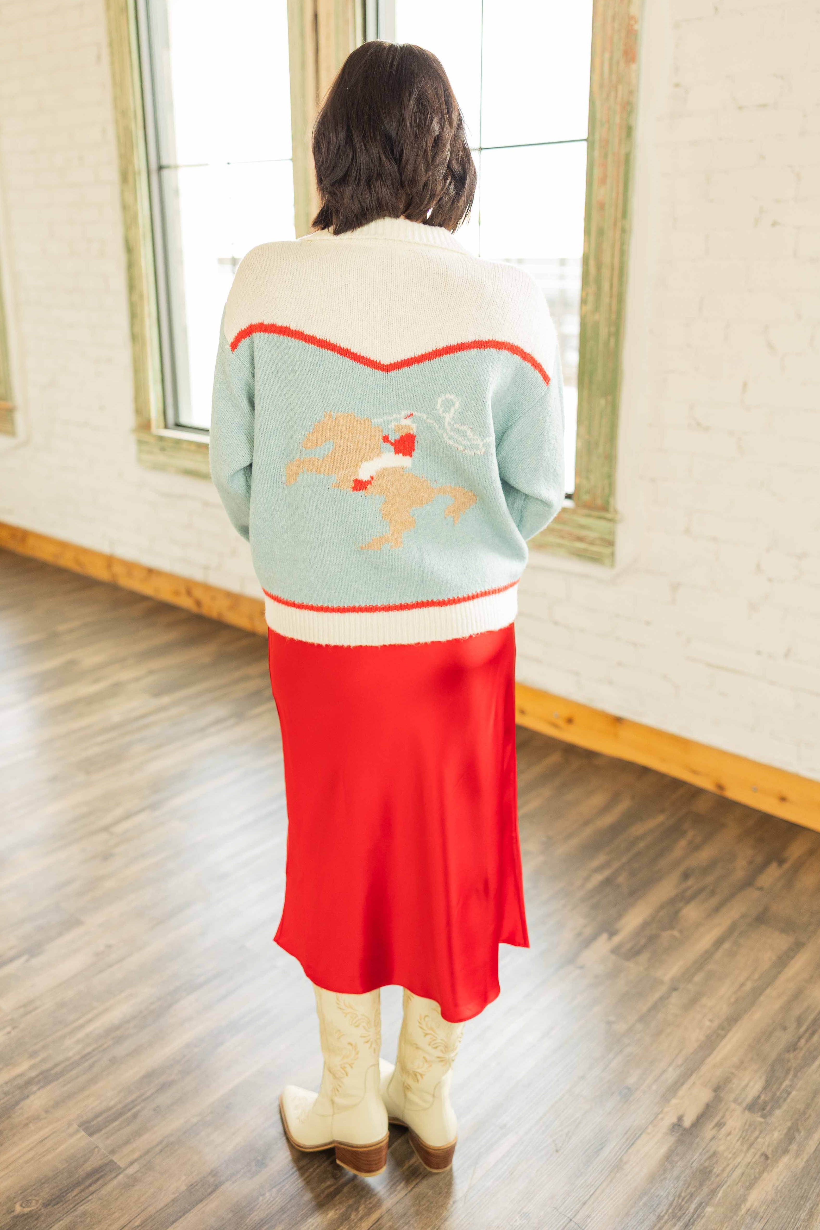 Western holiday vibes are in the house. This cozy zip front sweater has a fun rodeo cowboy knit on the back, complete with a color block yoke that feels festive and country chic. Relaxed fit with drop shoulders for that comfy look. Front pockets keep your hands warm or hold your phone while you two step through the season.