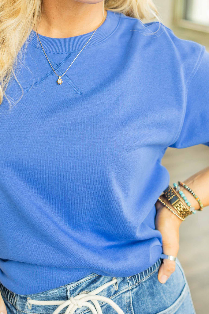 You know that one tee you always reach for when you want to look cute and feel comfy? Yeah—this is her. The Julietta Top is made in a dreamy, midweight French terry knit that feels like a cozy hug without looking like you just rolled out of bed. The vibrant periwinkle blue adds a cheerful pop of color, while the stitched cuff sleeves give it just enough polish to fool people into thinking you put effort in (shhh, we won’t tell). No patterns, no frills—just soft texture, a flattering relaxed fit, and a whole lot of wear-anywhere magic.
