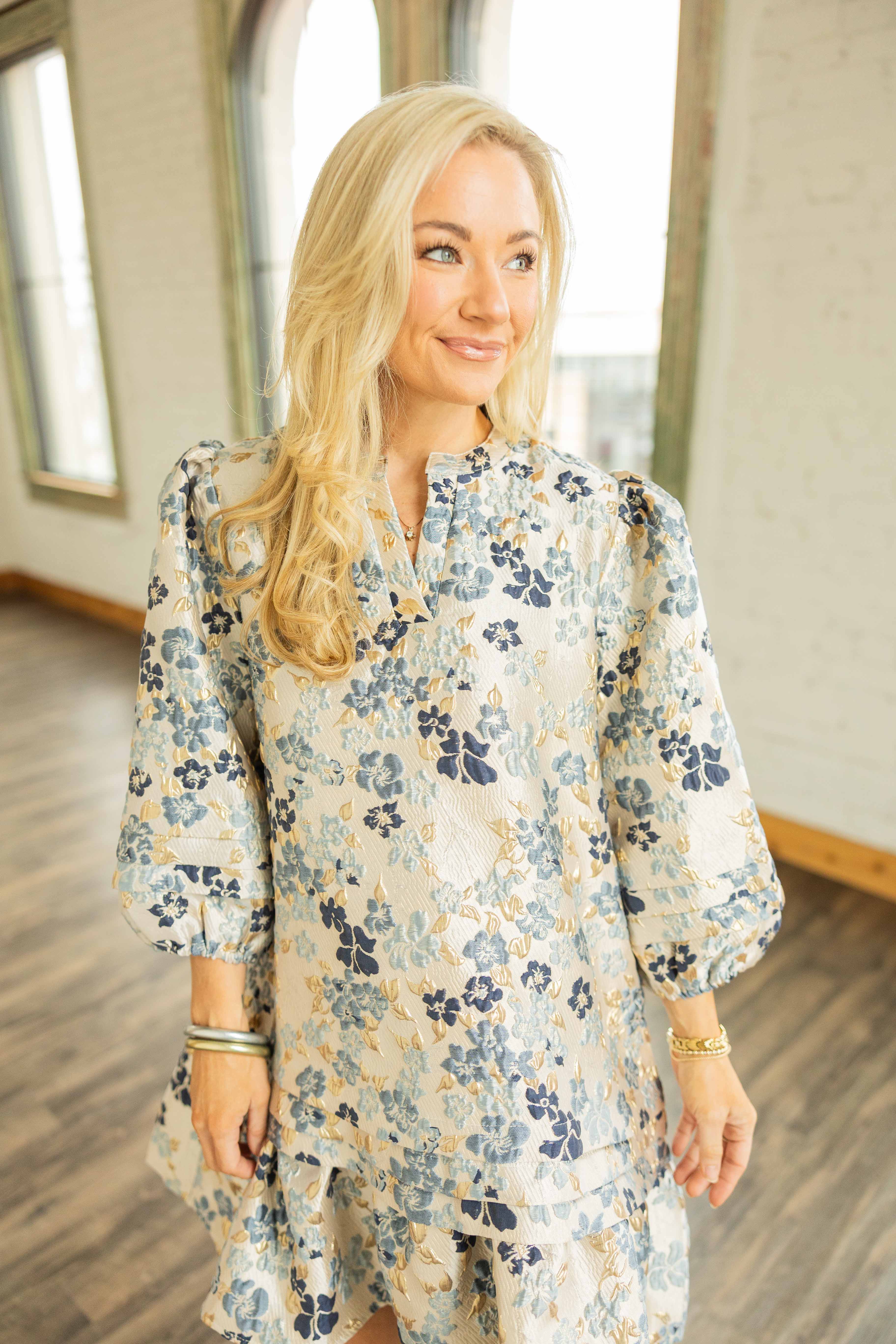 Soft shimmer meets easy comfort. This metallic textured floral print mixes light blue, navy and gold tones for a polished look that still feels playful. The roomy fit keeps it breezy. The 3/4 elastic sleeves give it shape. The V neckline feels clean. The pockets are a win. The pull over style keeps it simple and stress free.
