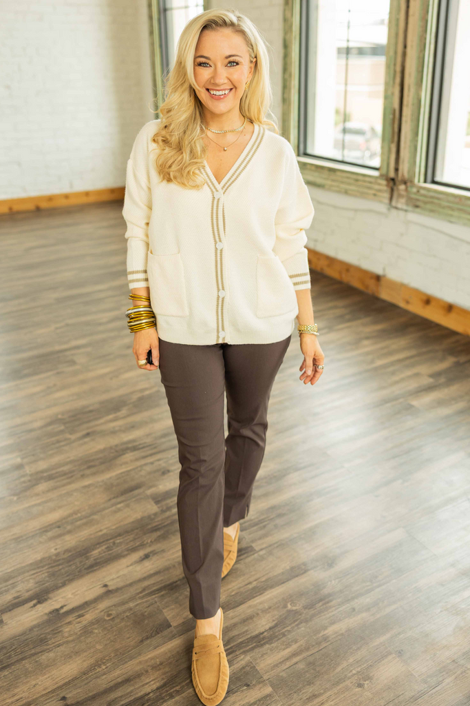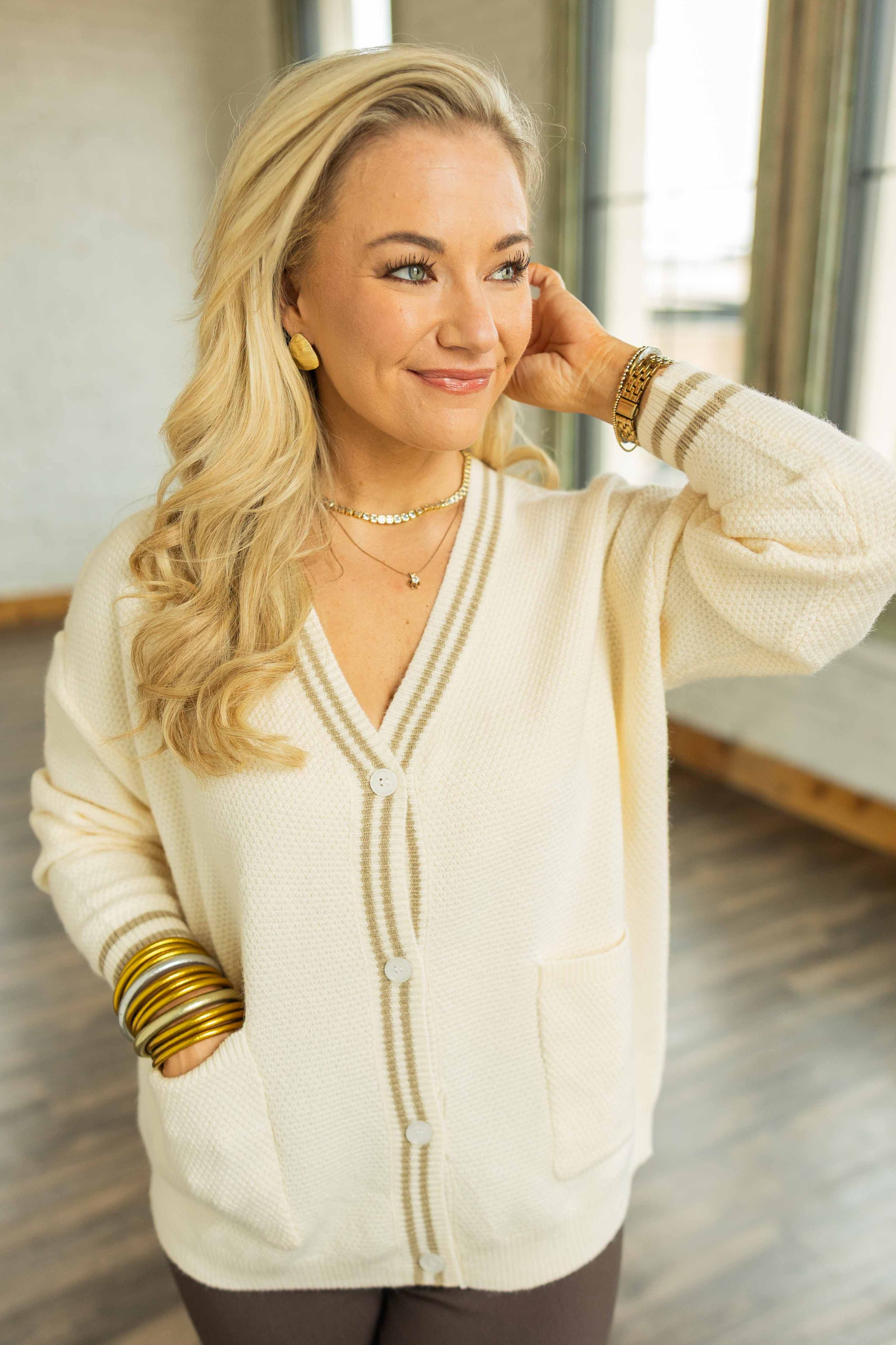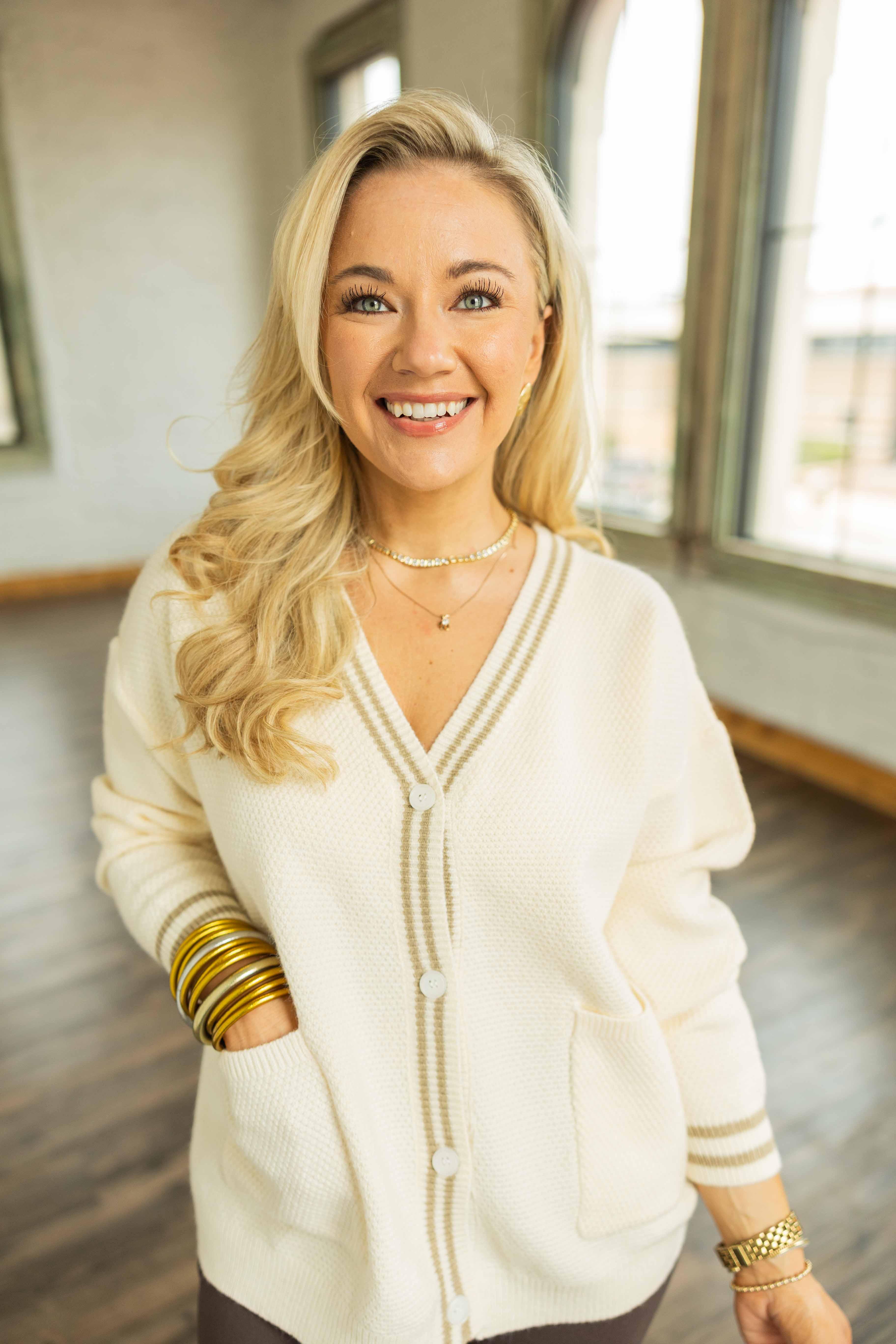 Soft, slouchy, and just structured enough—this button-down cardigan is what cozy dreams are made of. The creamy knit and sporty contrast trim make it feel preppy without trying too hard. Finished with pockets (because obviously) and functional buttons so you can style it open or closed.