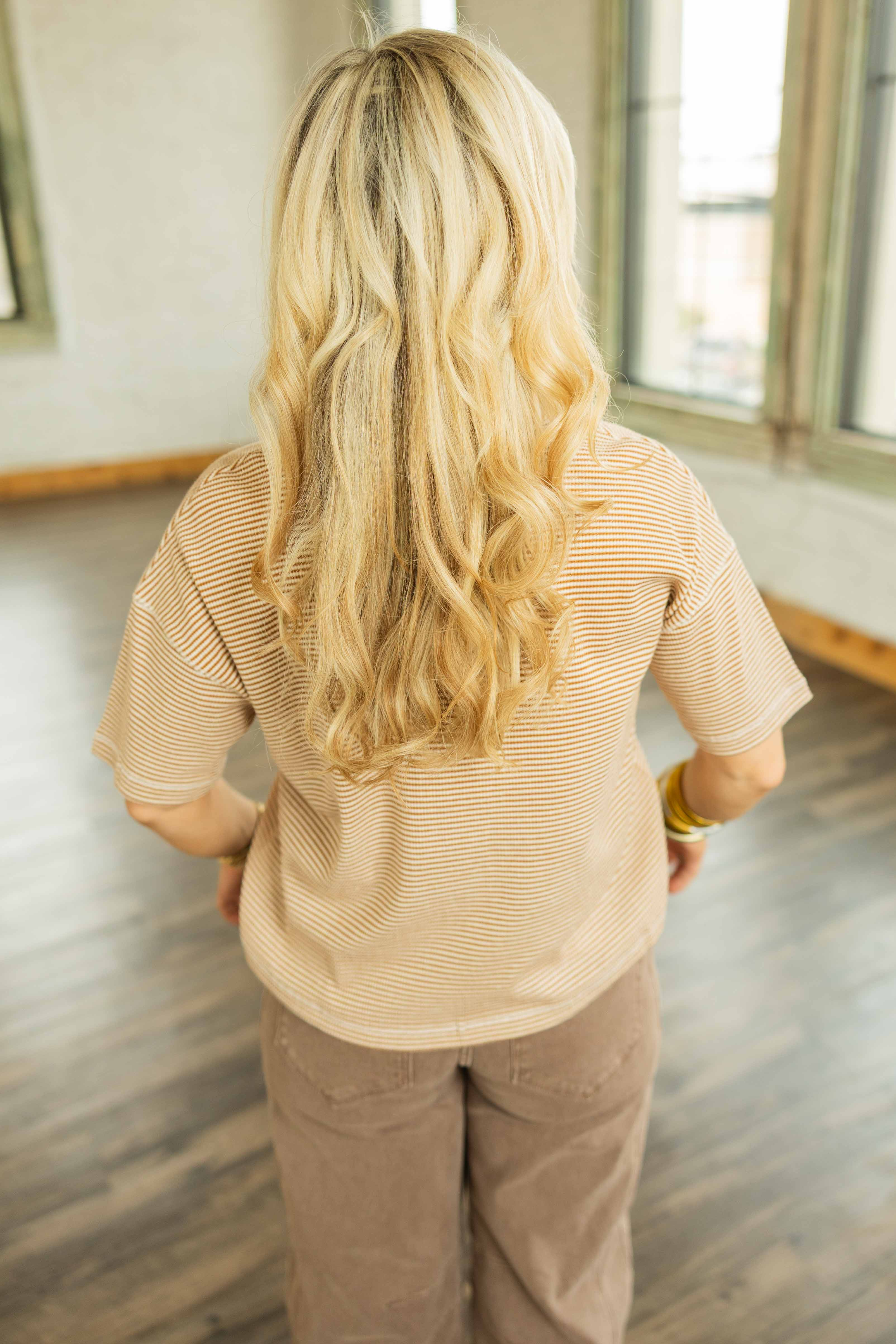 Your new "throw on and go" bestie. The Estella Striped Everyday Boxy Top features soft camel and white micro stripes in a super breathable knit that feels like your favorite lived-in tee. With its roomy, slightly cropped silhouette and that effortless drape, it’s basically begging to be paired with wide leg denim, your go-to sneakers, and a large iced coffee. A classic neutral palette with an easy, timeless vibe—we’re obsessed.