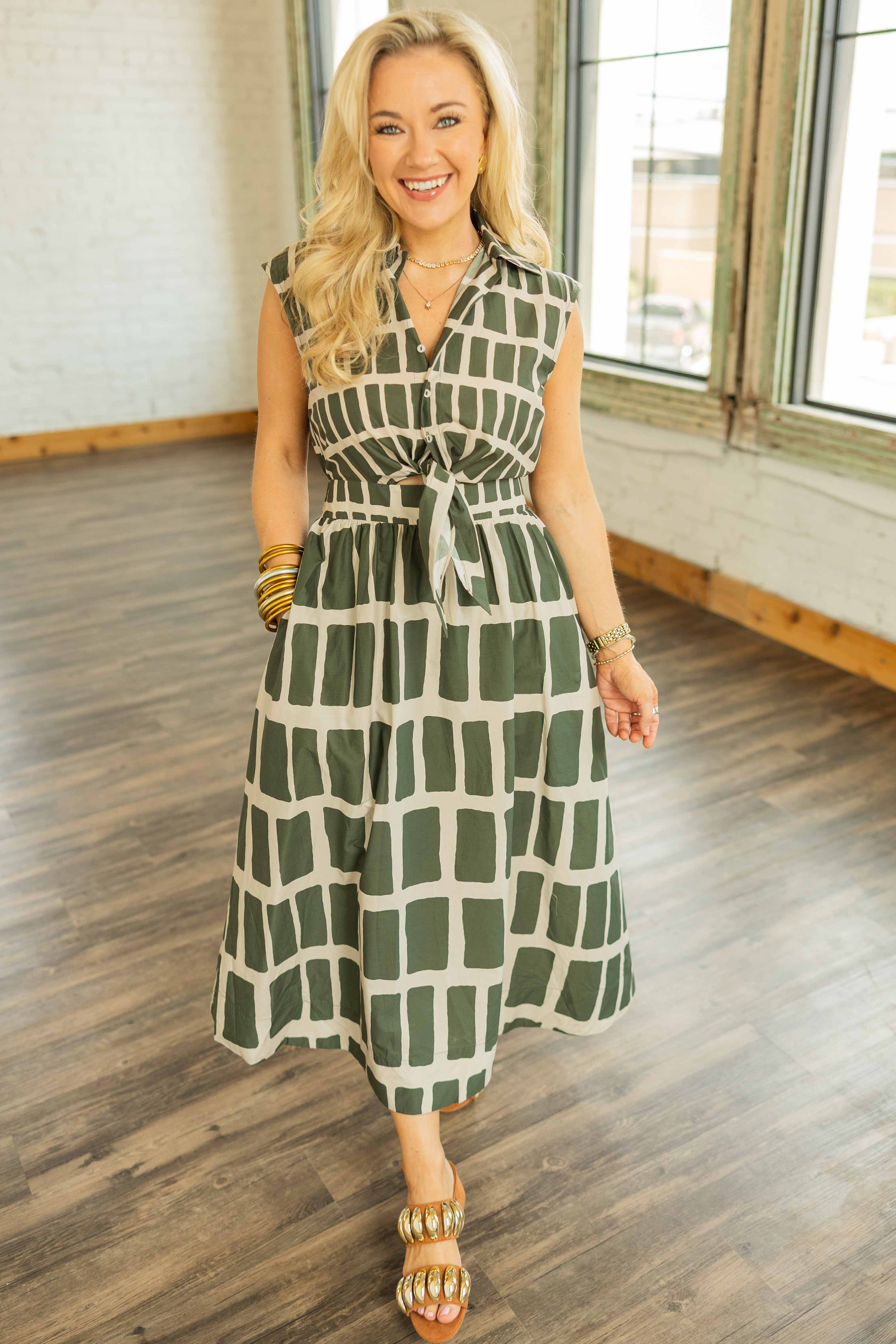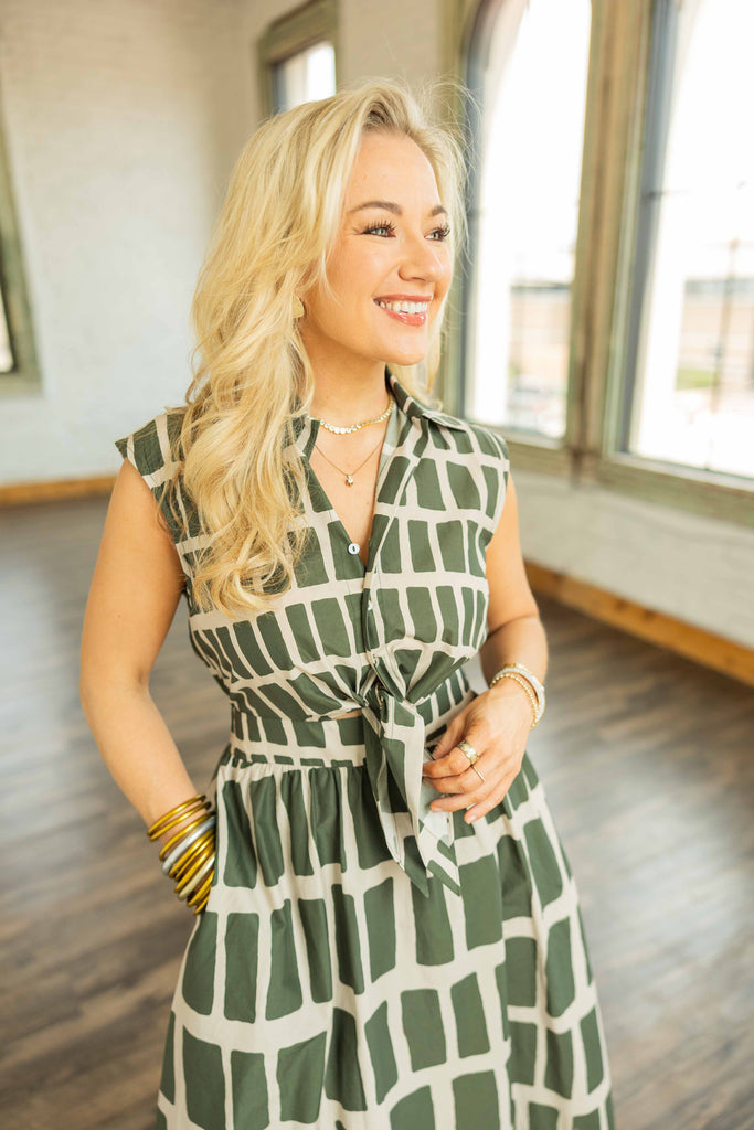 She’s giving effortlessly artsy—and somehow also incredibly put-together. The Marleigh Dress features a striking geometric print, a collared neckline, and a knotted tie front that cinches you in just right. The smocked waistband in the back adds comfort (hello, stretch!) while the midi length keeps things polished. Pair her with slides, boots, or sneakers—she’s ready for whatever.
