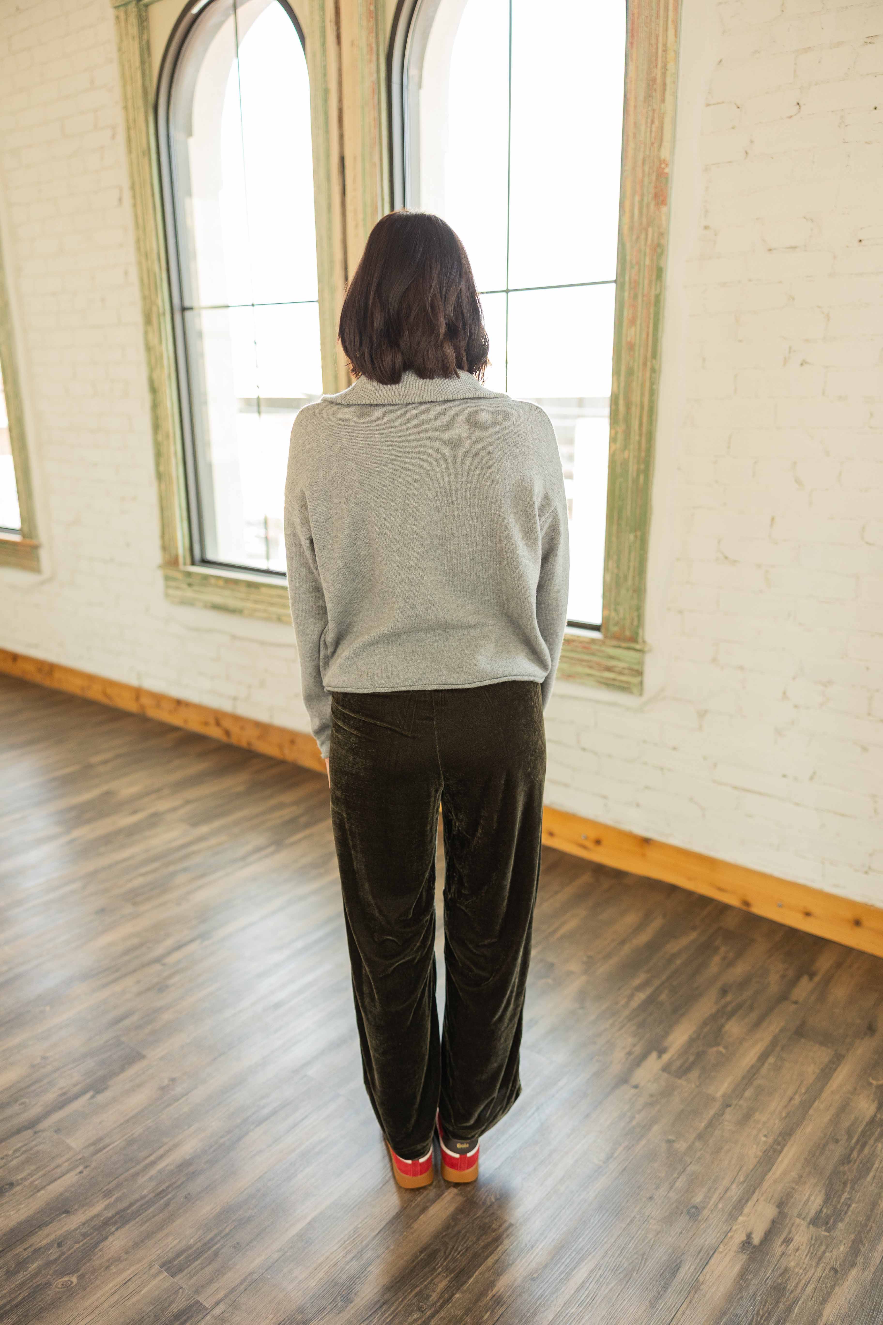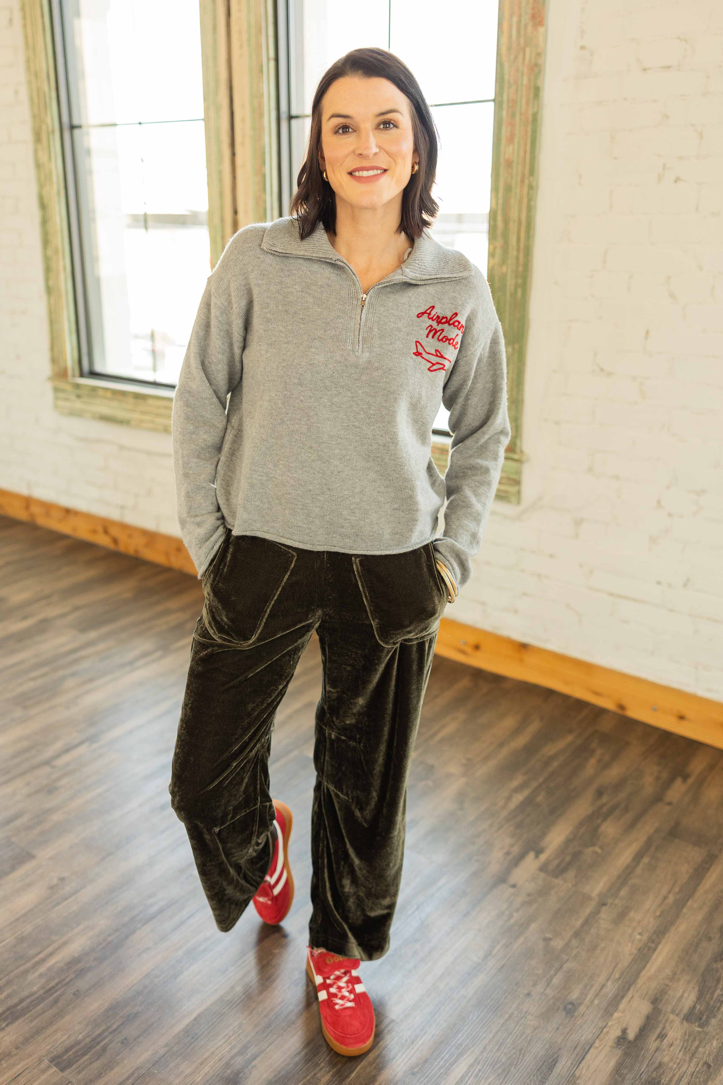 Slip into travel mode. This heather gray quarter zip pullover gives soft cozy vibes with festive red embroidery that pops. Relaxed cropped fit that sits just right with your high rise denim or wide leg pants. Ultra soft knit keeps you comfy for chilly airports and lazy holiday weekends. Color is heather gray with bright red embroidered detailing.