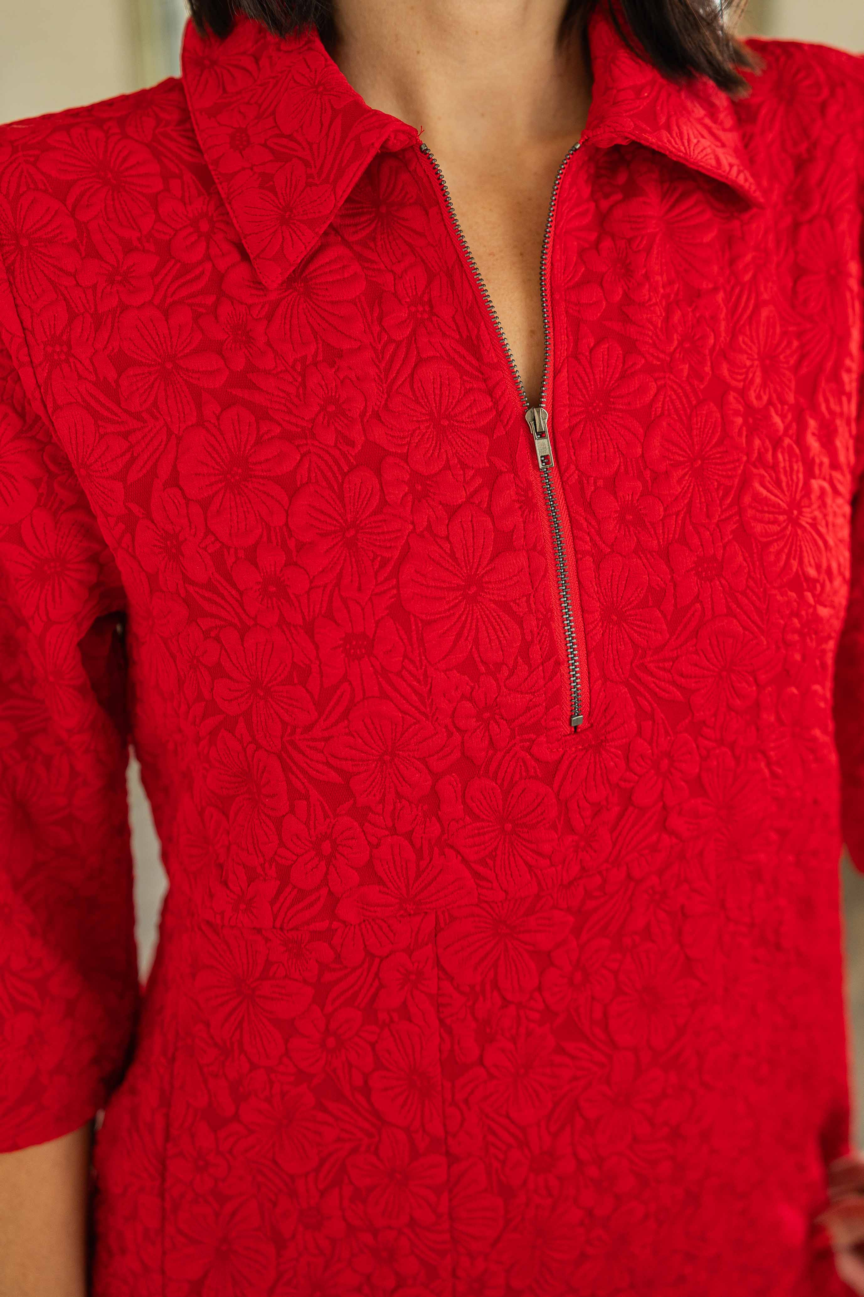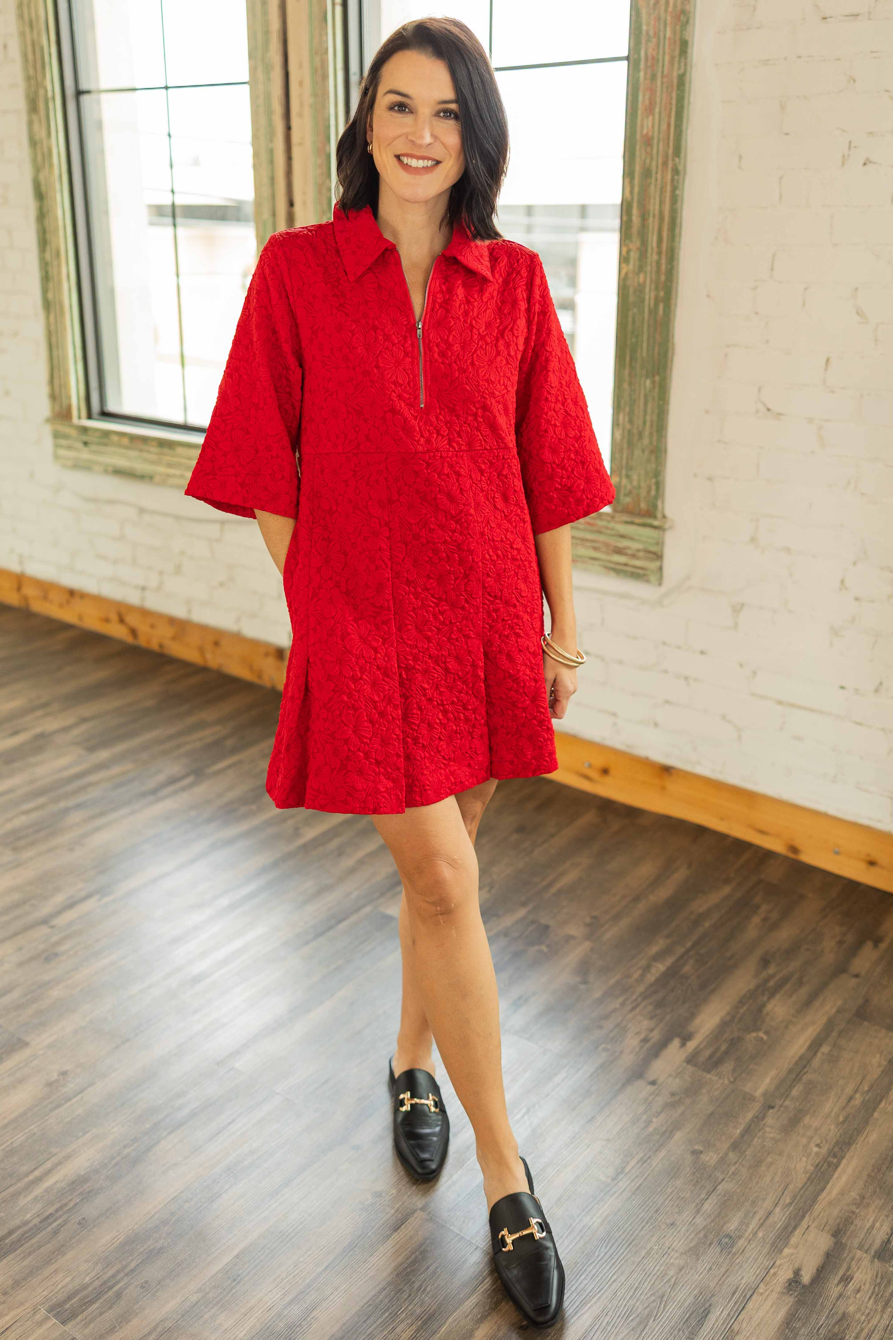 This red jacquard mini is holiday cheer in dress form. The textured fabric feels elevated. The half zip and collared neckline keep it modern. The flare silhouette is flattering and easy. Pockets for your lip gloss and candy canes. The bright red color is ready for every festive moment.
