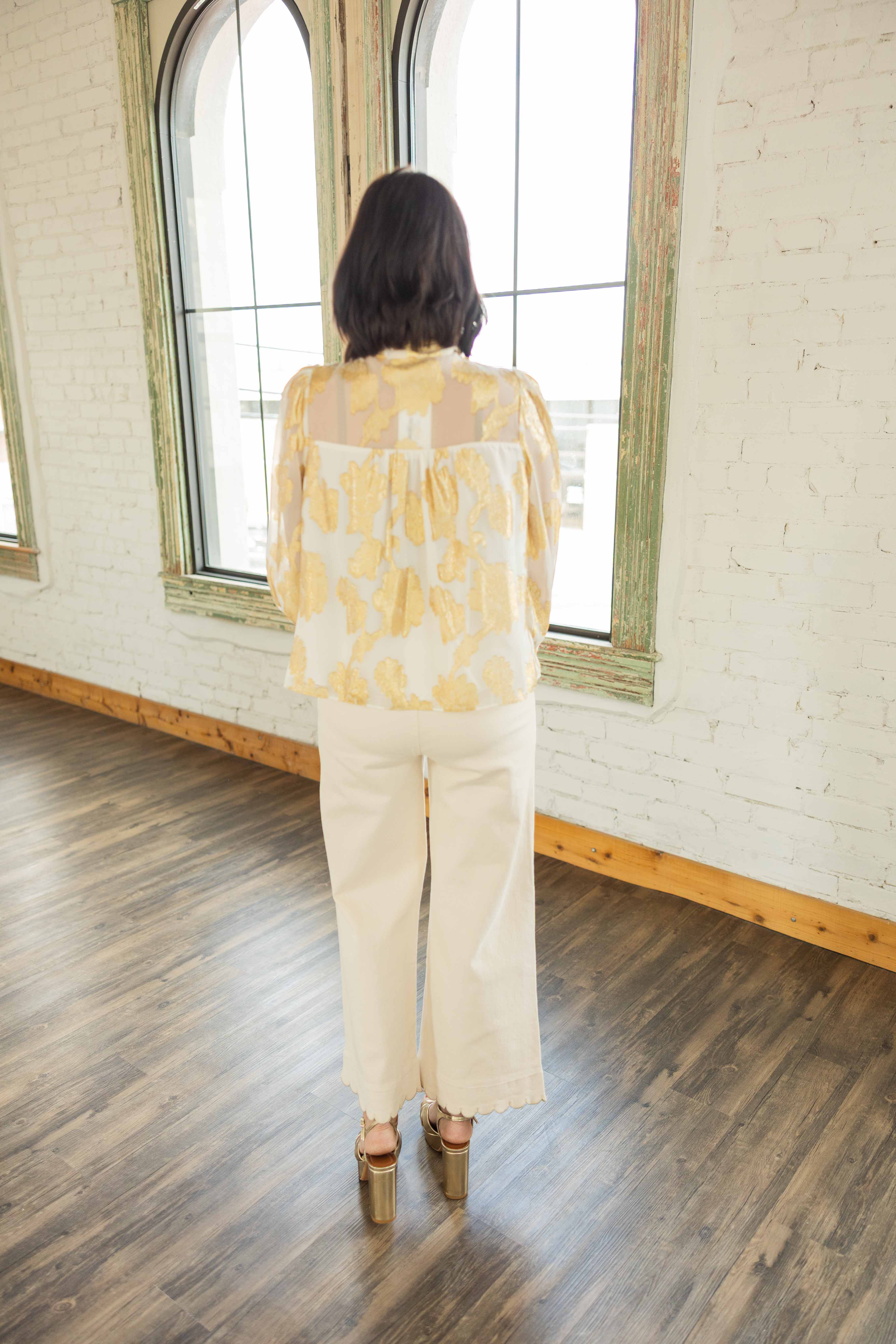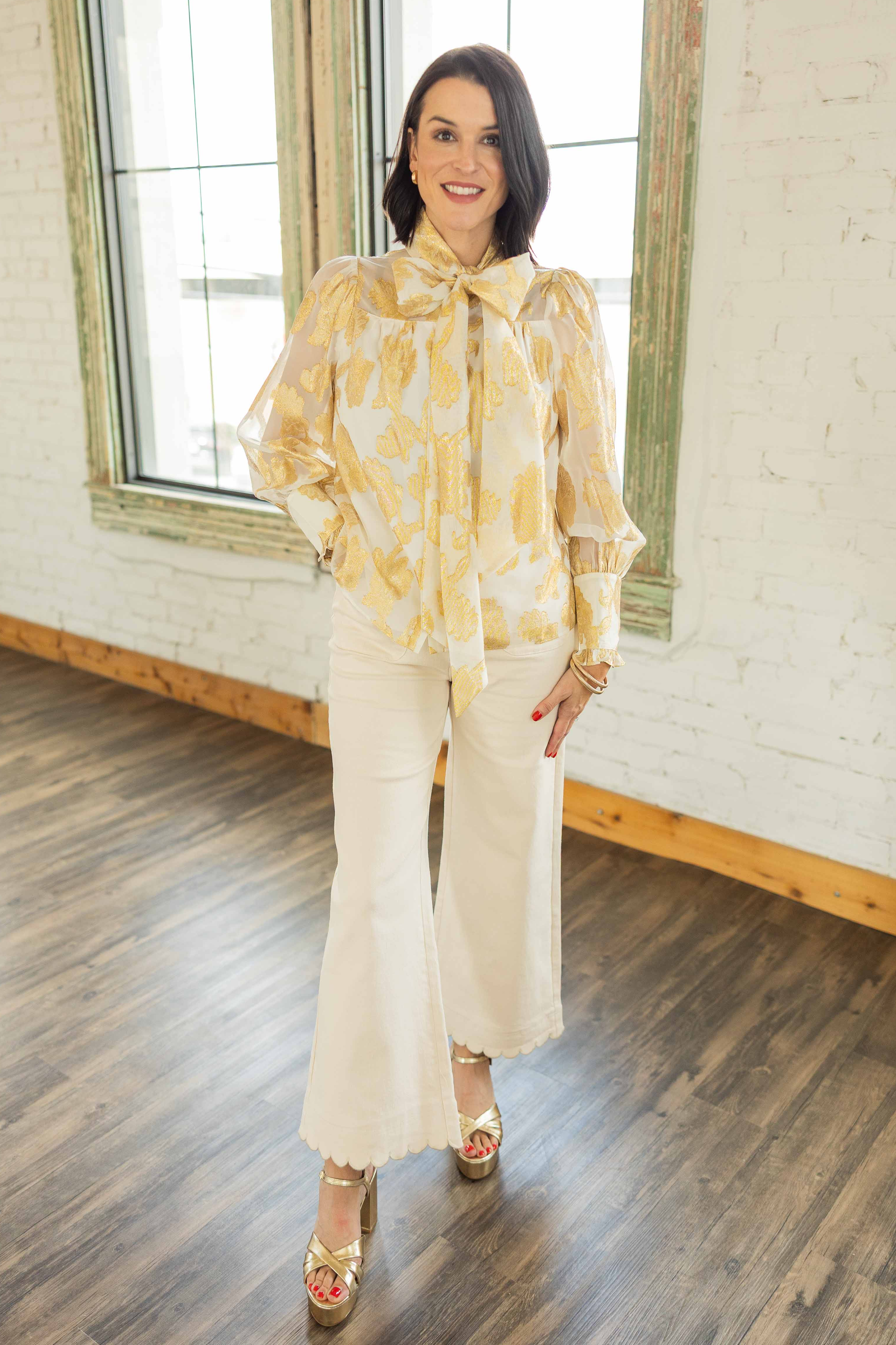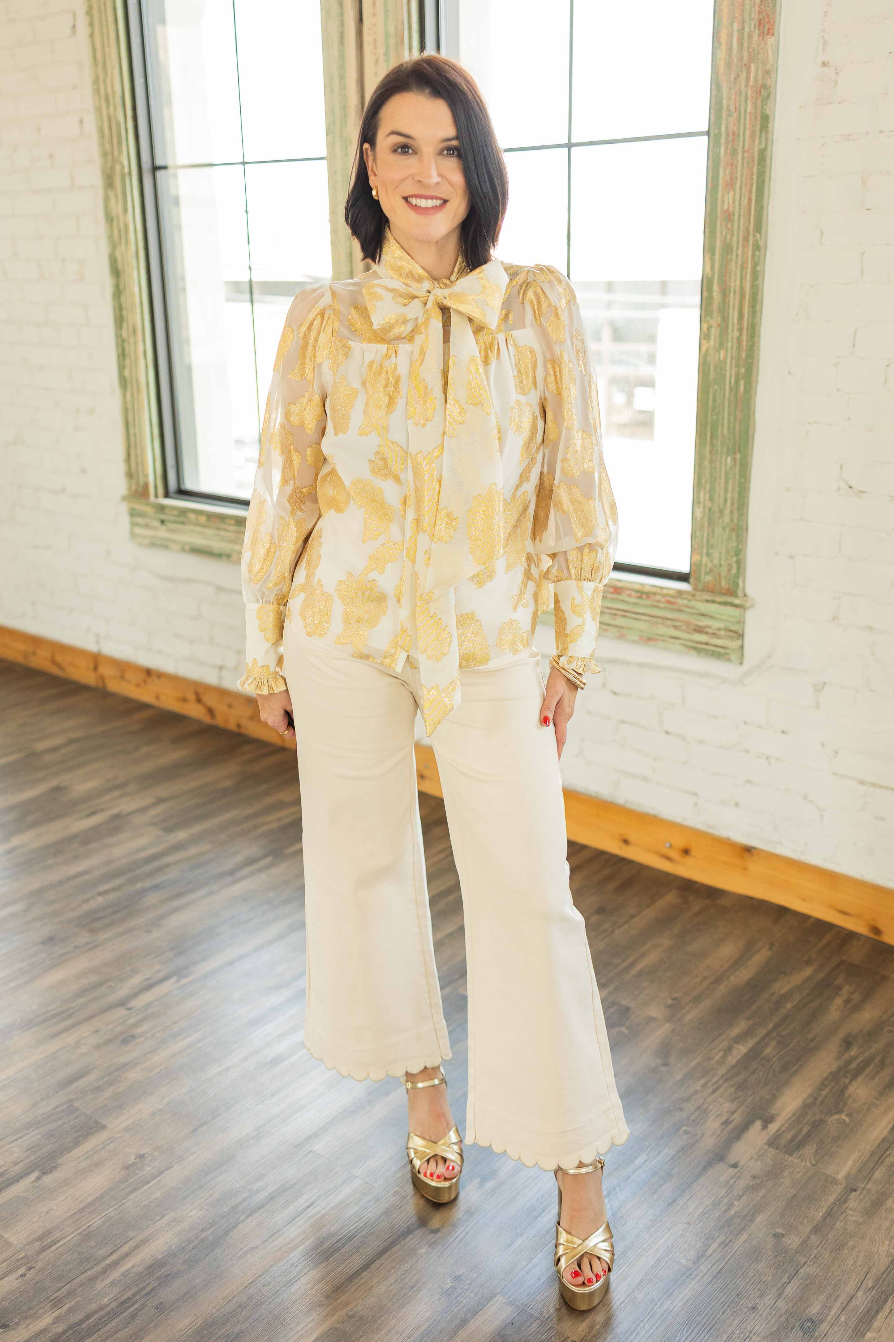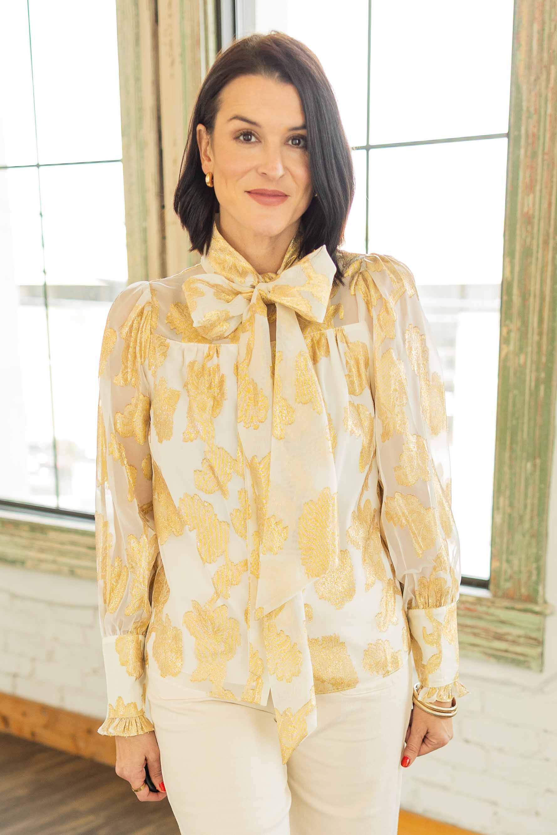 Holiday glam has entered the chat. Angelica shines with gold metallic jacquard florals on a soft chiffon base. That dramatic bow tie neckline gives instant elegance. The sleeves have a little volume for extra drama. Fully lined through the body so you can sparkle comfortably.