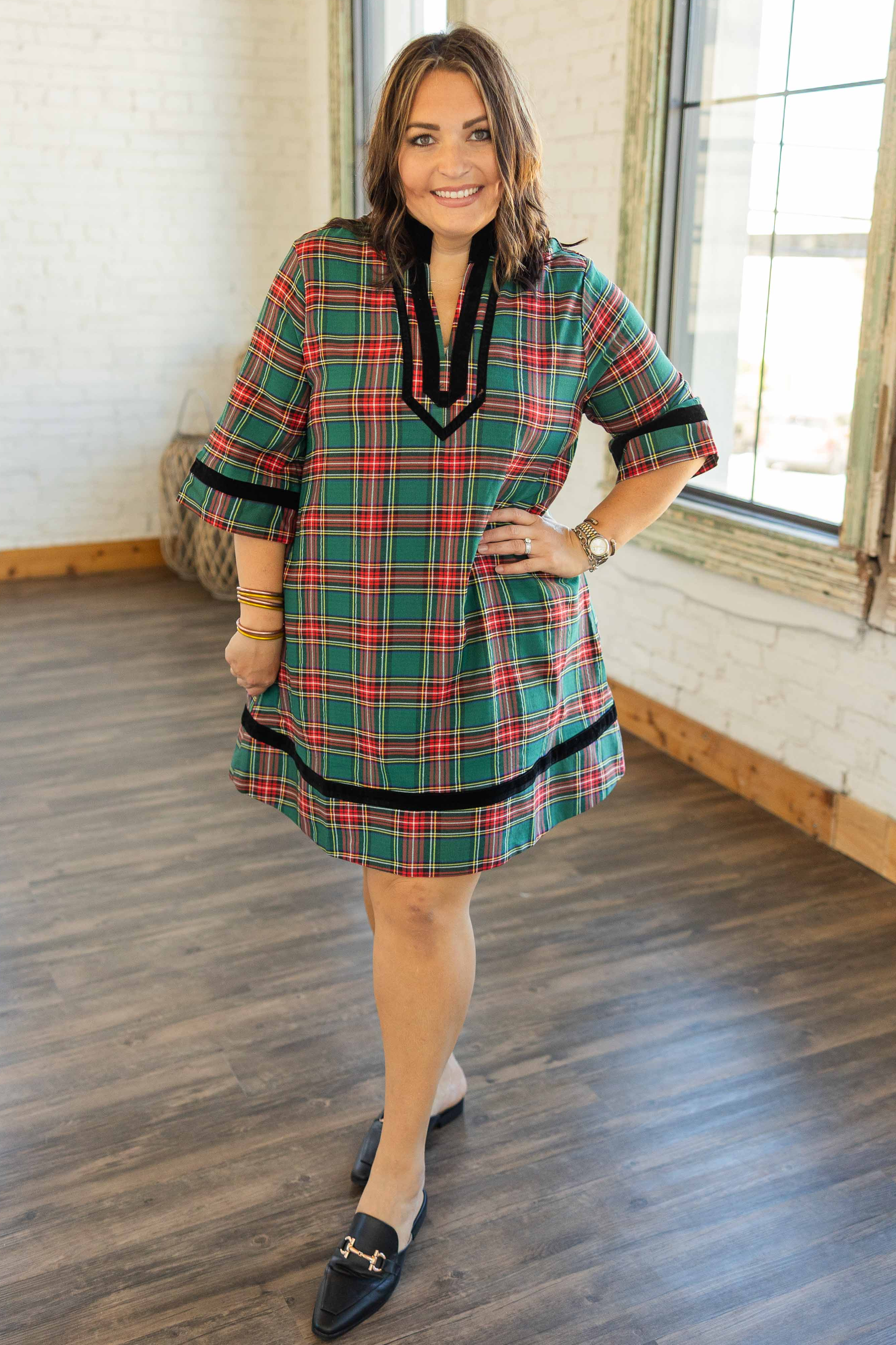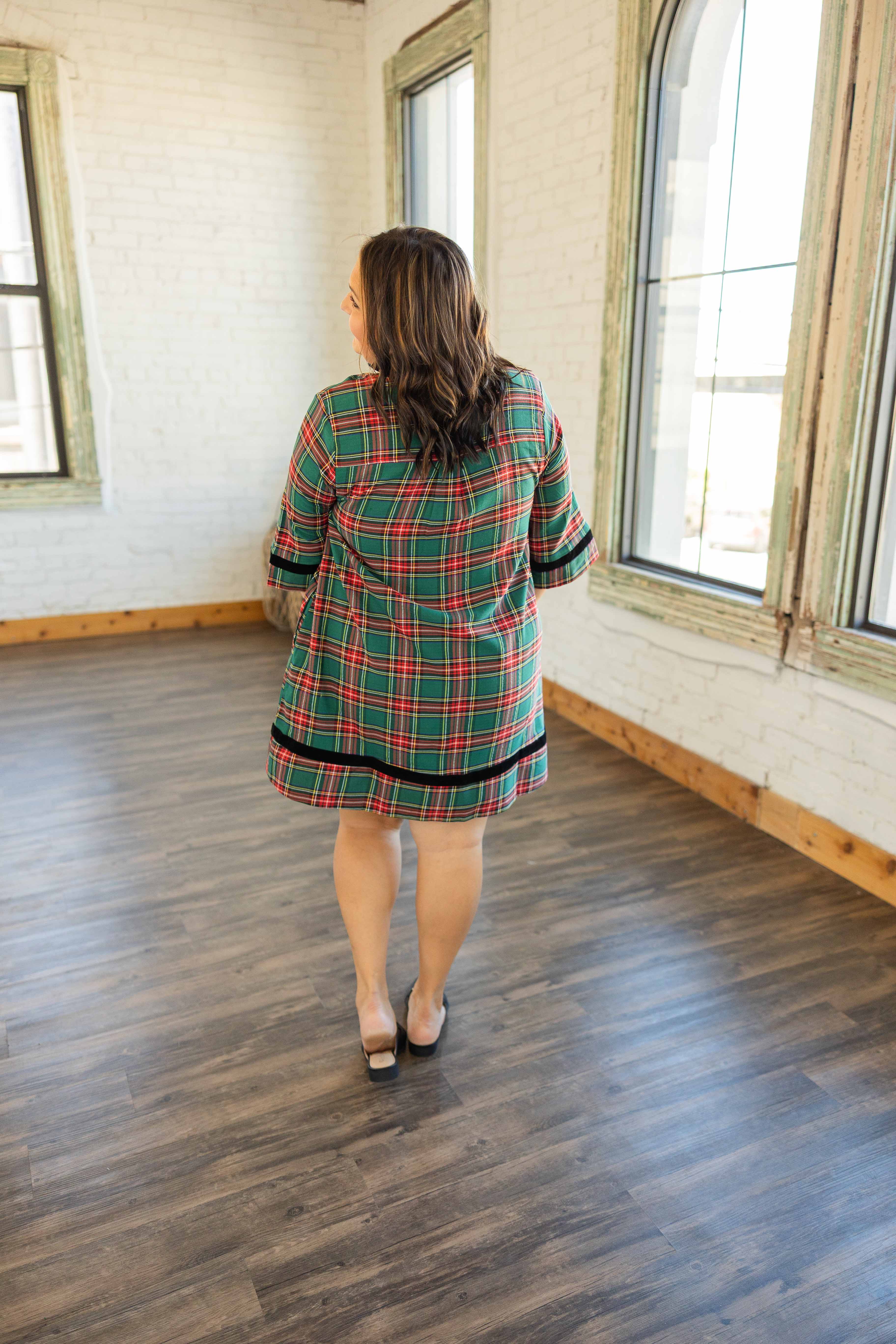 JACQUELINE PLUS PLAID TUNIC DRESS WITH VELVET TRIM