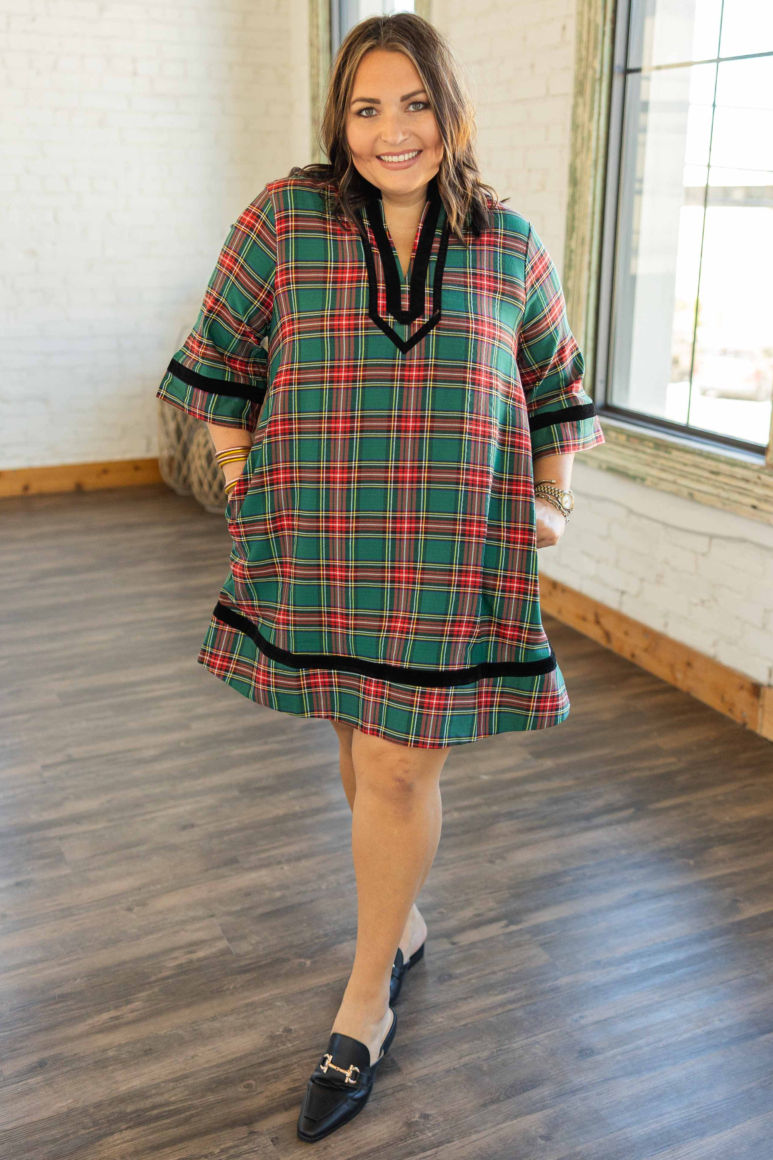 Holiday plaid with a little luxury. The roomy tunic silhouette keeps things comfortable. The black velvet trim frames the neckline, sleeves and hem for a polished finish. Pockets make it practical. The green and red color combo feels festive without going overboard.
