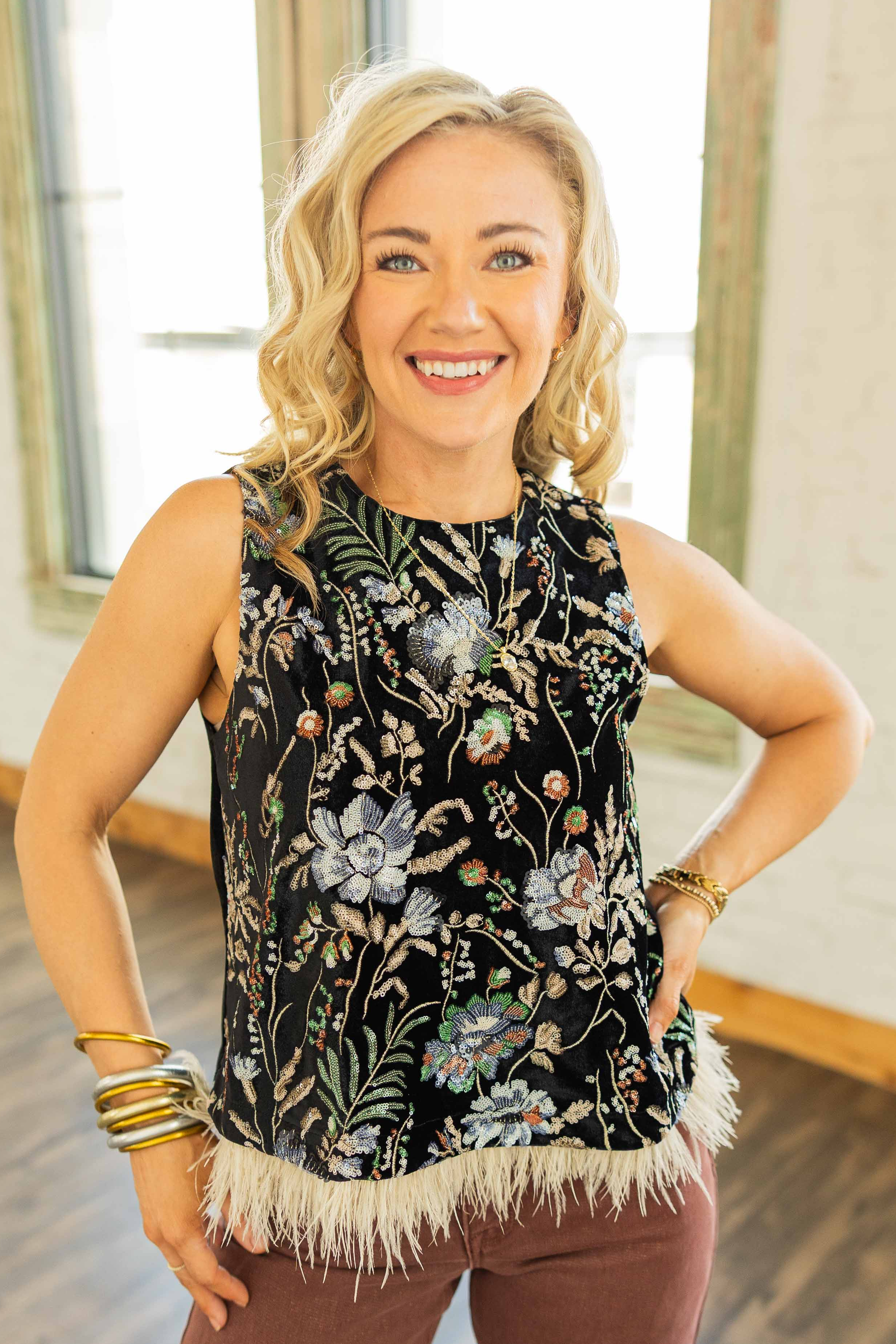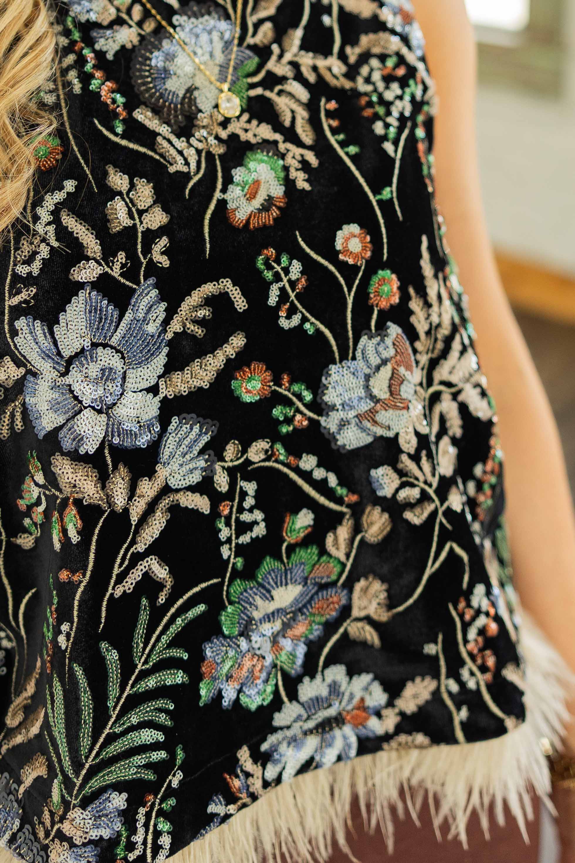 This top knows how to make an entrance. Black velvet base with sparkling sequin embroidery and a soft feather trim that moves with you. Sleeveless design with a clean silhouette that feels festive without trying too hard. Zipper closure in the back keeps the look polished and easy.