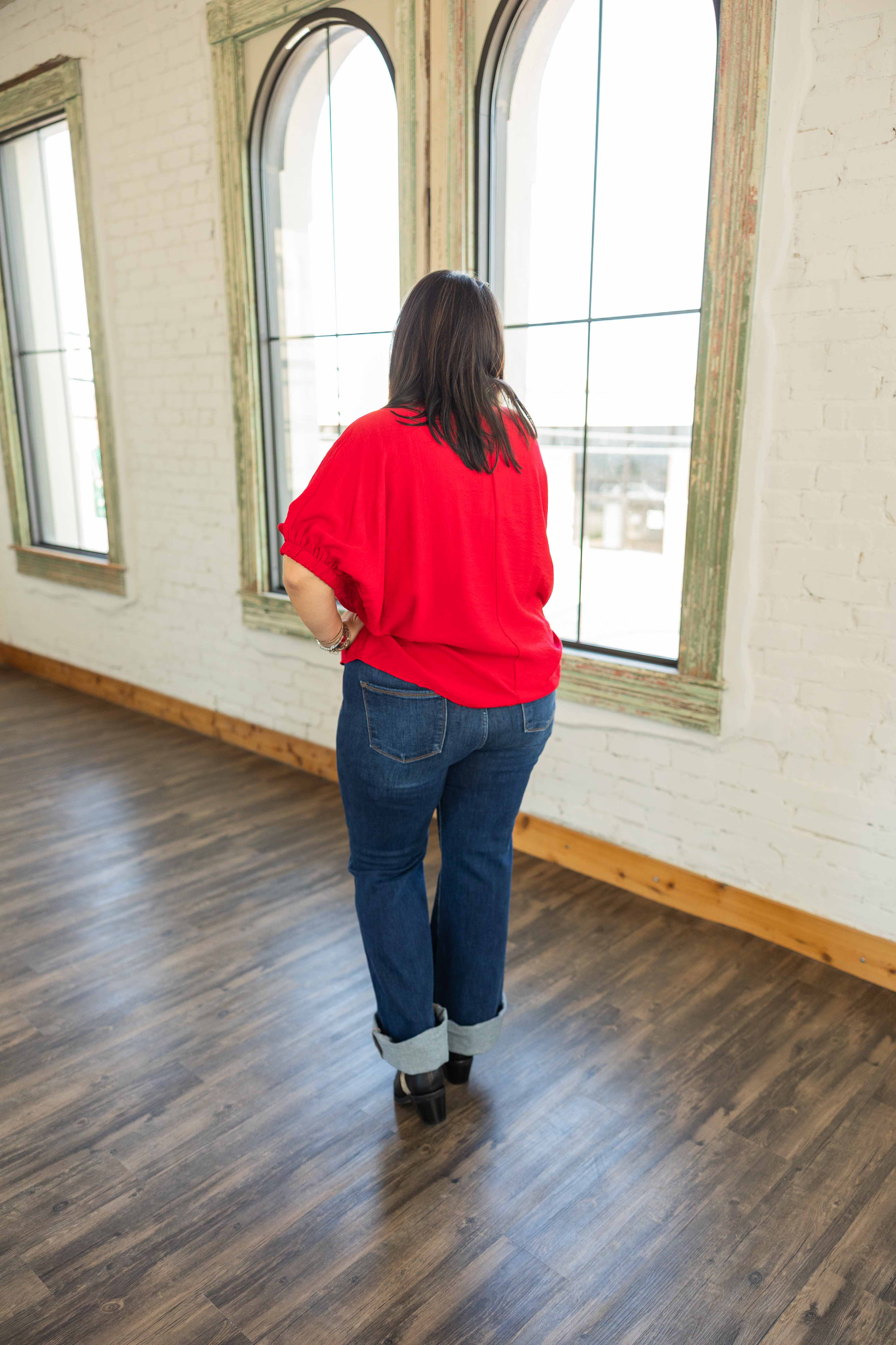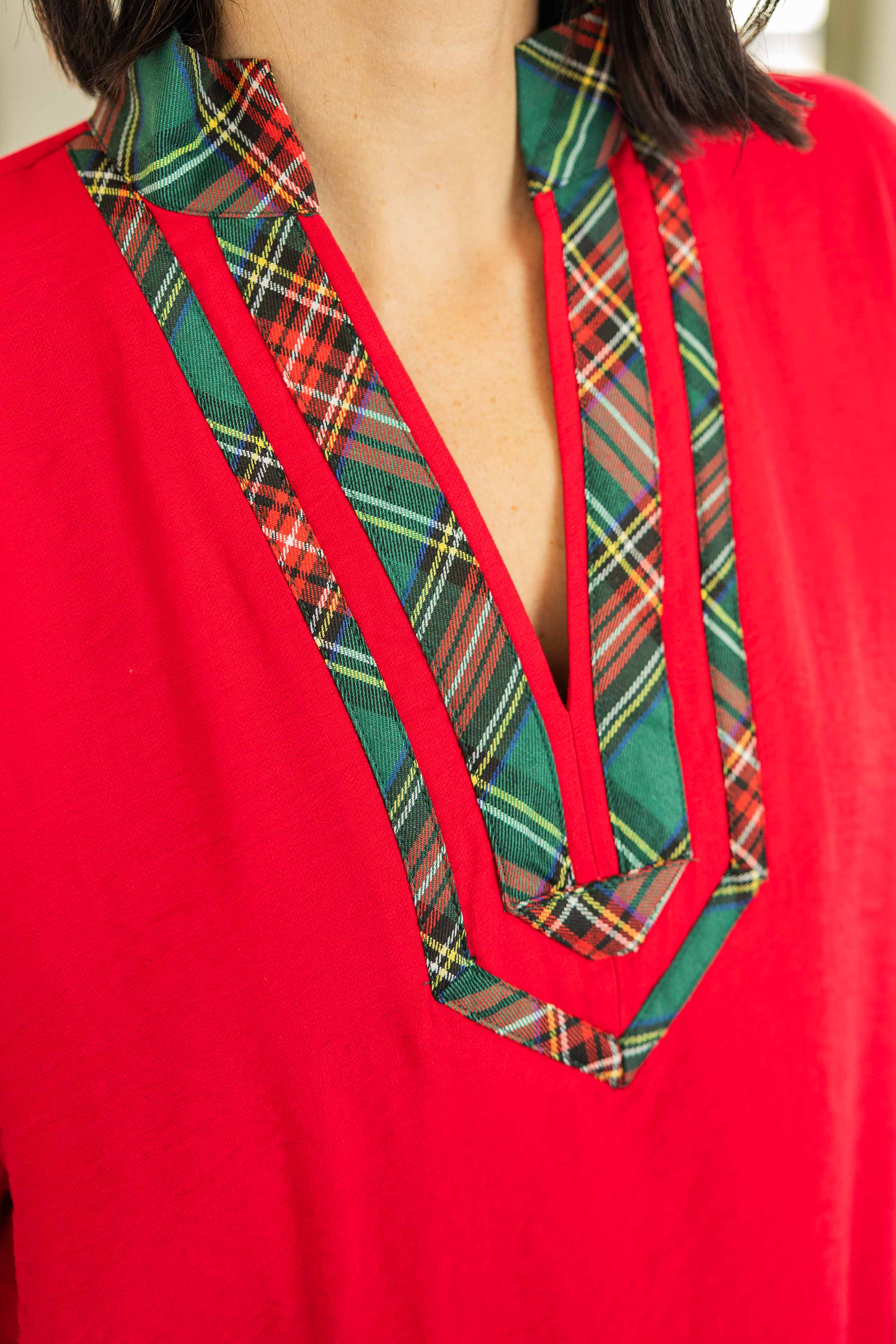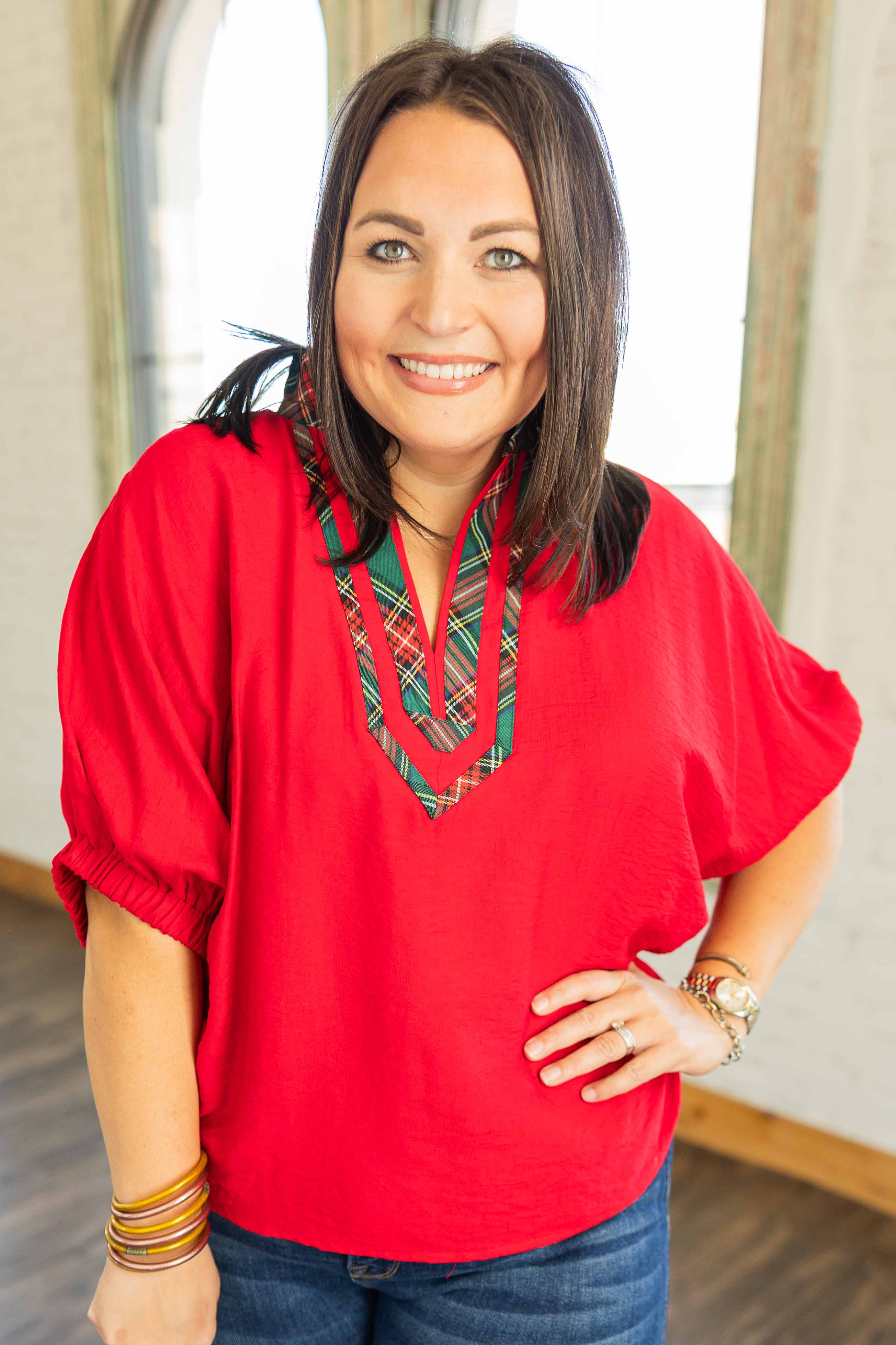 Festive without going full-Santa. This bright red top has a relaxed fit that feels easy. The plaid trim on the V neckline gives it a fun seasonal pop. The dolman sleeves have a comfy elastic band. Lightweight woven fabric that works great for warmer winter days here.