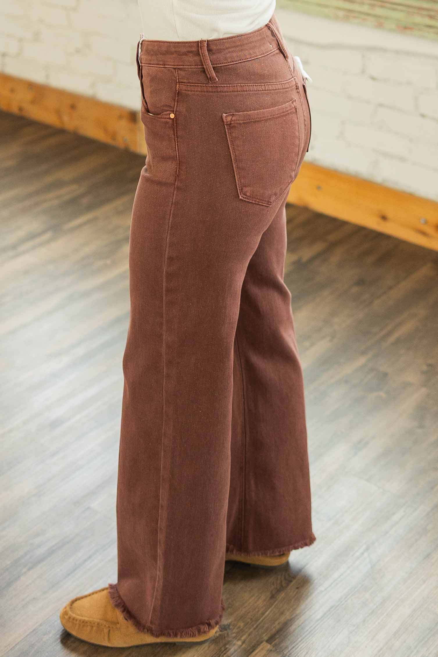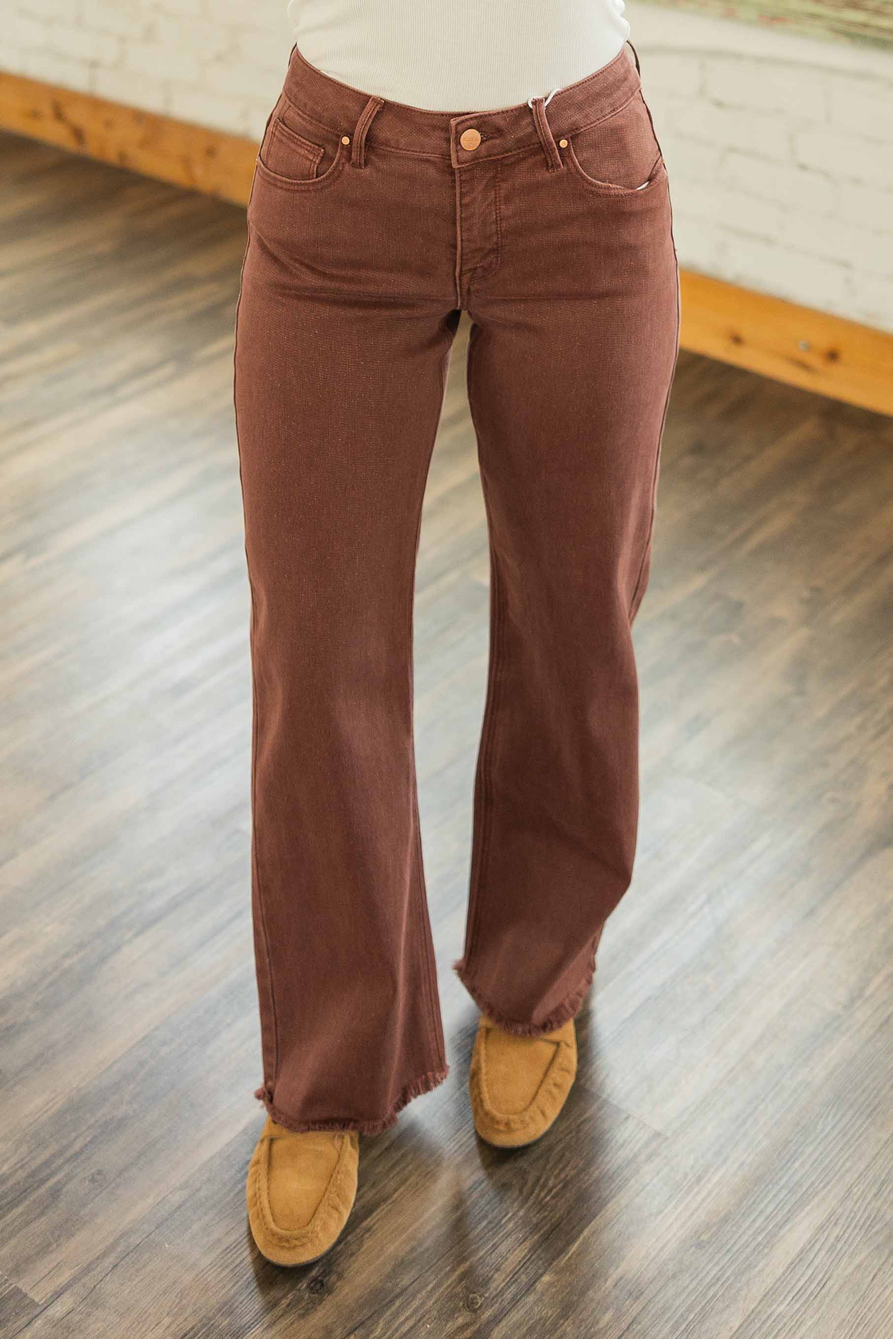A rich burgundy jean with a subtle shimmer thanks to metallic lurex threads woven throughout. Mid rise fit with a wide leg silhouette that hits at the ankle. Clean hem with a slight fray gives a relaxed look with festive shine.