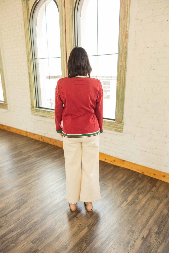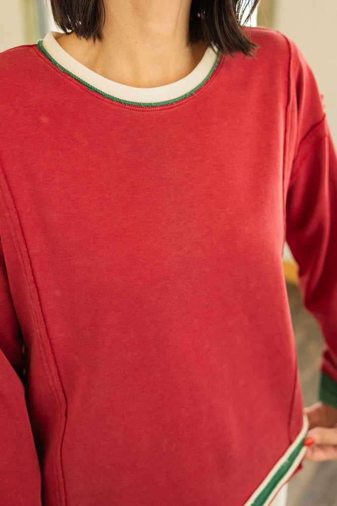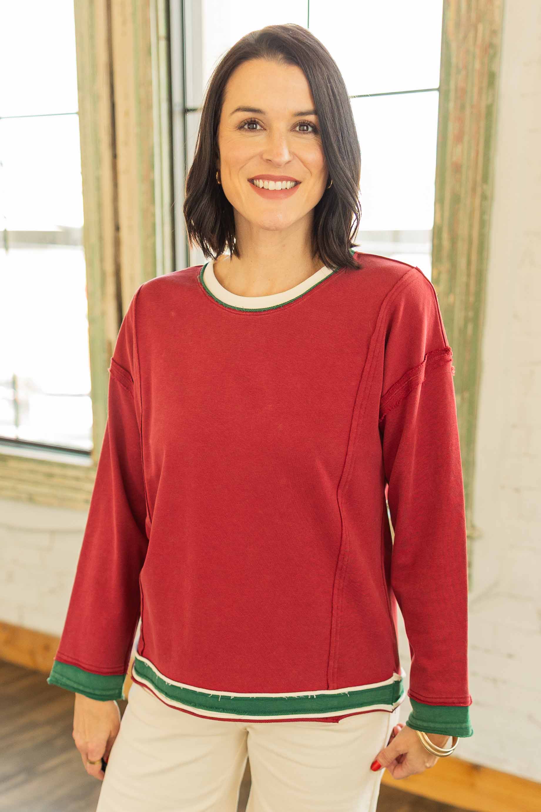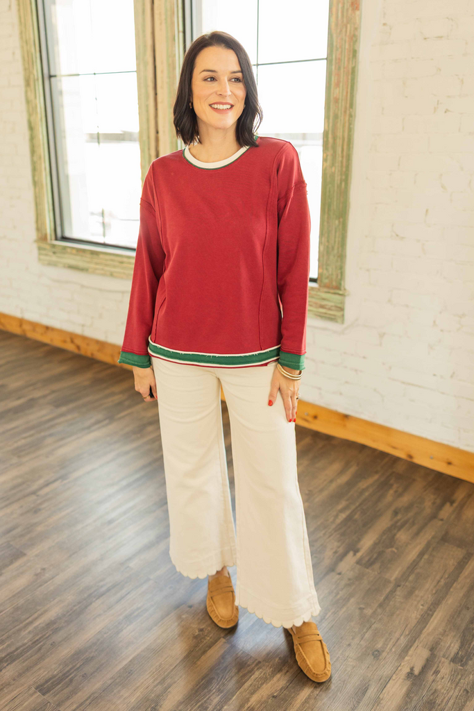 This one gives casual cute with a side of holiday spirit. Soft red body. Green pops at the cuffs and hem. Raw edge detail keeps it laid back and cool. It feels like your favorite sweatshirt got a festive upgrade.