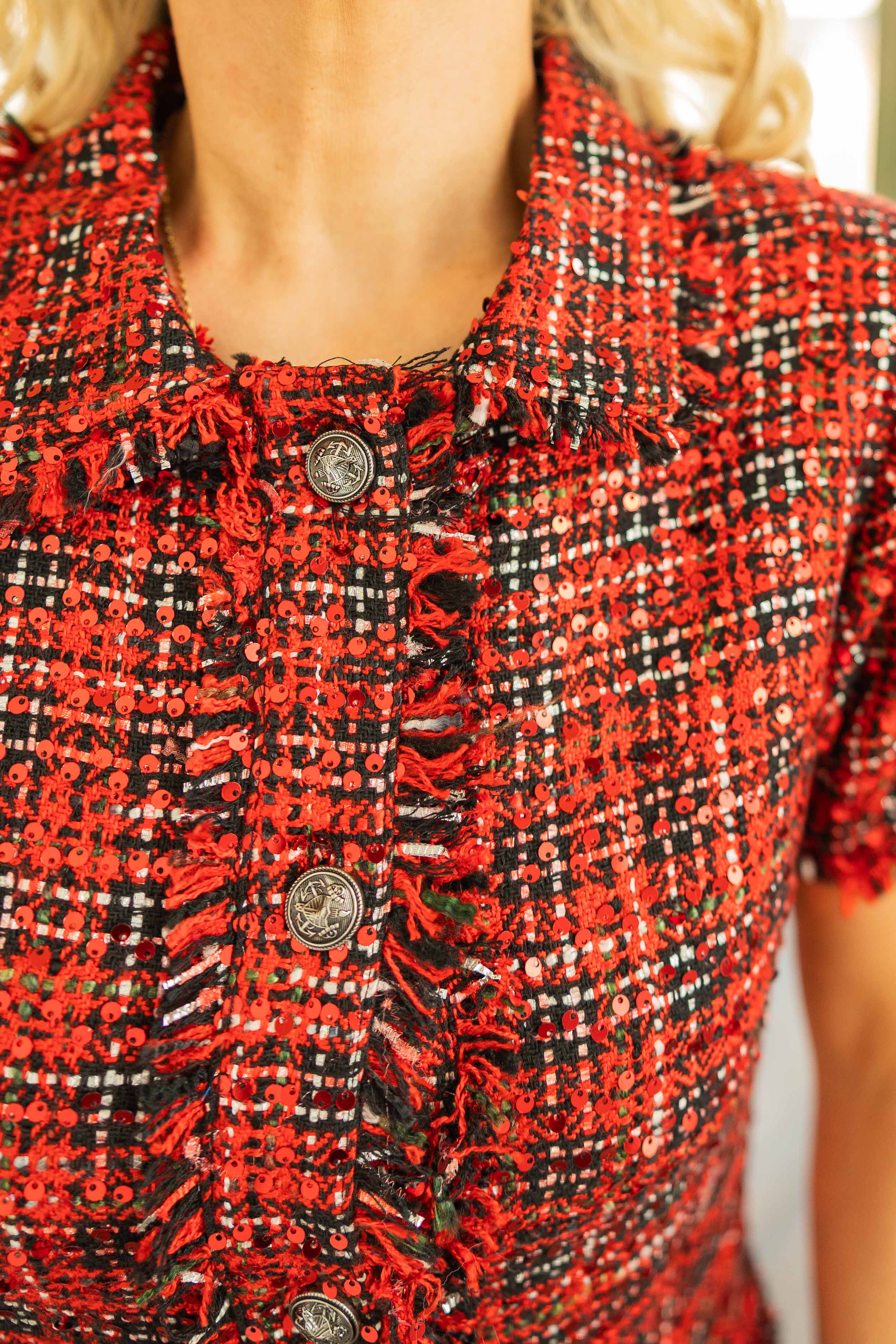 Classic tweed meets holiday sparkle. This red, black and white plaid mini dress has small sequin details that catch the light just right. The button front and collar feel polished. The short sleeves make it great for our warm Texas winters. The fringe edges add texture and personality. It is a tailored, snug fit that gives structure in all the right places.
