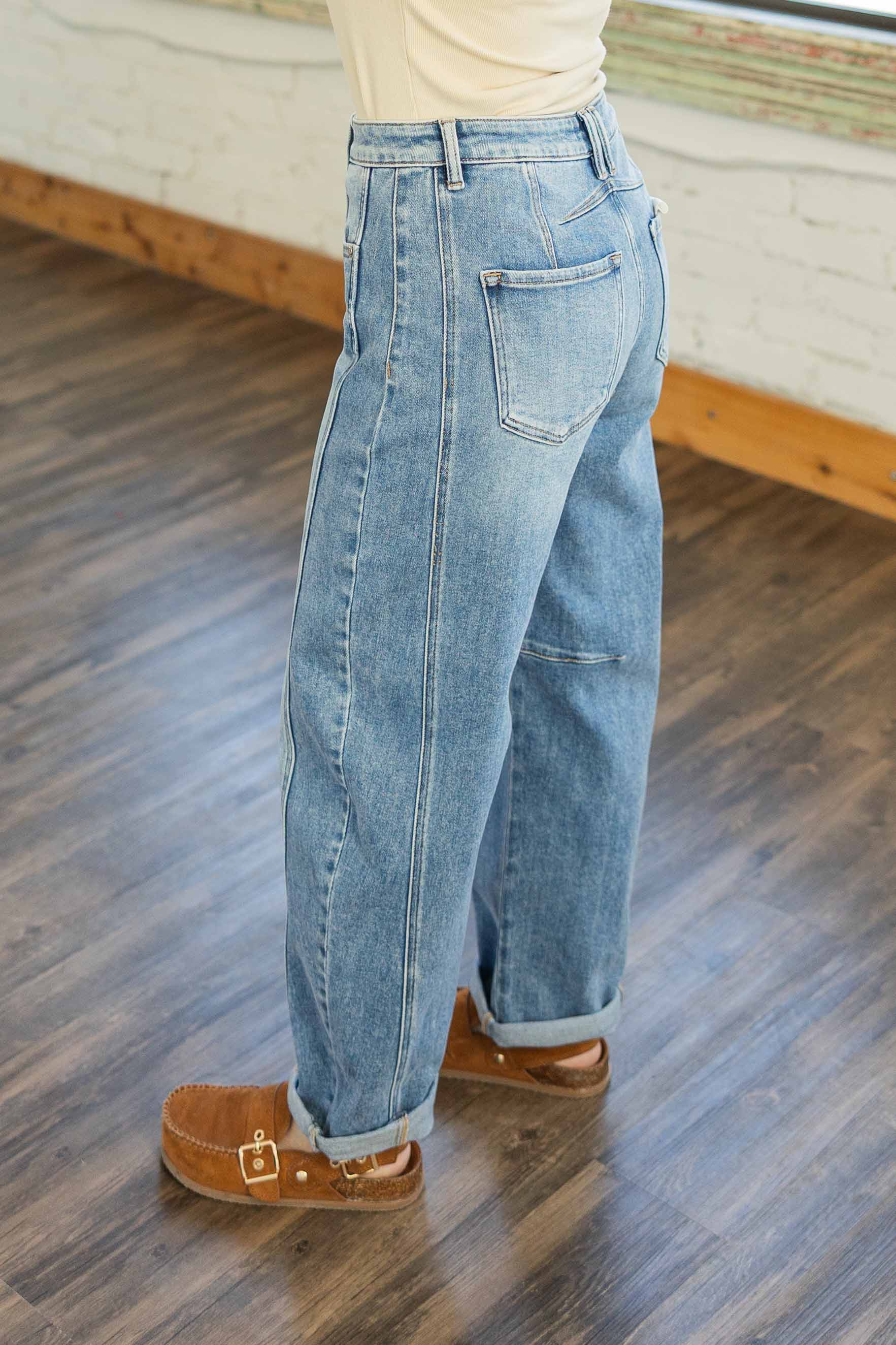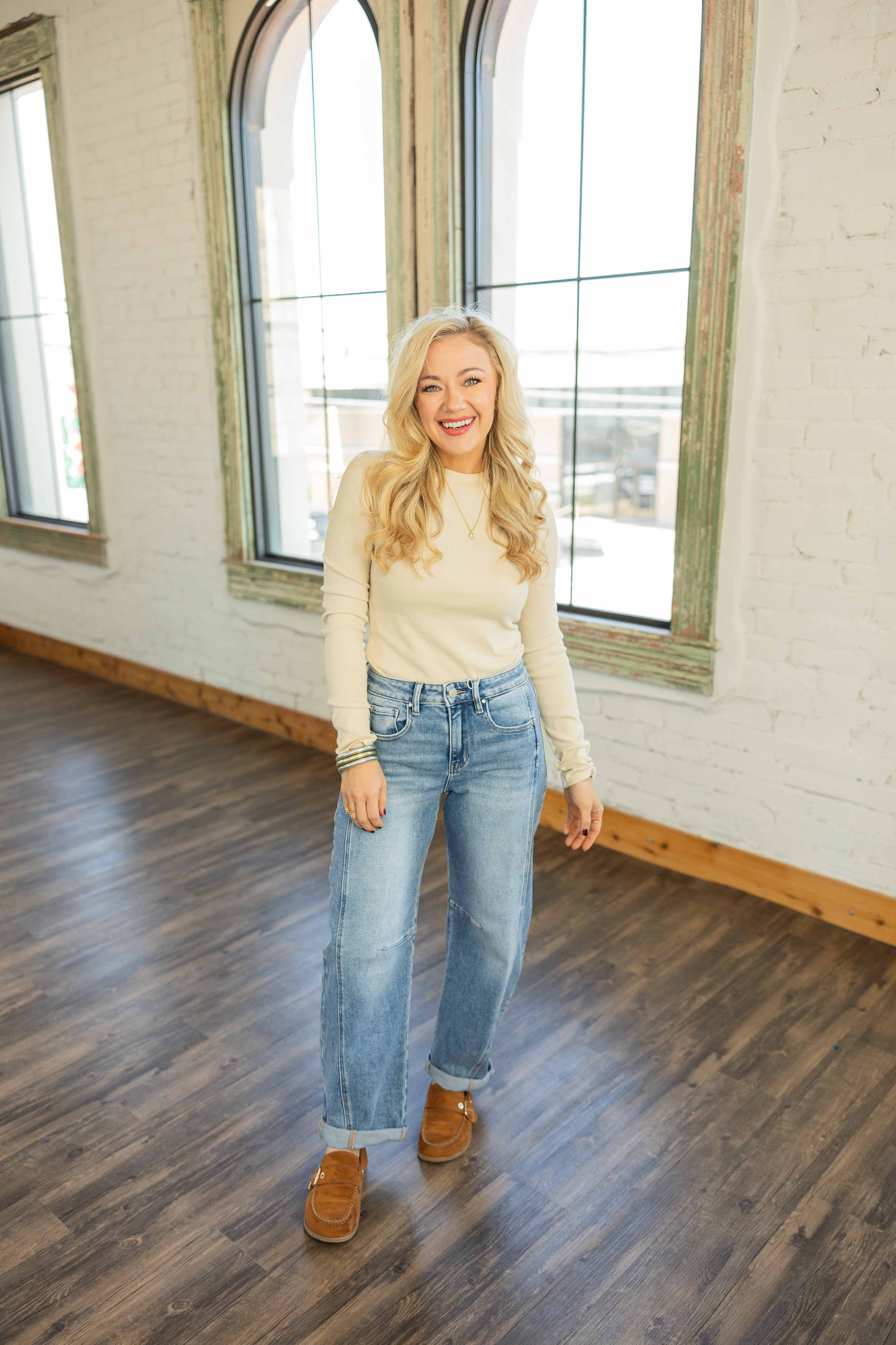 These jeans bring that laid back, lived in vibe you reach for on repeat. The medium wash stays easy to style and works year round in our Texas heat. The barrel style gives you room to move without feeling bulky. The cuff keeps the look clean. Holly is in a 3/26. The fit is super relaxed. If you want a less baggy feel, size down one.