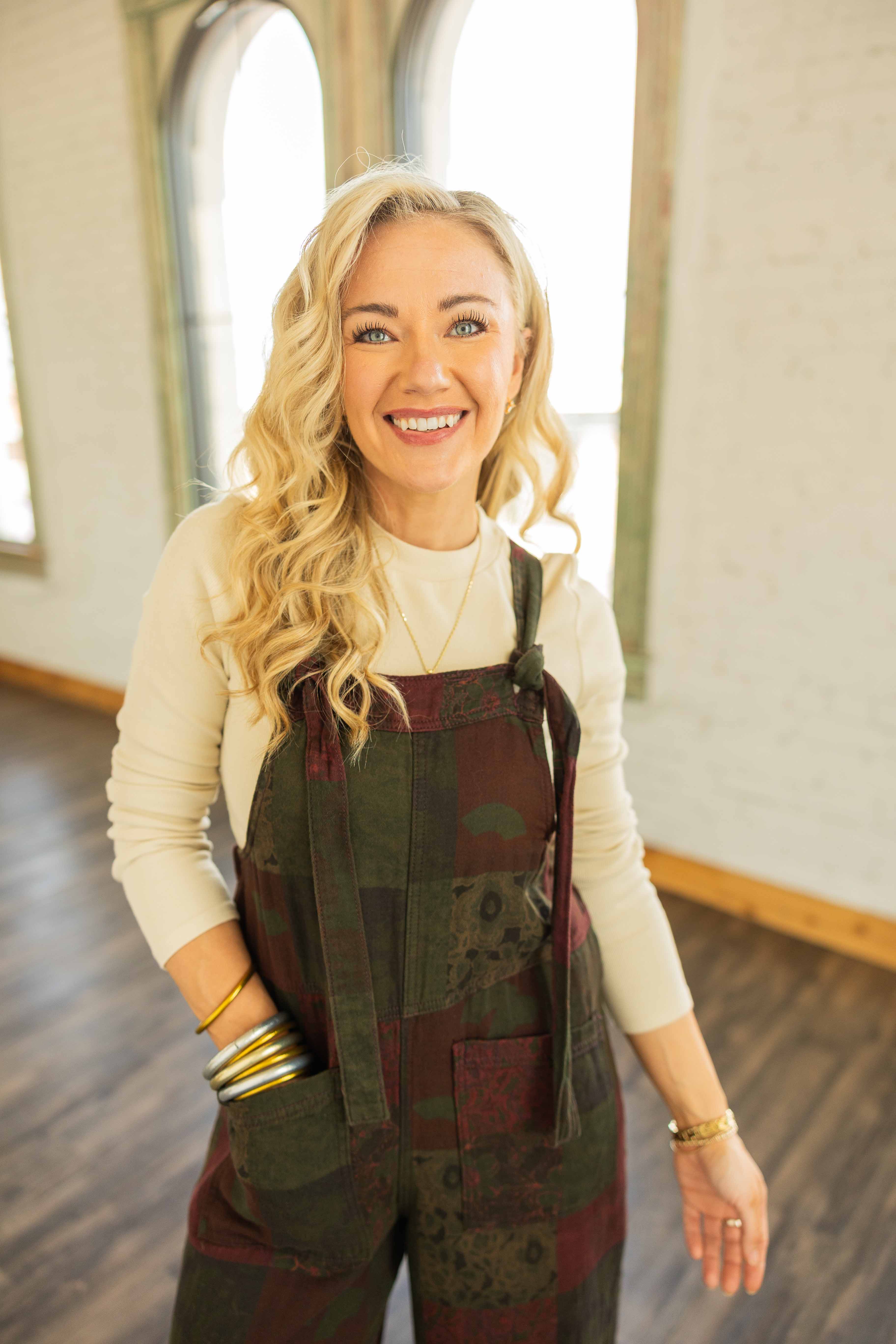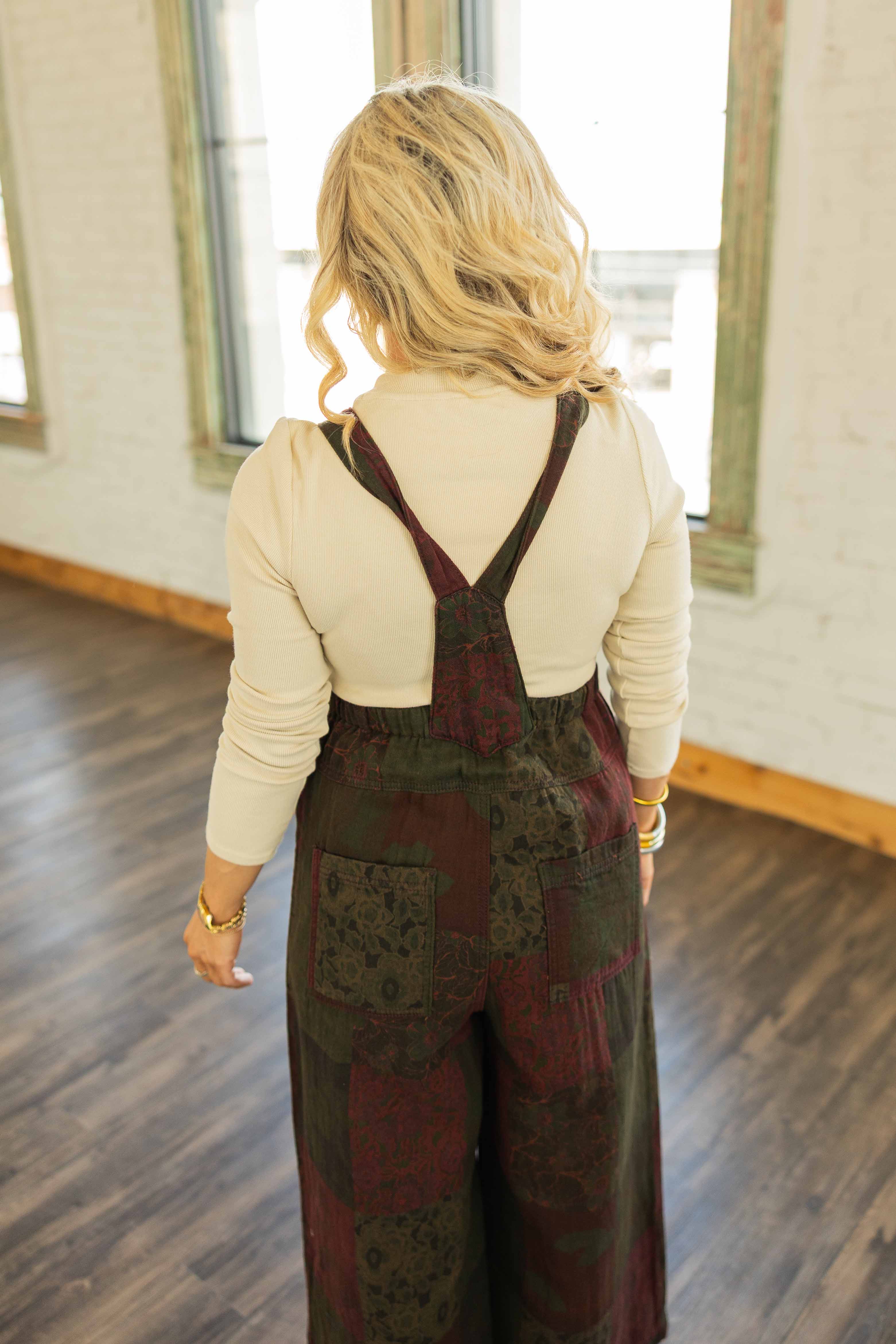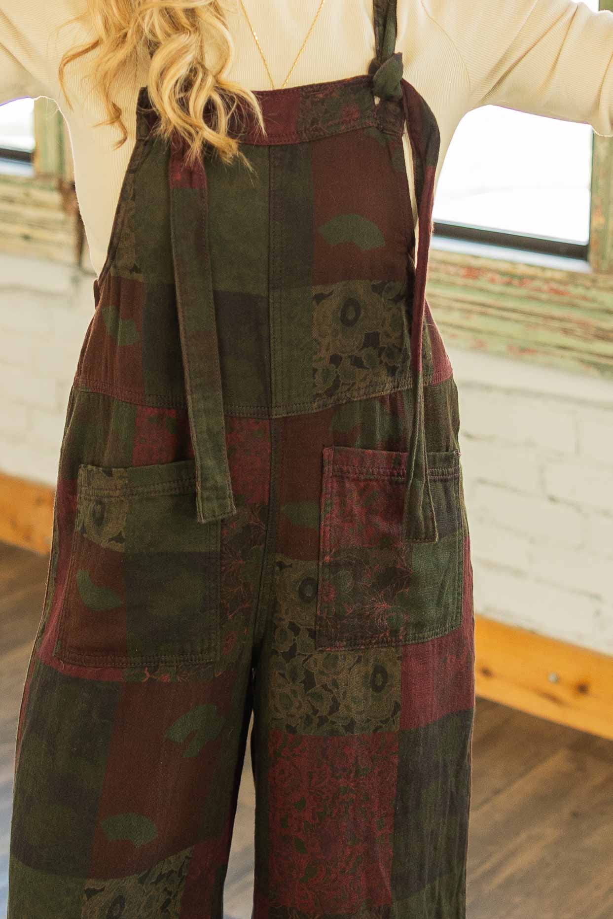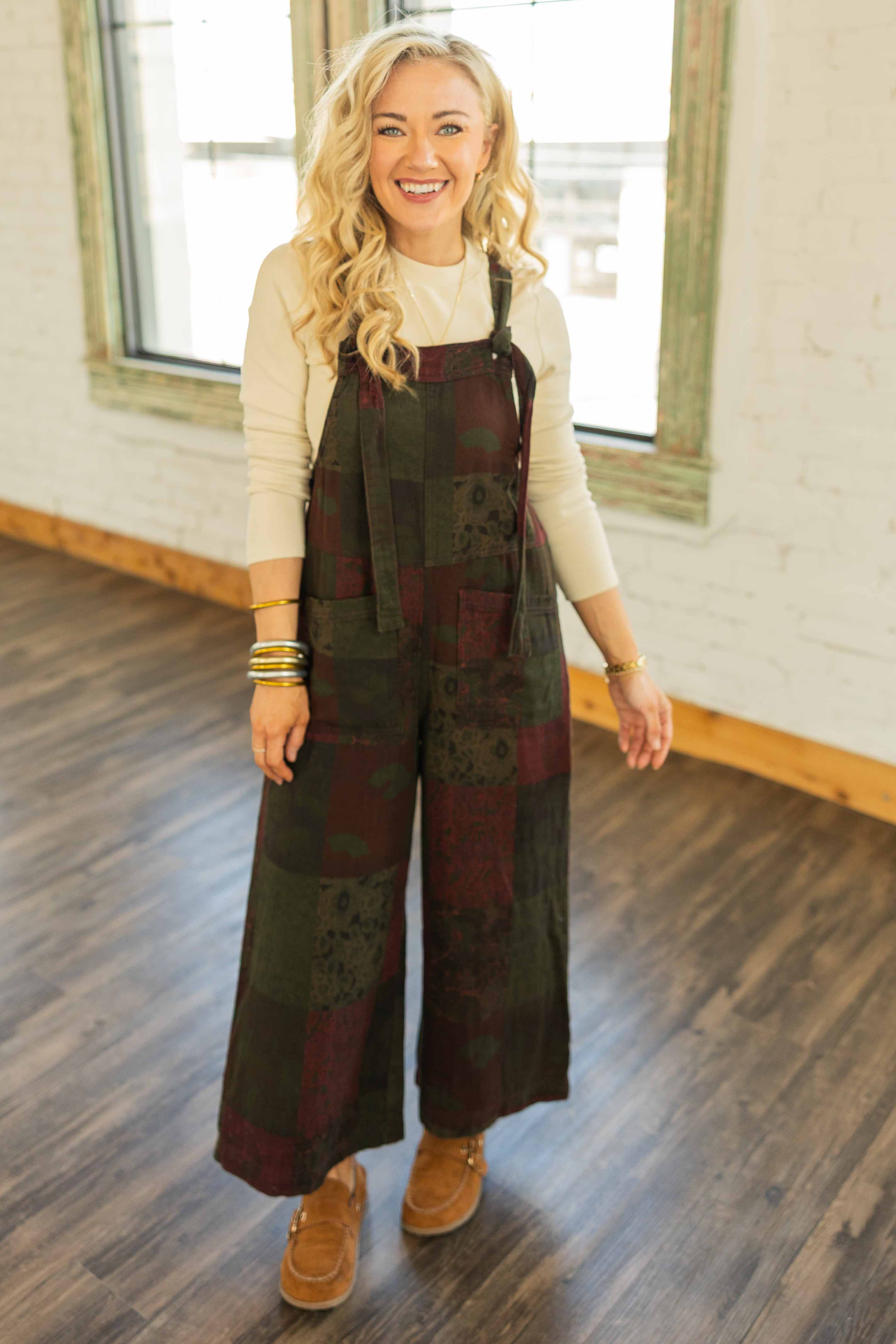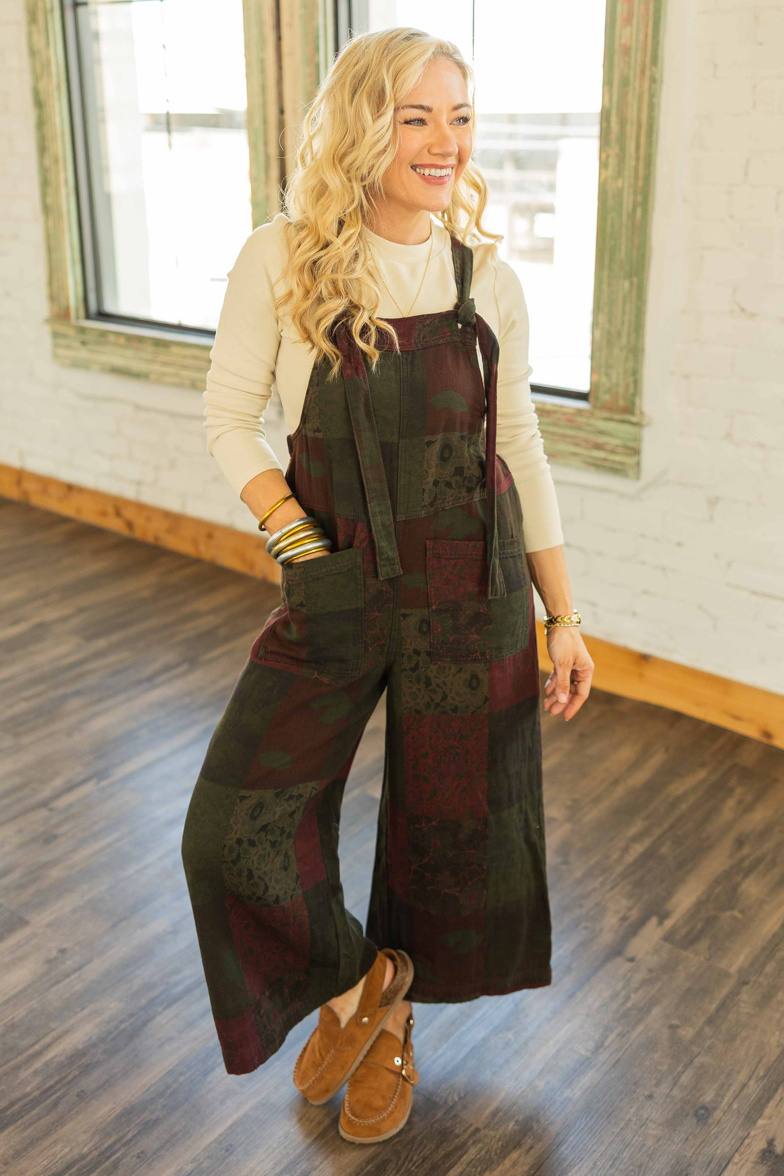 Easy, artsy and way too cute. This patchwork jumpsuit has a relaxed fit with a wide leg that feels comfy all day. Adjustable straps let you customize the fit. Big front pockets for snacks or your phone. The deep green and burgundy tones give it a cozy seasonal vibe without being too literal.