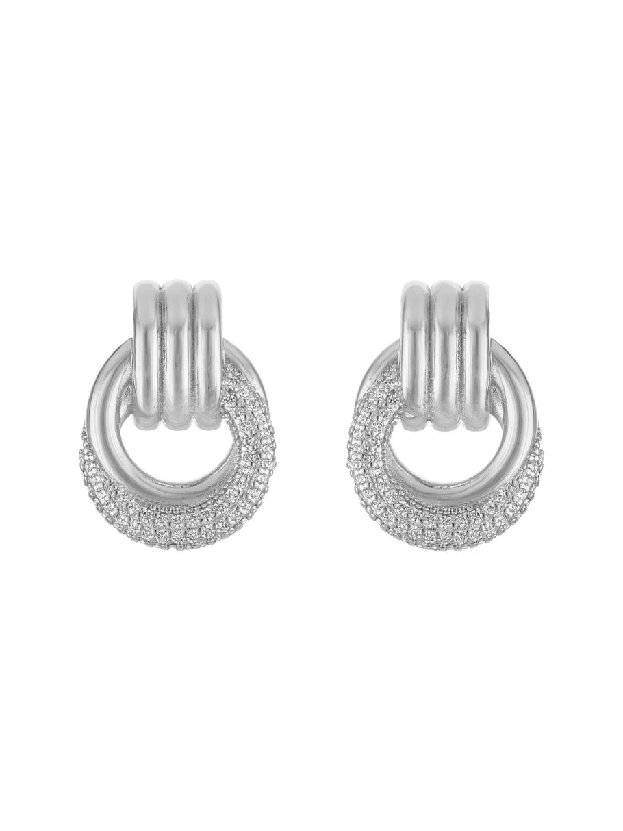 These earrings feature an intricate, intertwined structure reminiscent of a knotted motif. The top features a smooth, shiny silver link that cascades a CZ-encrusted circular loop.