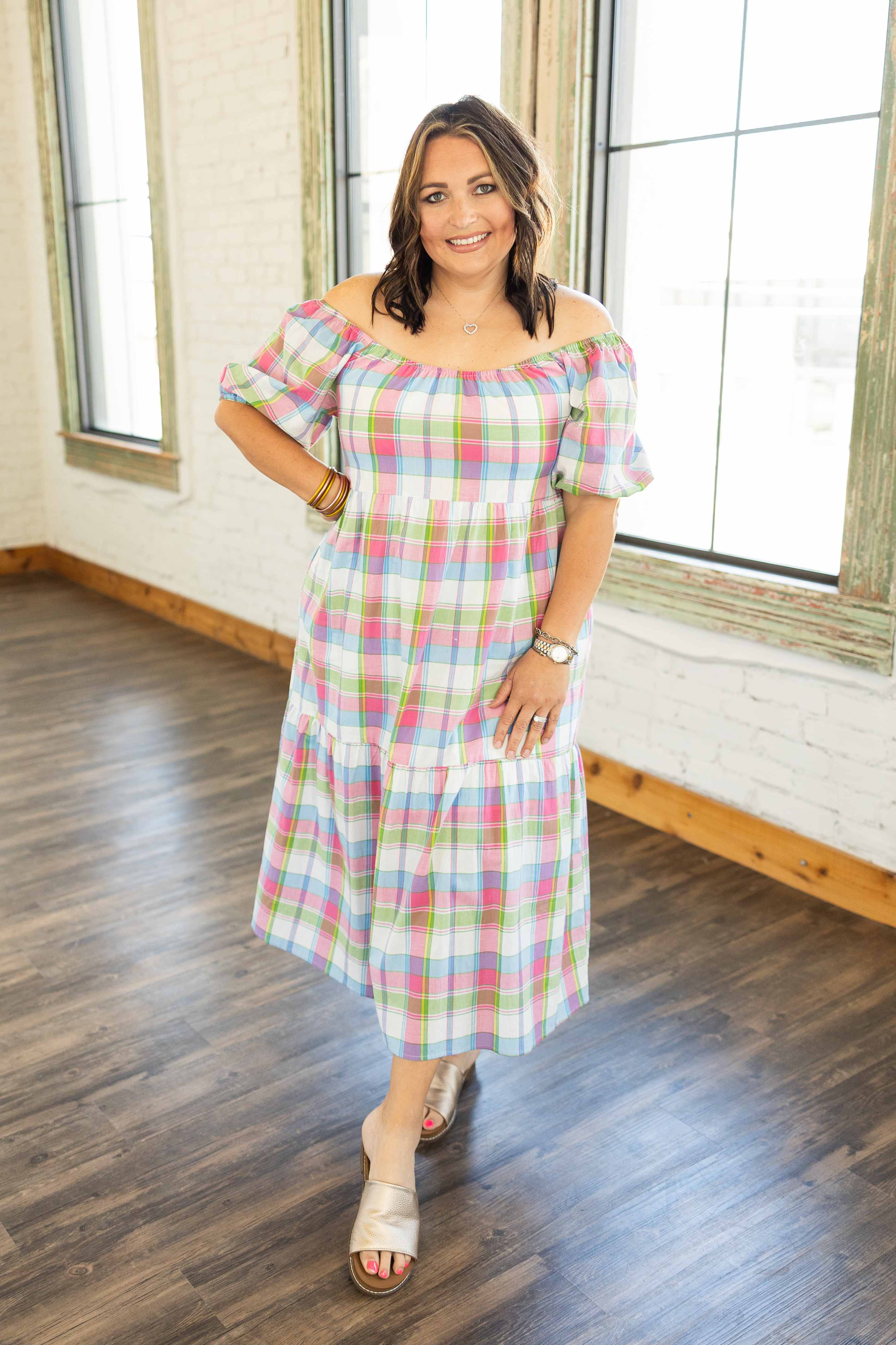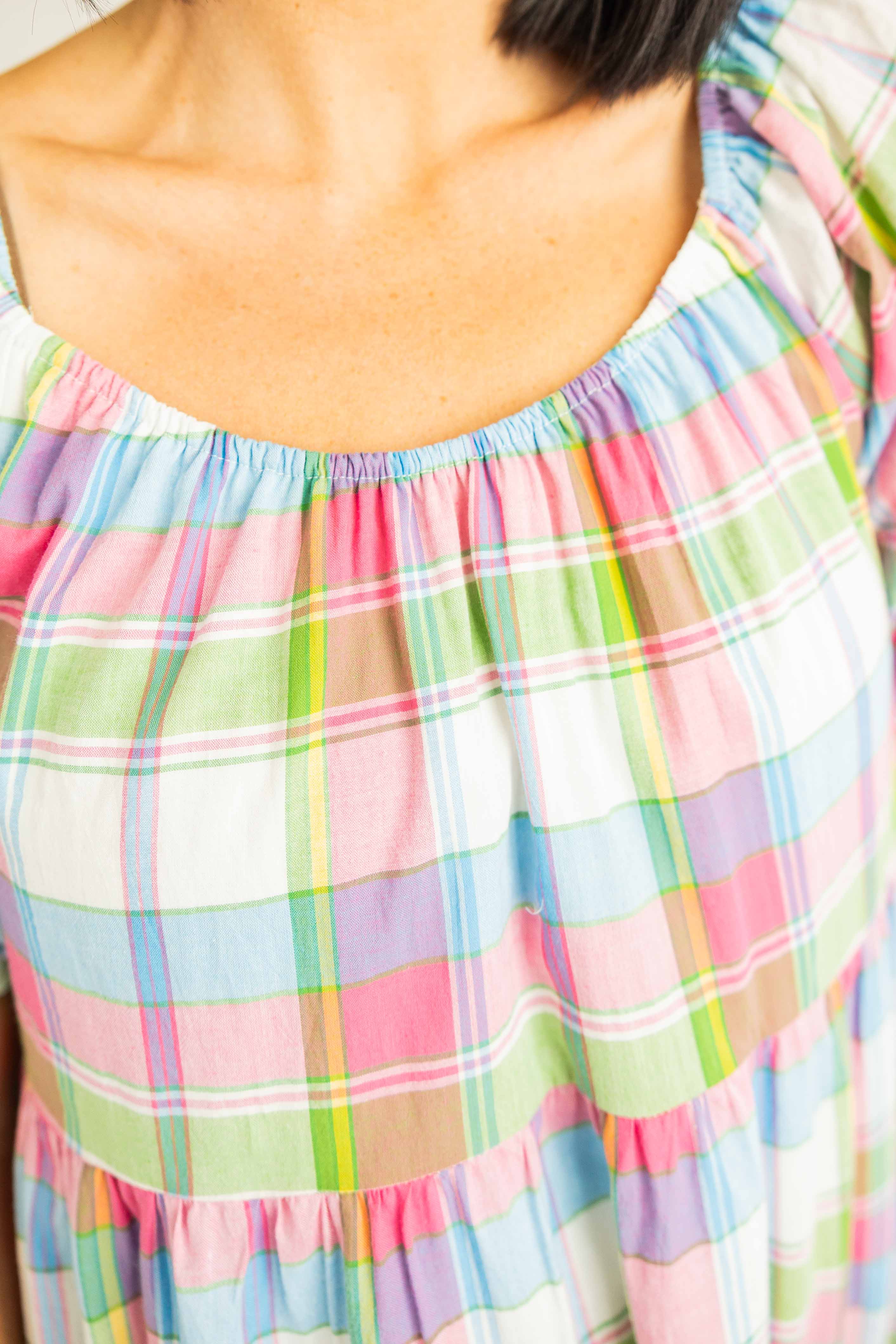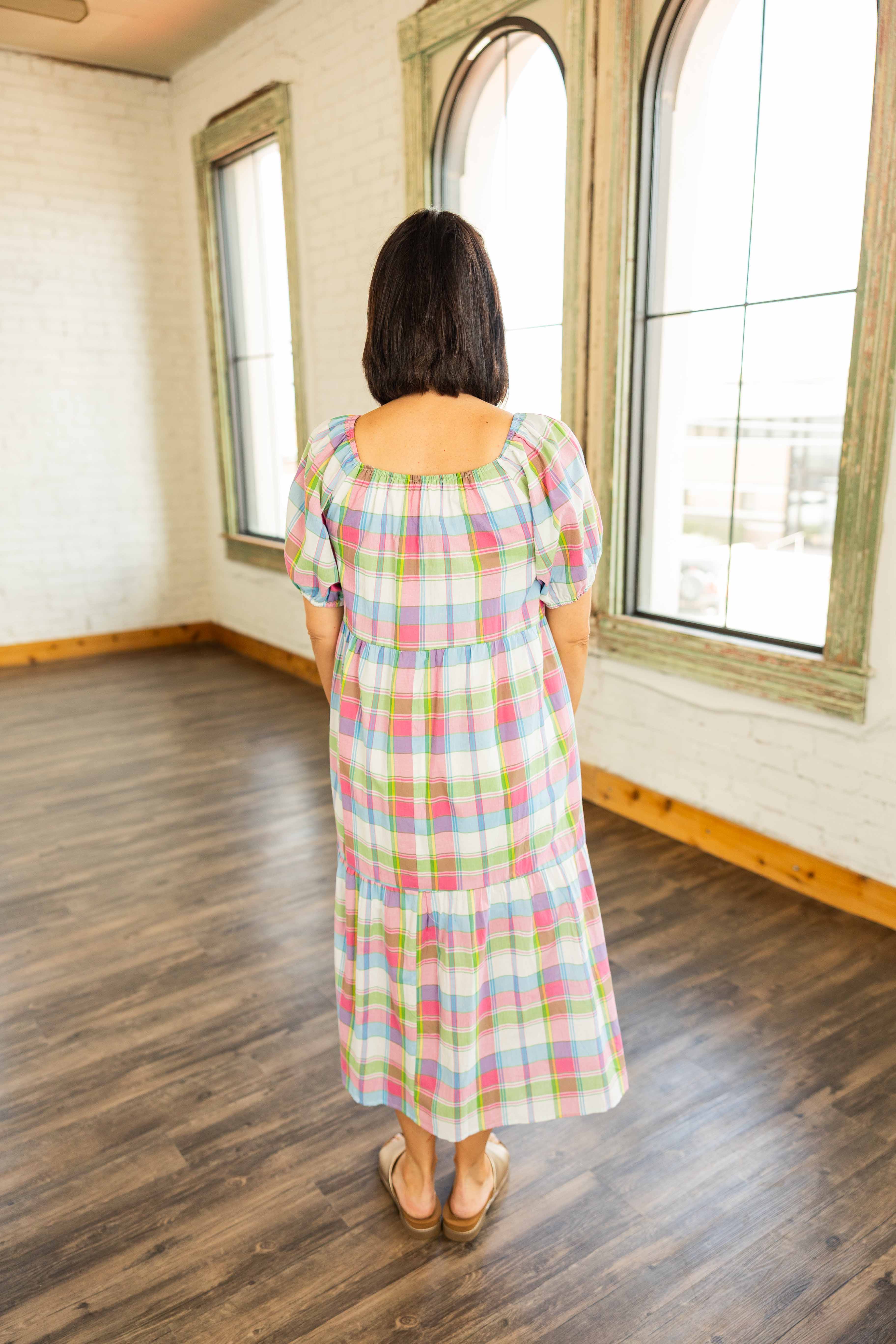Fresh, playful, and ready for sunshine. The Annabelle Gingham Midi Dress brings soft spring color with a cheerful pastel plaid mix of pink, blue, green, and soft yellow. The roomy tiered silhouette keeps things easy and breezy while the gathered neckline adds a sweet touch you can wear on or off the shoulder. Lightweight cotton gives it that crisp spring feel while the relaxed puff sleeves and flowy midi length keep it comfortable all day. And yes, it has pockets. We love a dress that works as hard as we do.