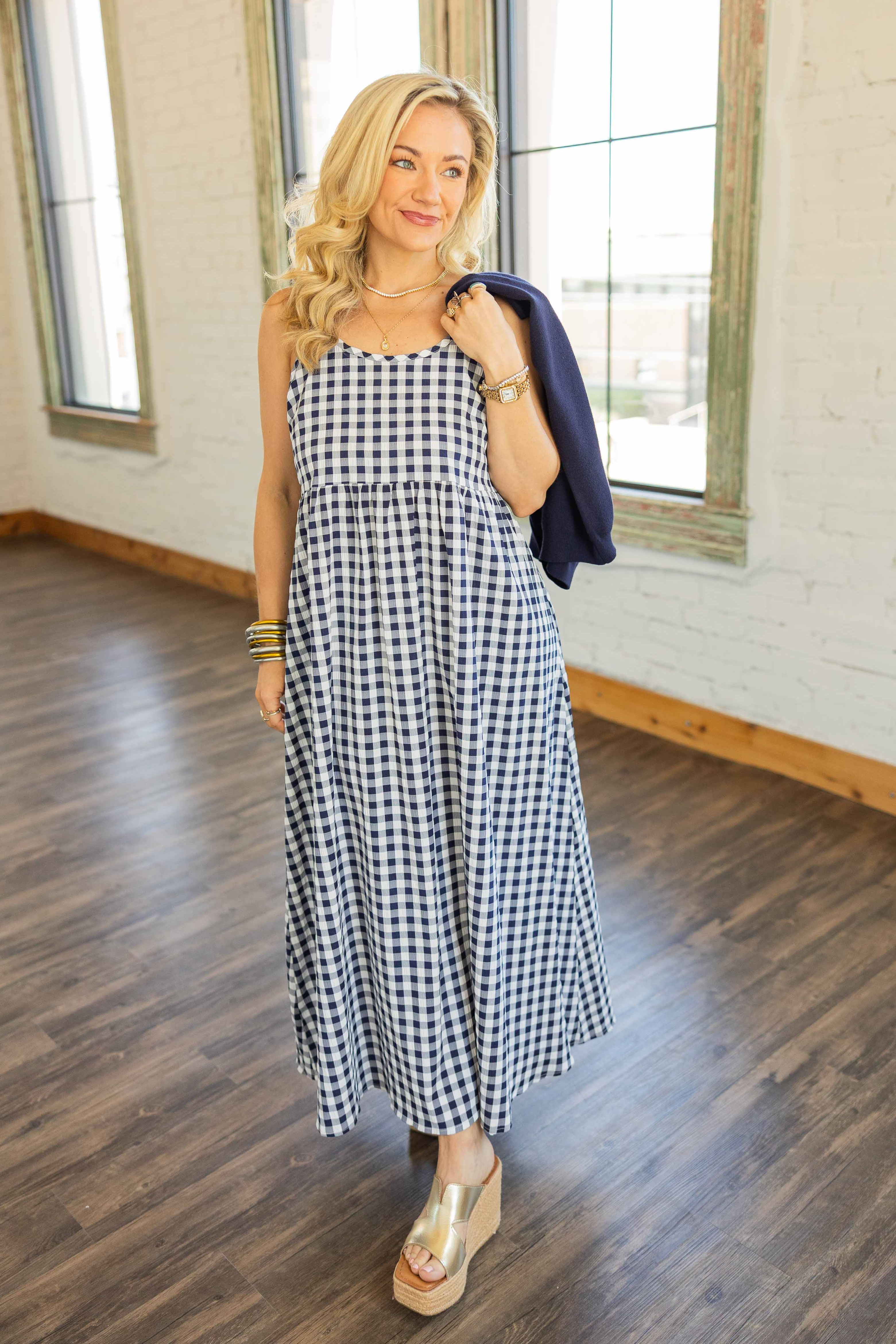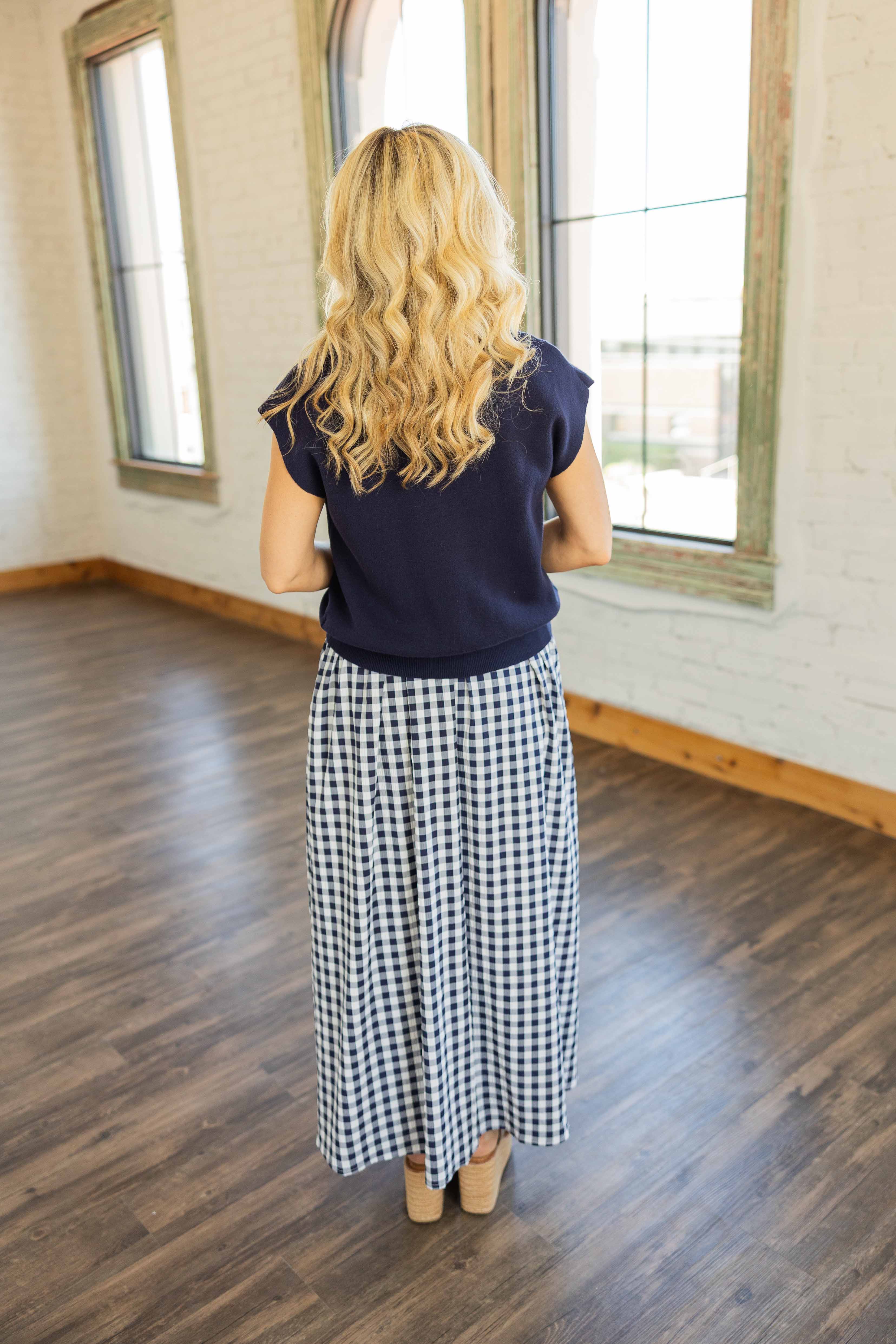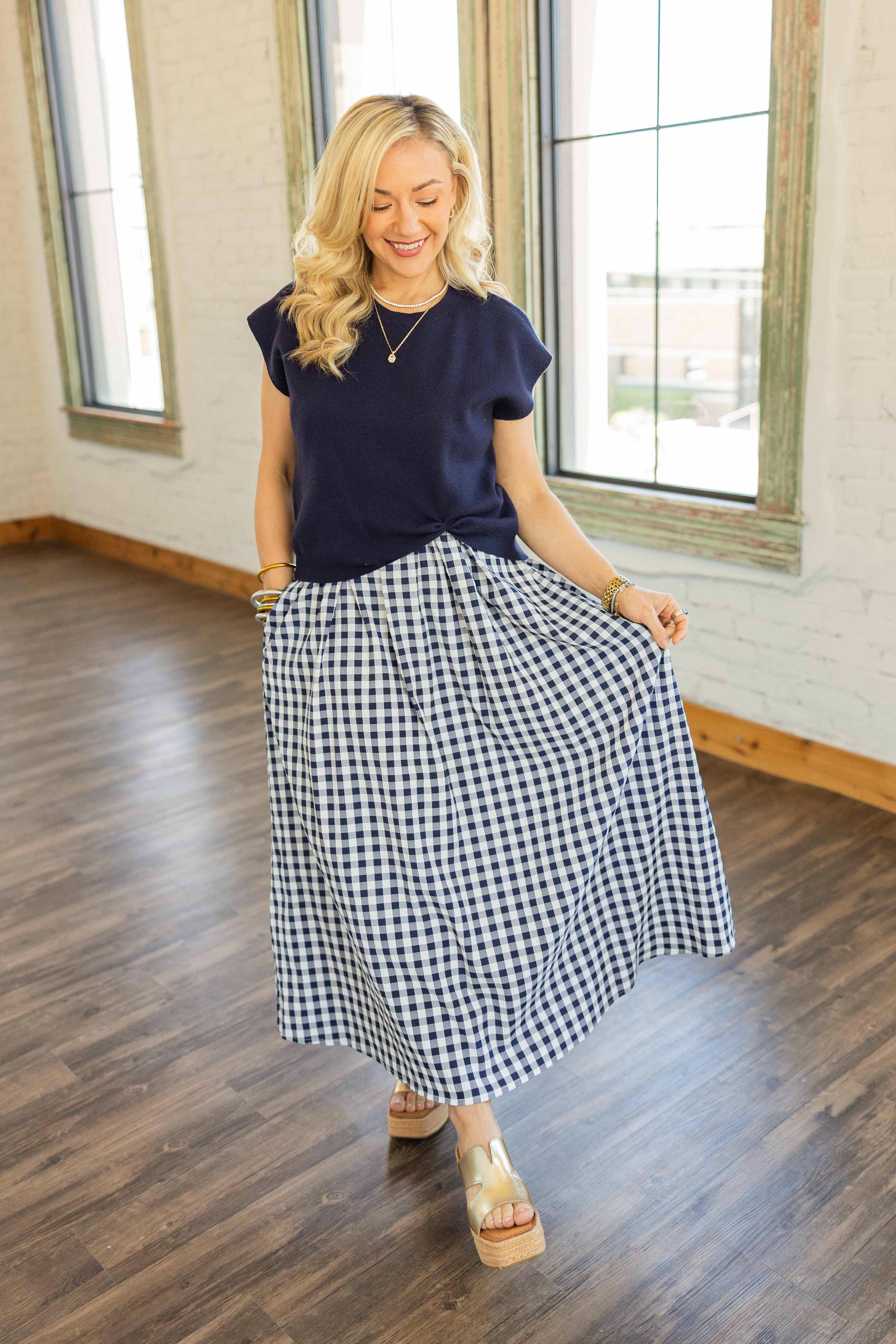 Two looks. One outfit. Zero effort. This navy and ivory gingham midi gives you that classic, all-American feel, while the layered knit pullover adds a little structure up top. Wear them together for an easy, put-together moment or ditch the top and let the sleeveless dress shine on its own. Lightweight, breathable, and yes… it has pockets. We love a multitasker.