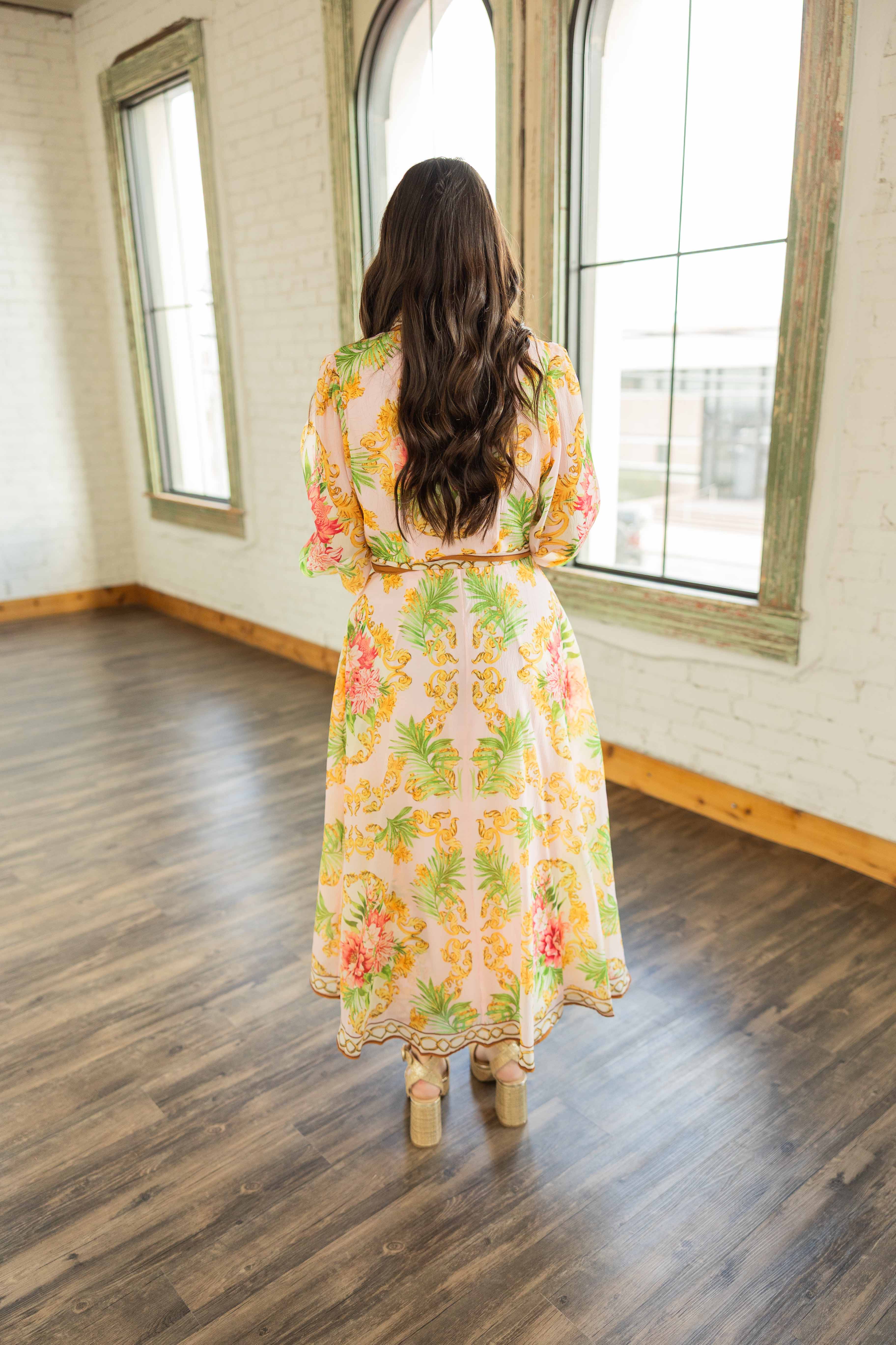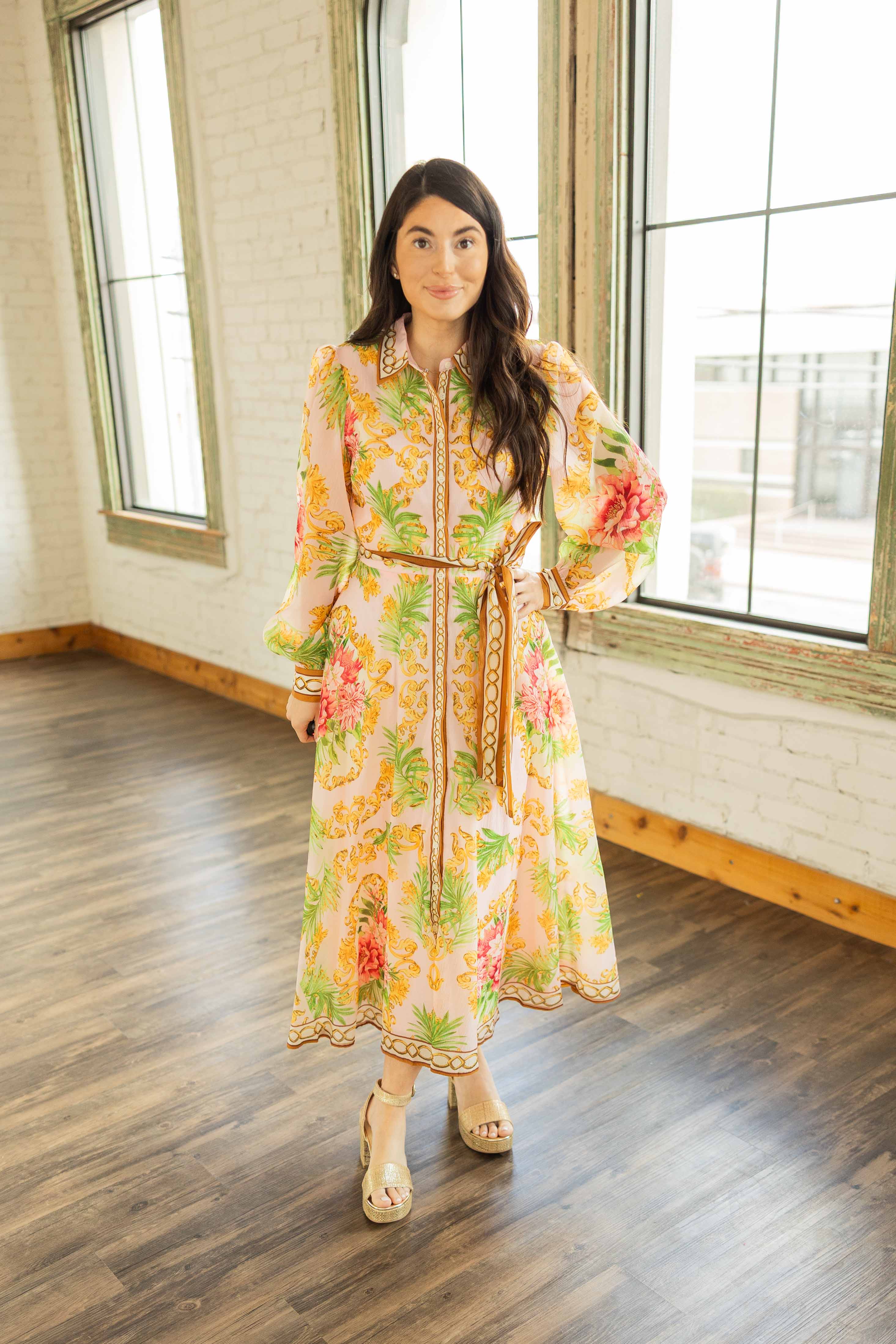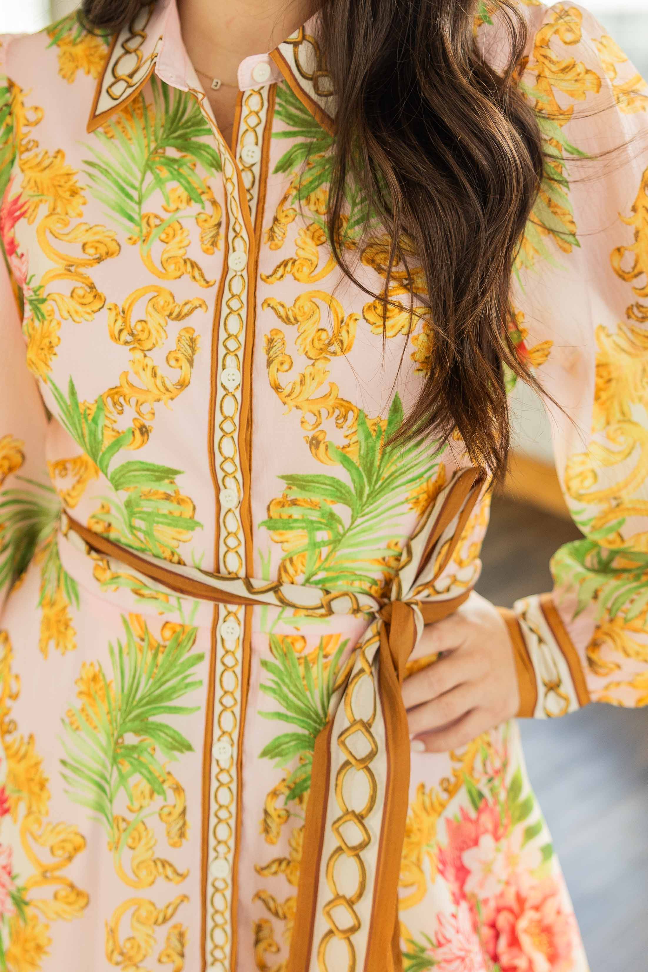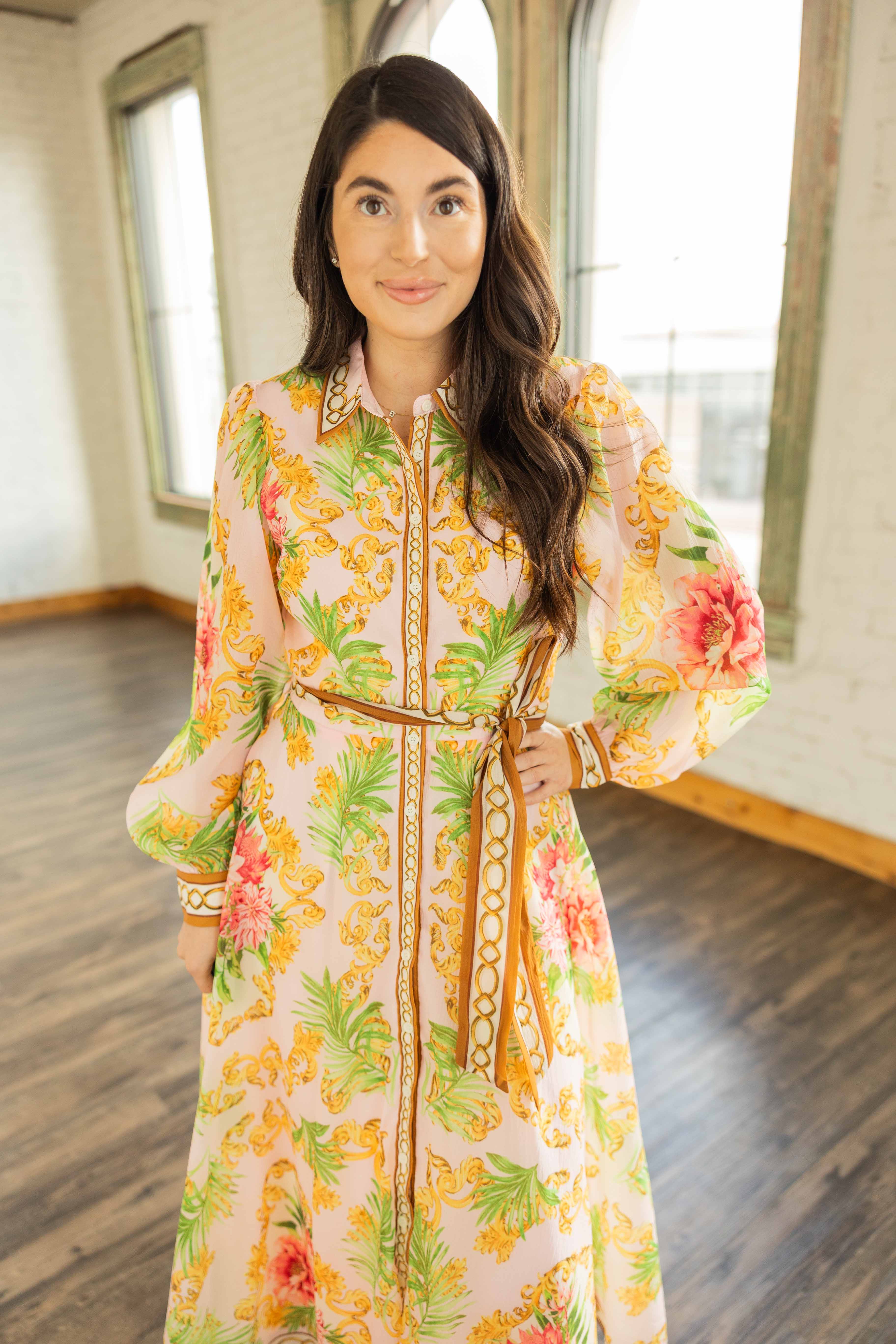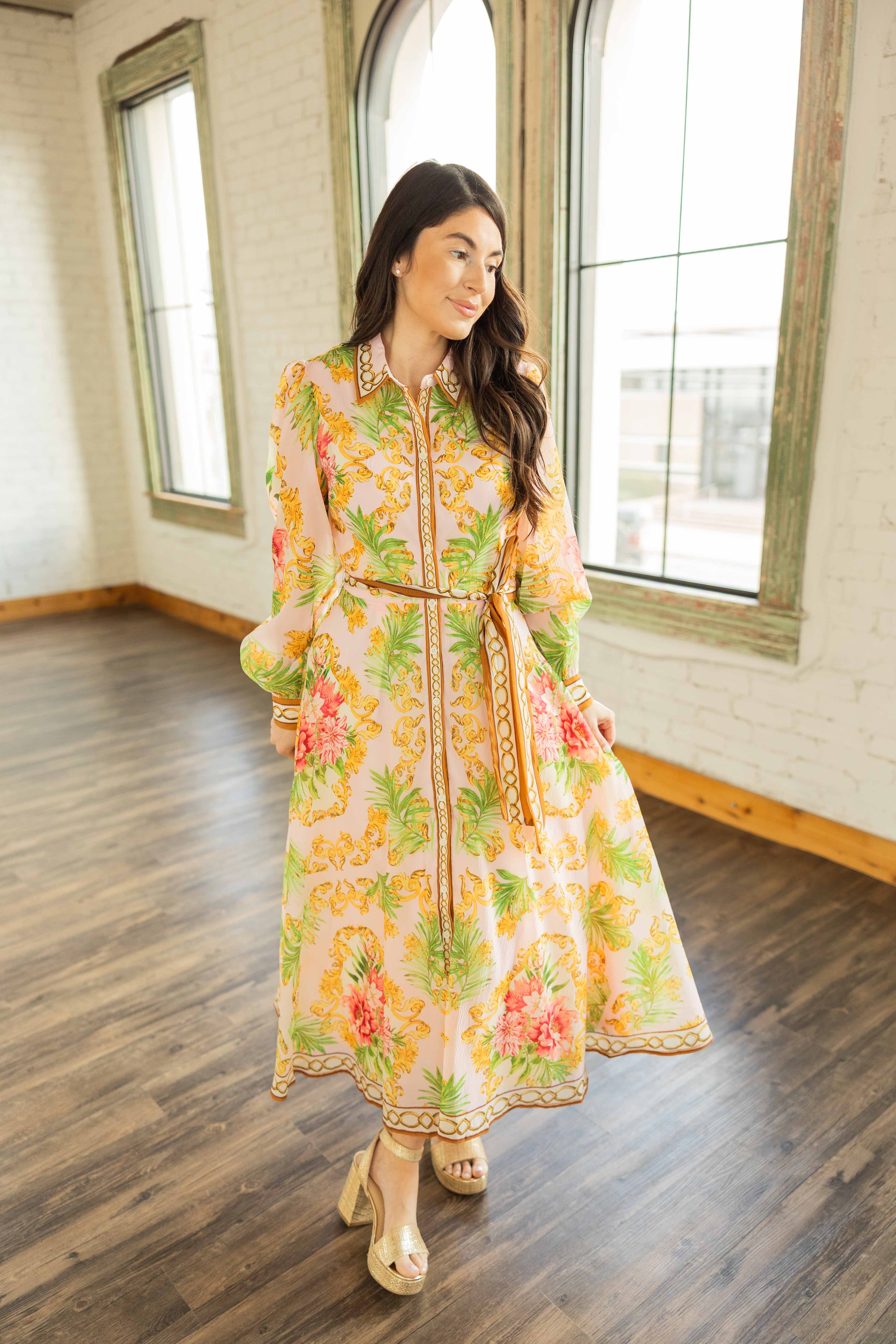 She’s giving elevated garden party with a little vintage flair. A soft blush base covered in warm coral florals and leafy greens, framed with rich golden scroll details that make this one feel extra special. The full skirt moves beautifully, and the button front with a classic collar keeps it structured. Finished with a self tie belt to cinch you in just right. She’s the kind of dress that does all the talking so you don’t have to.