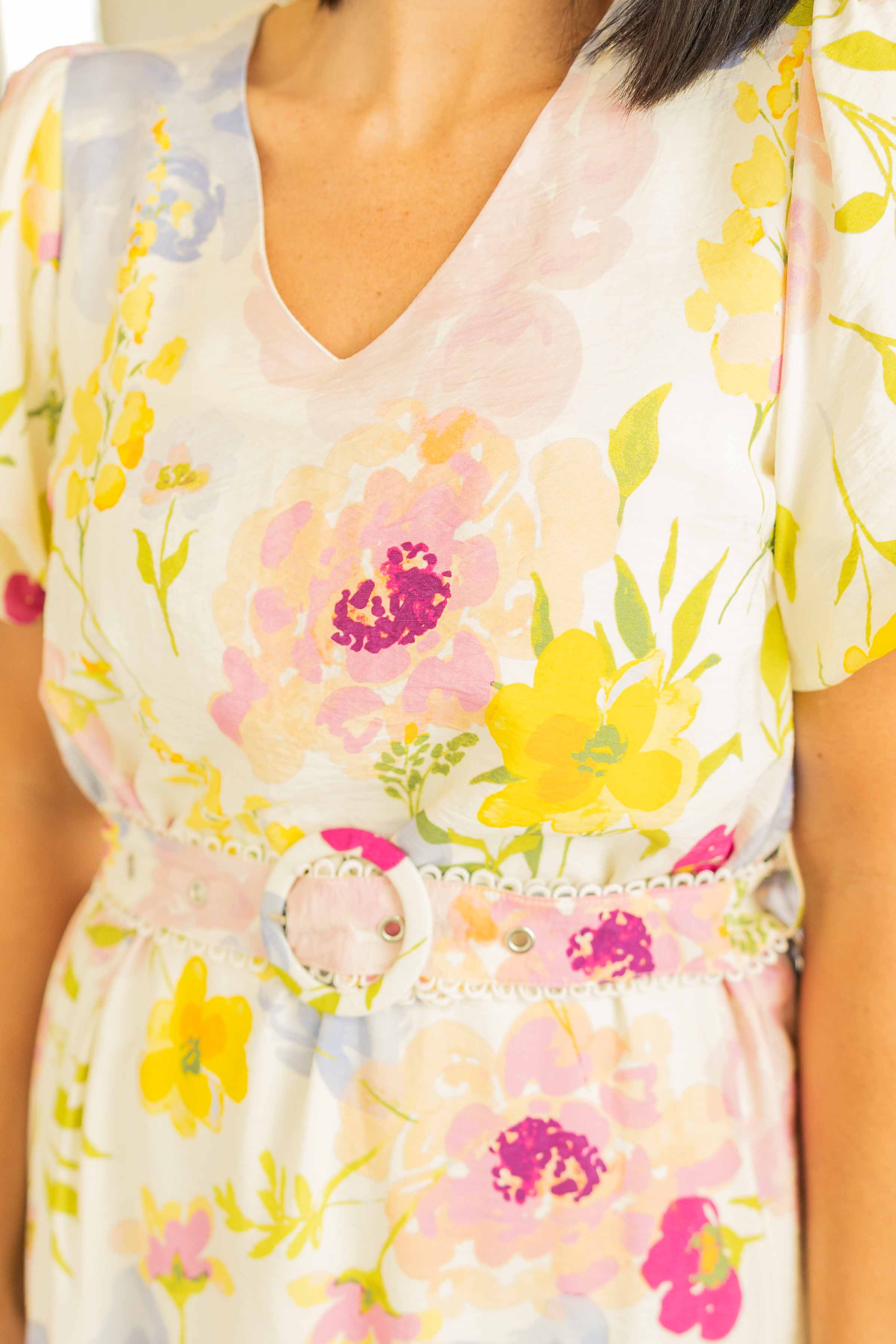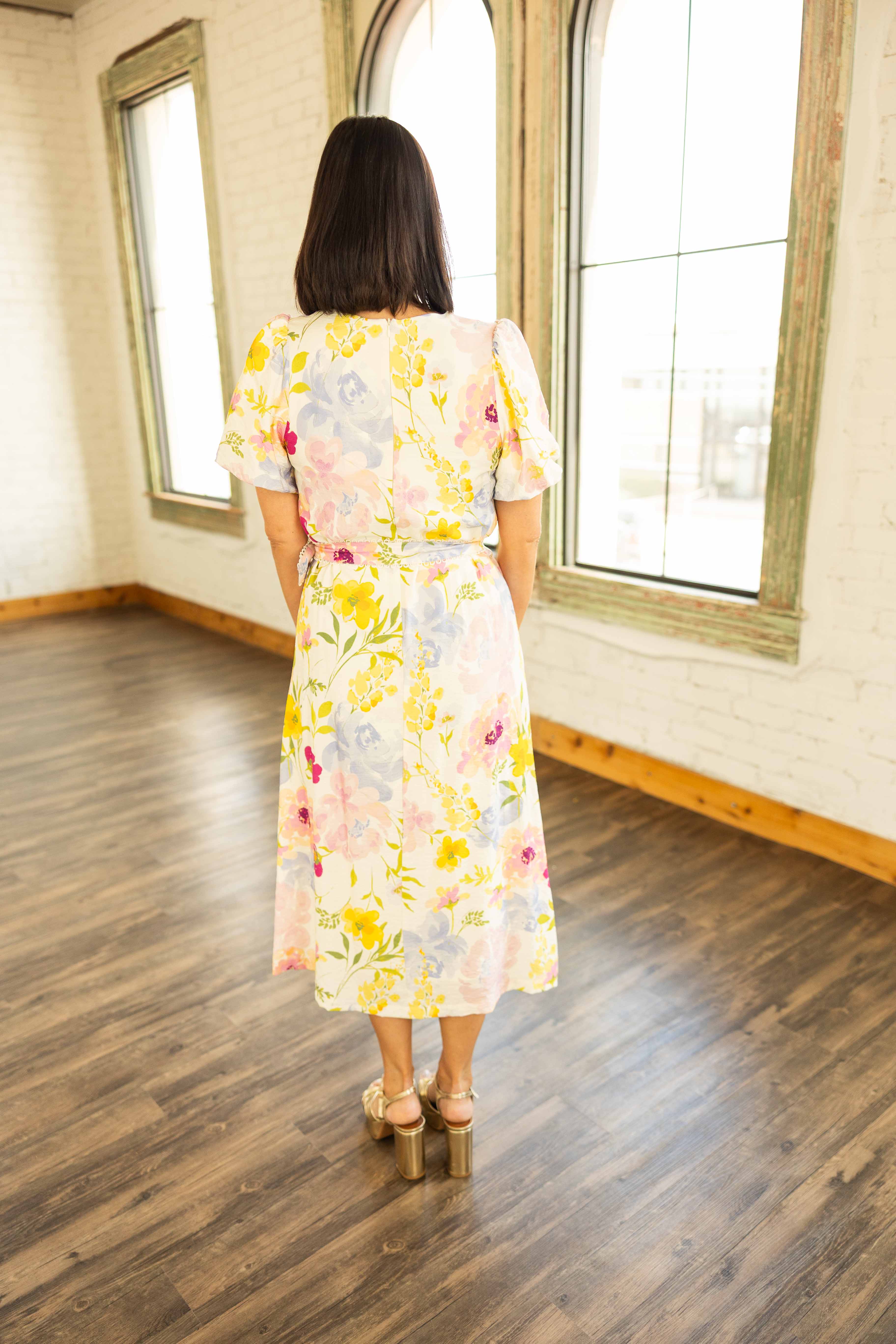 Soft florals with a little structure. That is the vibe here. A dreamy pastel mix of yellow, pink, and soft blue laid over a light base that feels fresh and polished. The matching belt pulls everything in just right, while the flowy midi length keeps it easy and comfortable. Add in the subtle puff sleeve and you have a dress that does all the work for you.