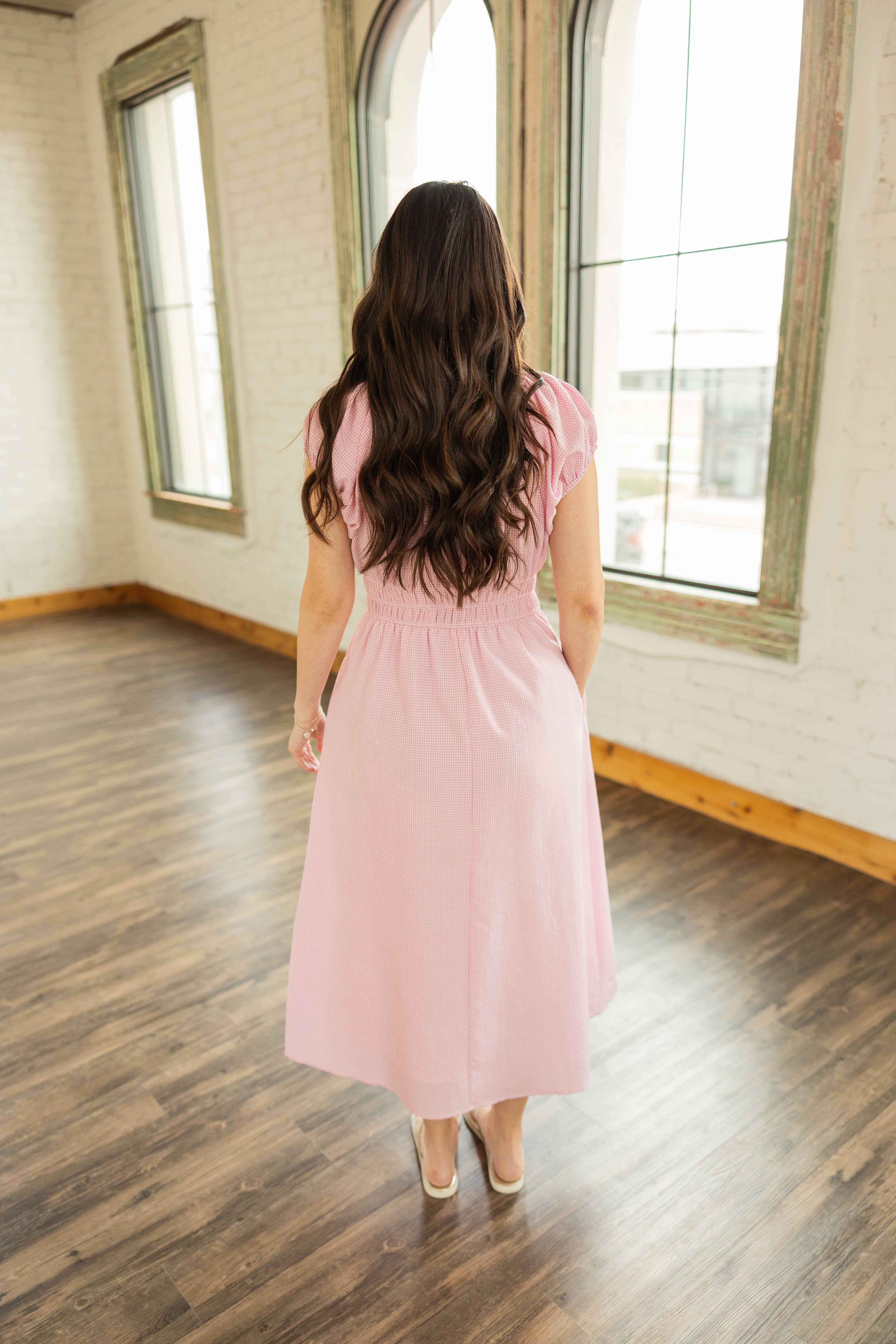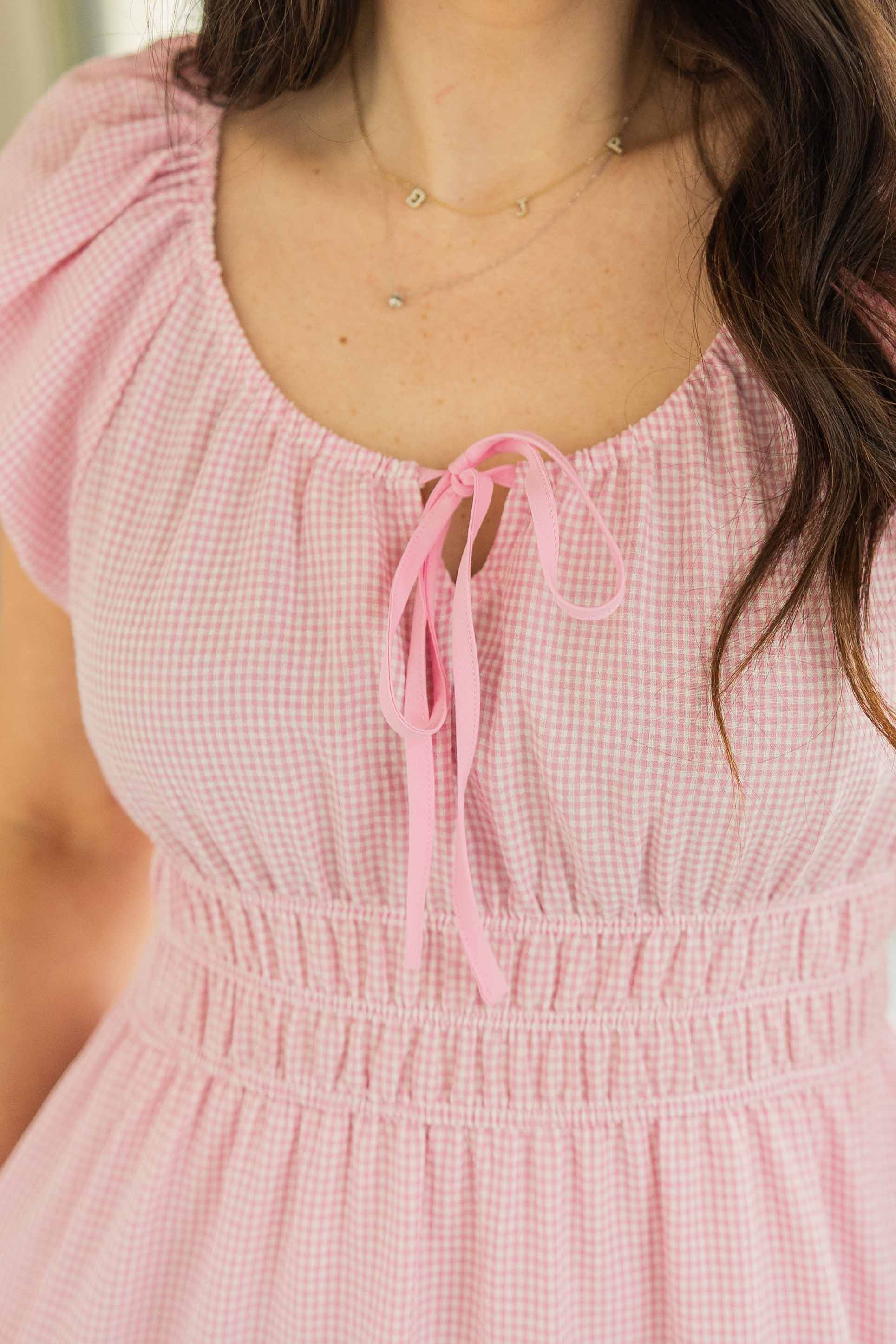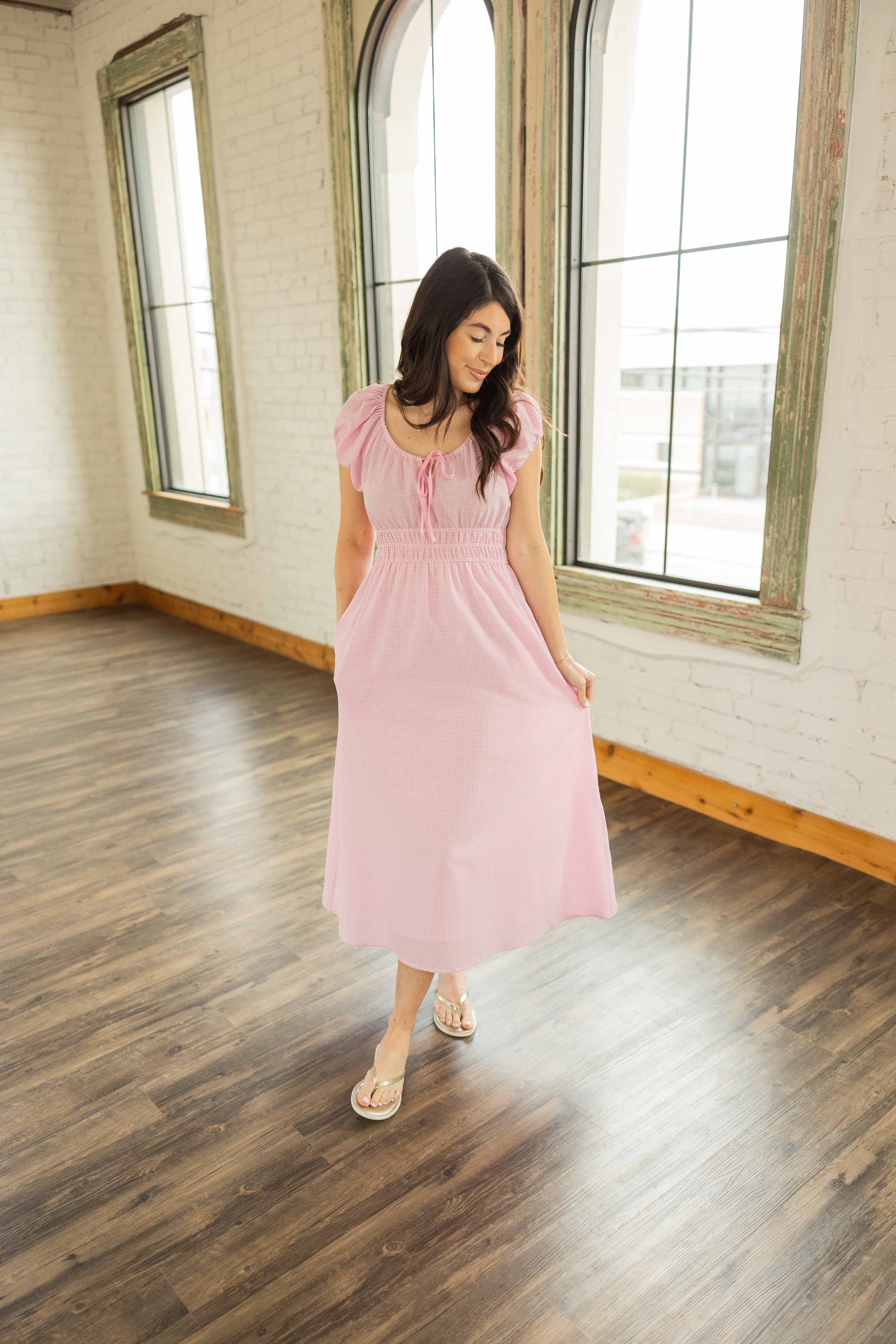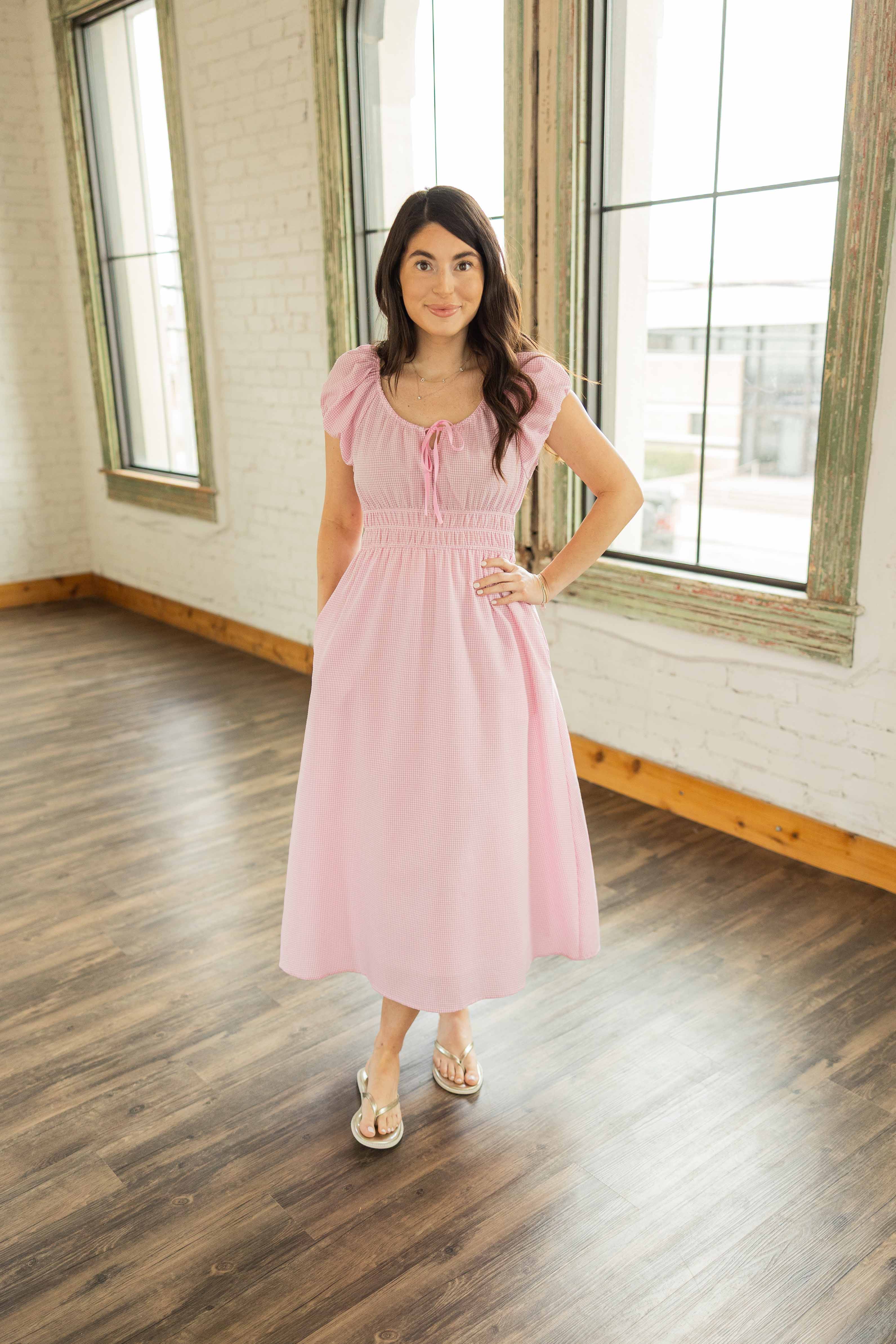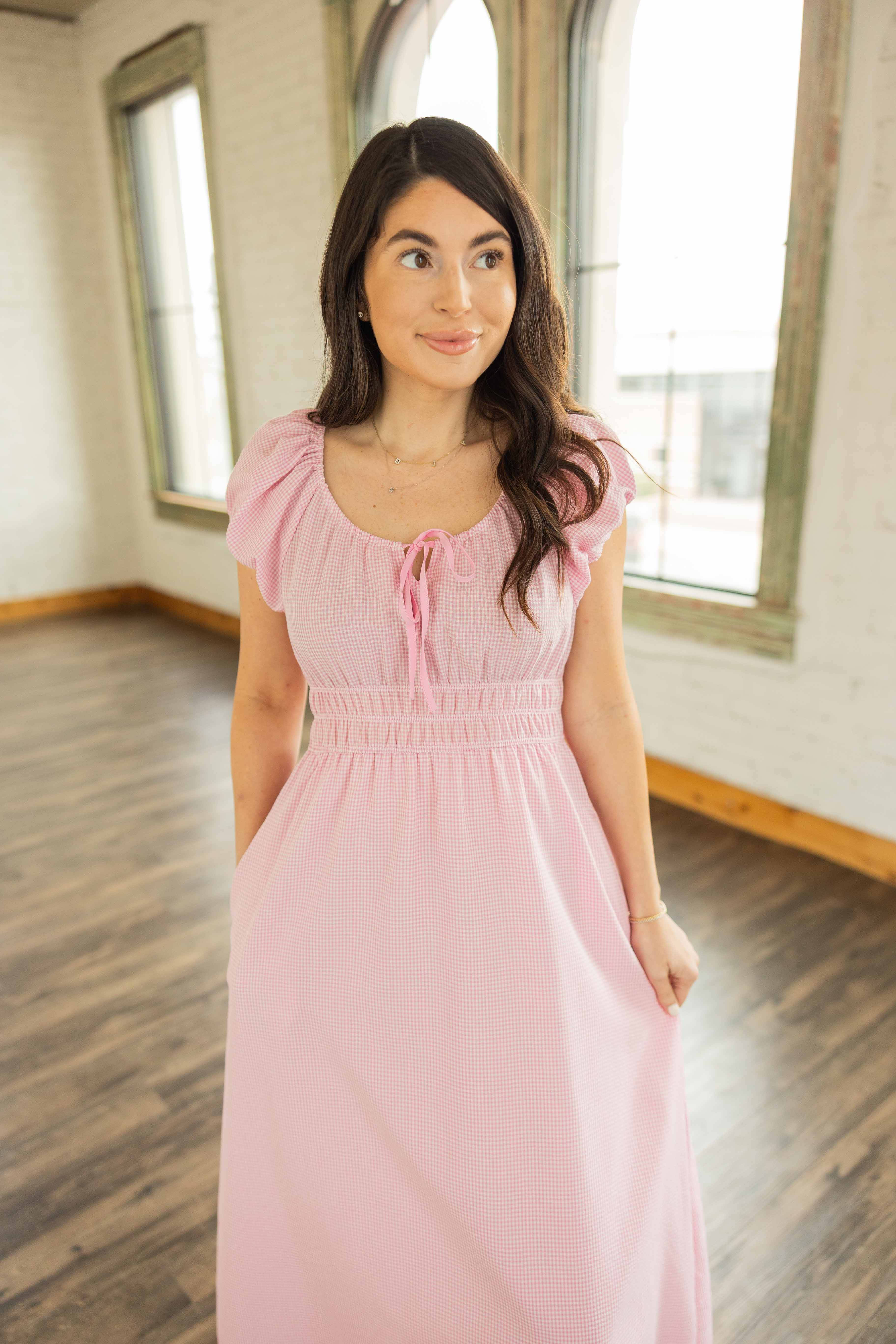 Sweet, classic, and just the right amount of charm. This soft blush pink gingham is giving picnic meets polished, with a flattering smocked empire waist that keeps things comfy but still shaped. The little front tie detail adds a feminine touch, and those fluttery cap sleeves keep it light and easy. Bonus points for pockets because we do not play about functionality.