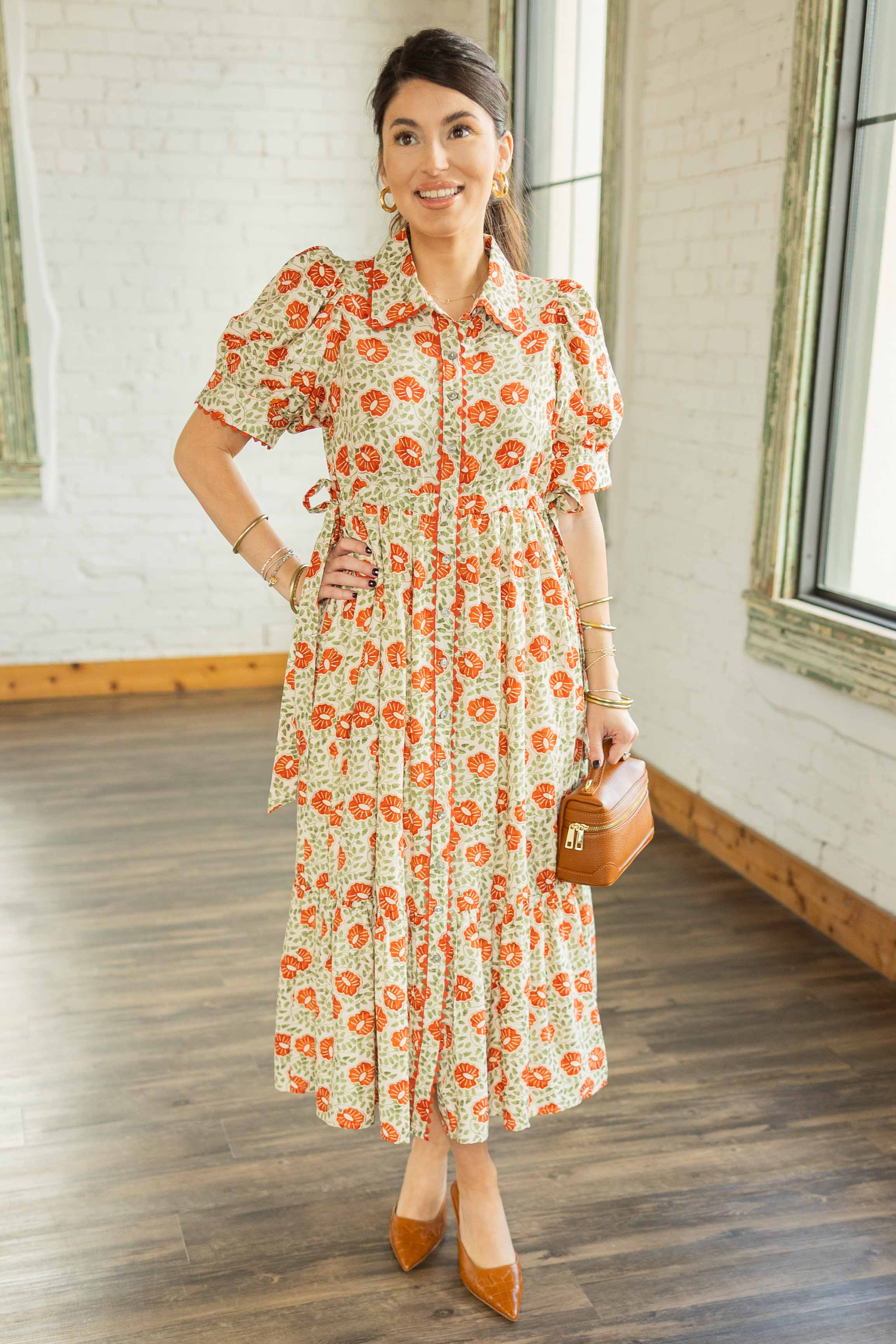 The Evangeline Dress brings a touch of vintage charm in a warm cream base with burnt orange florals and subtle green accents. The scalloped trim and puff sleeves give it that perfect mix of sweet and timeless, while the adjustable tie waist flatters every shape. It’s one of those fall dresses you’ll wear on repeat—lightweight, lined, and easy to style with boots, flats, or sneakers.