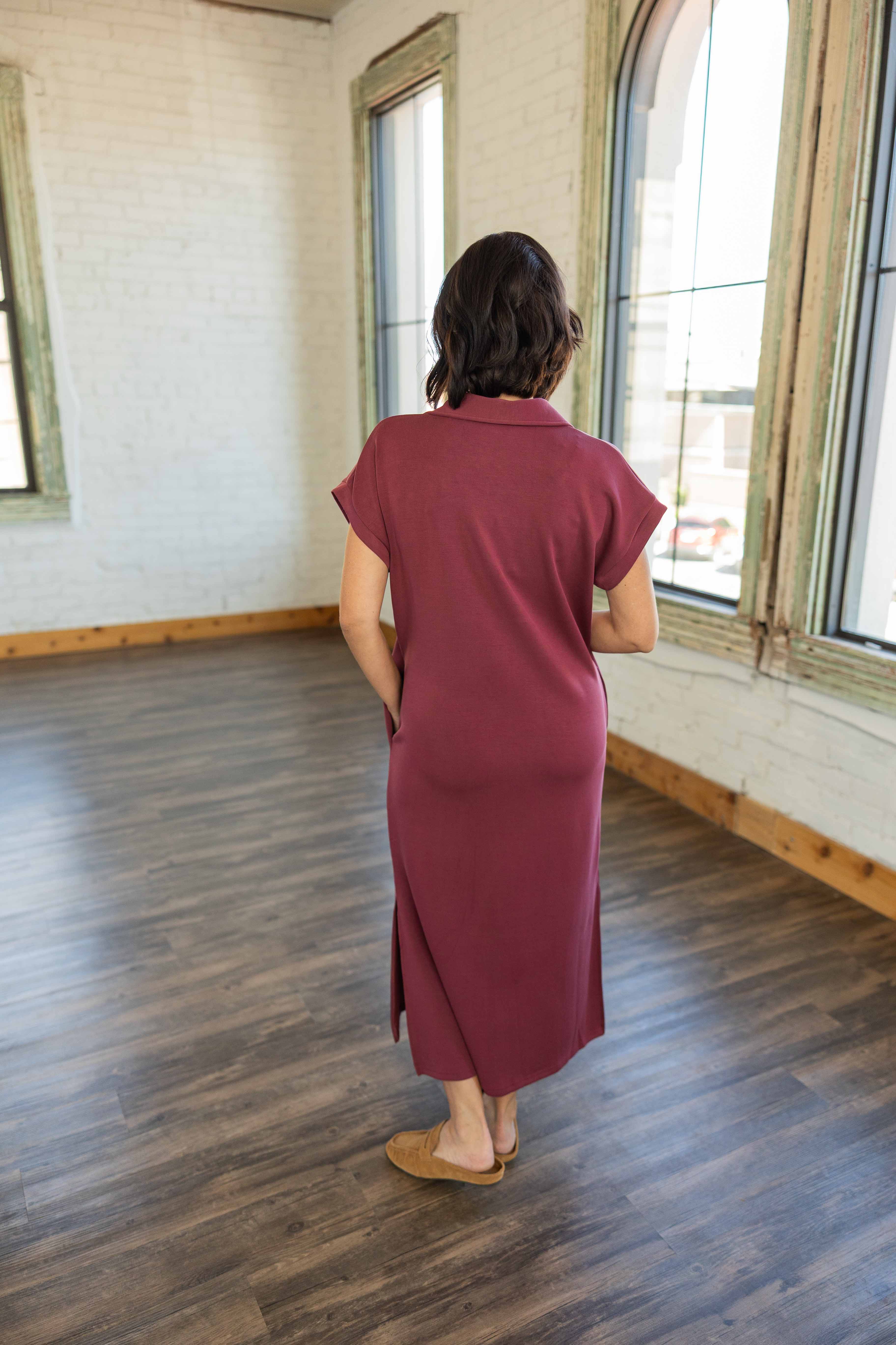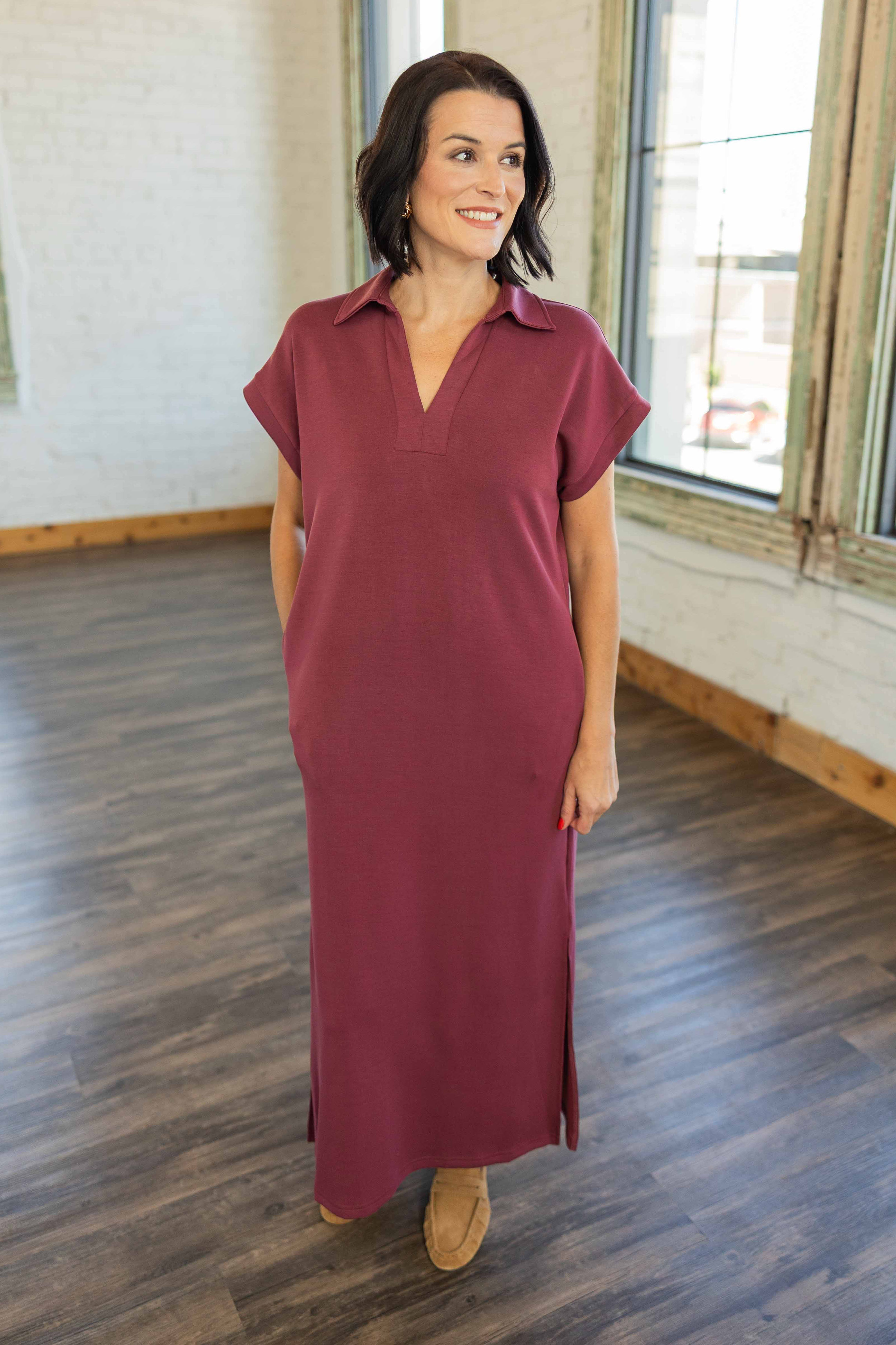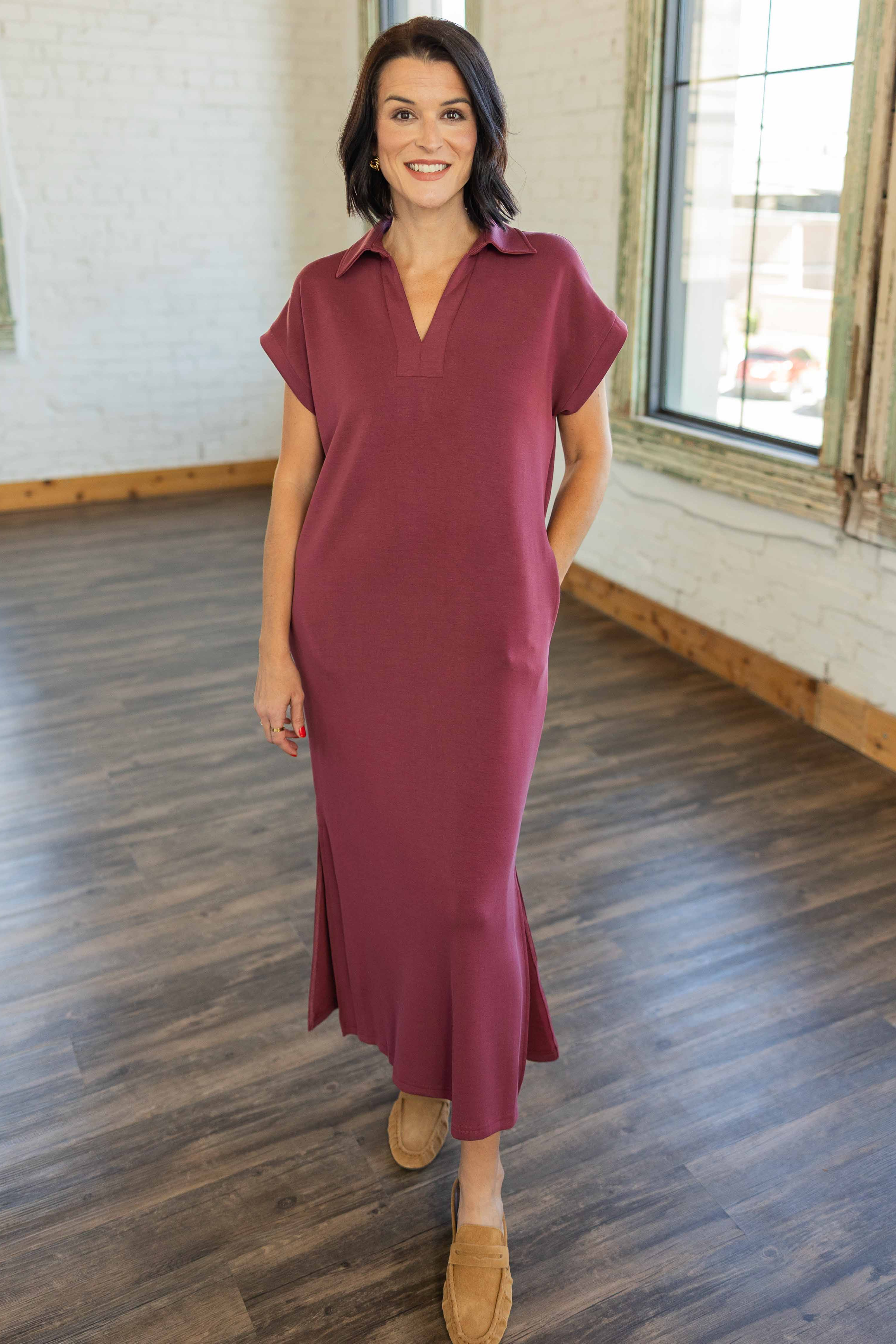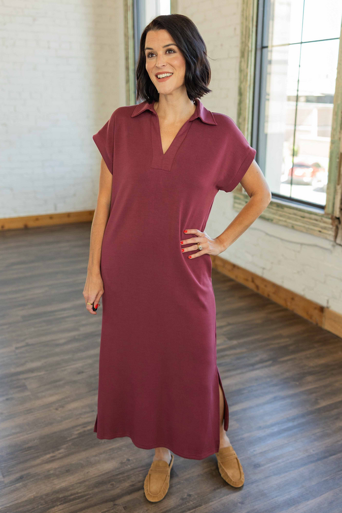 Meet your new favorite “throw it on and look put together” dress. The Scout is an easy knit midi in a warm maroon shade that gives effortless polish with zero effort. The split collar neckline and side slits keep it casual and flattering, while the soft stretch fabric makes it comfy enough for all-day wear.