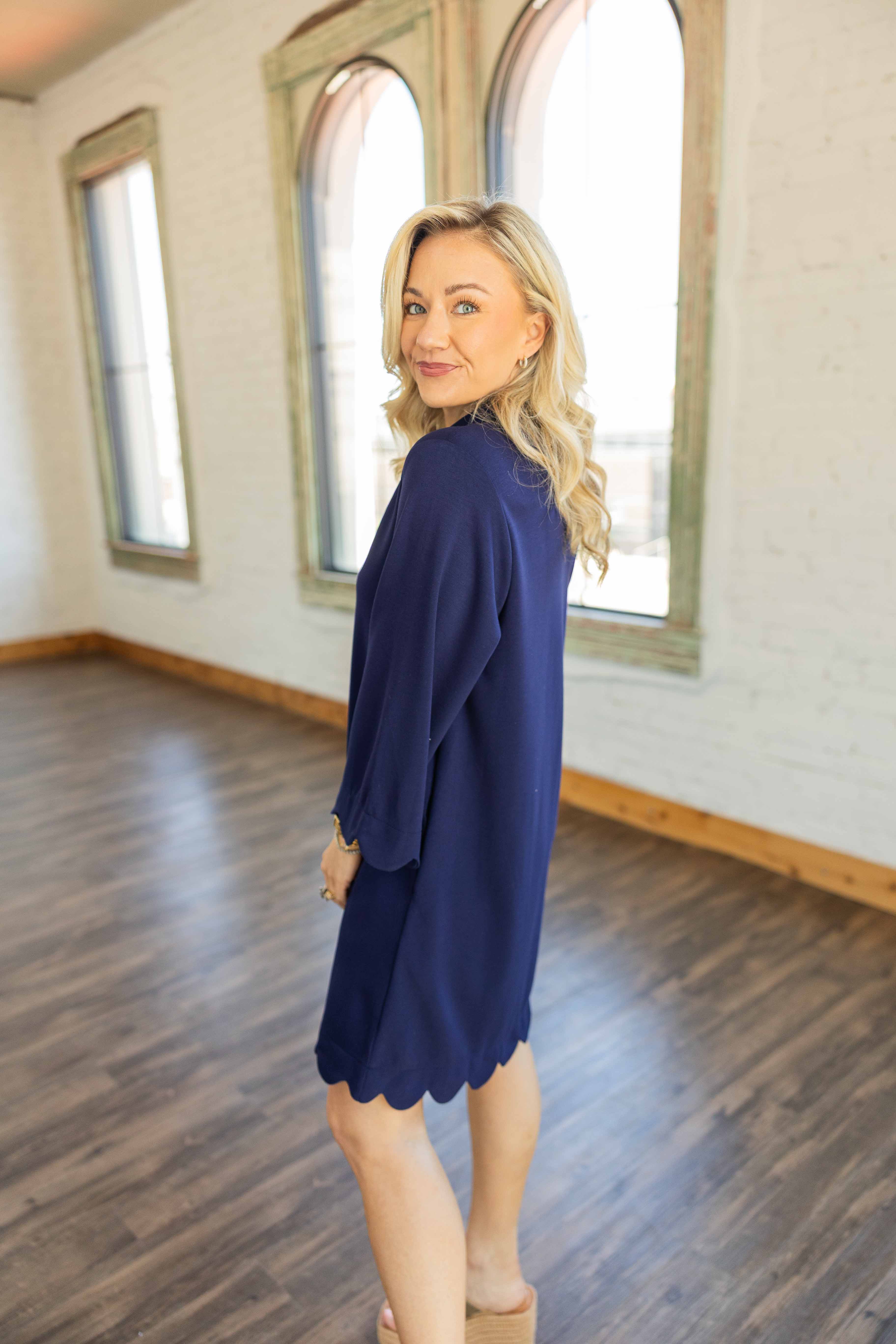 Simple. Polished. Does all the work for you. This deep navy dress is one of those pieces you reach for when you want to look put together with zero effort. The relaxed fit keeps it easy and comfortable, while the scalloped hem adds just enough detail to feel special. The soft, stretchy fabric moves with you, and those 3/4 sleeves give you that little extra coverage without feeling heavy. Oh, and yes. It has pockets.