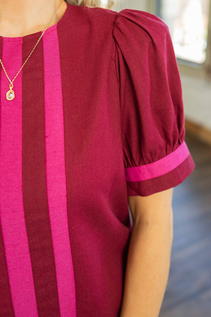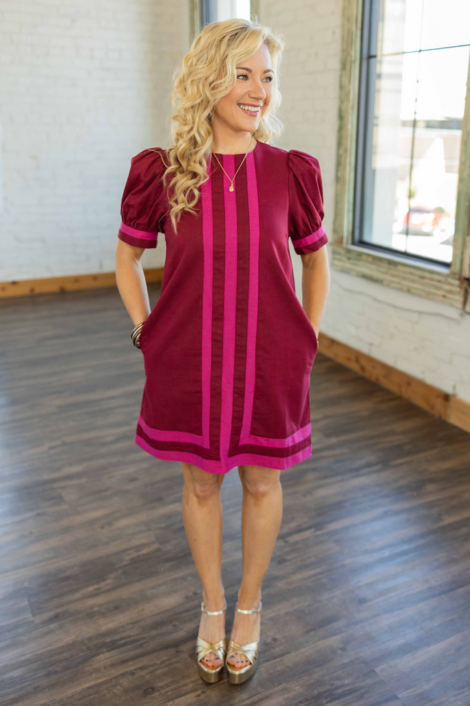 Bright, bold, and just plain fun. The Yazmin Dress is a playful pop of color in rich wine with hot pink geometric border detailing. The puff sleeves and relaxed shape make it an easy, flattering fit, while side pockets and a keyhole back closure keep it functional too. It’s that “wow” piece that still feels effortless.
