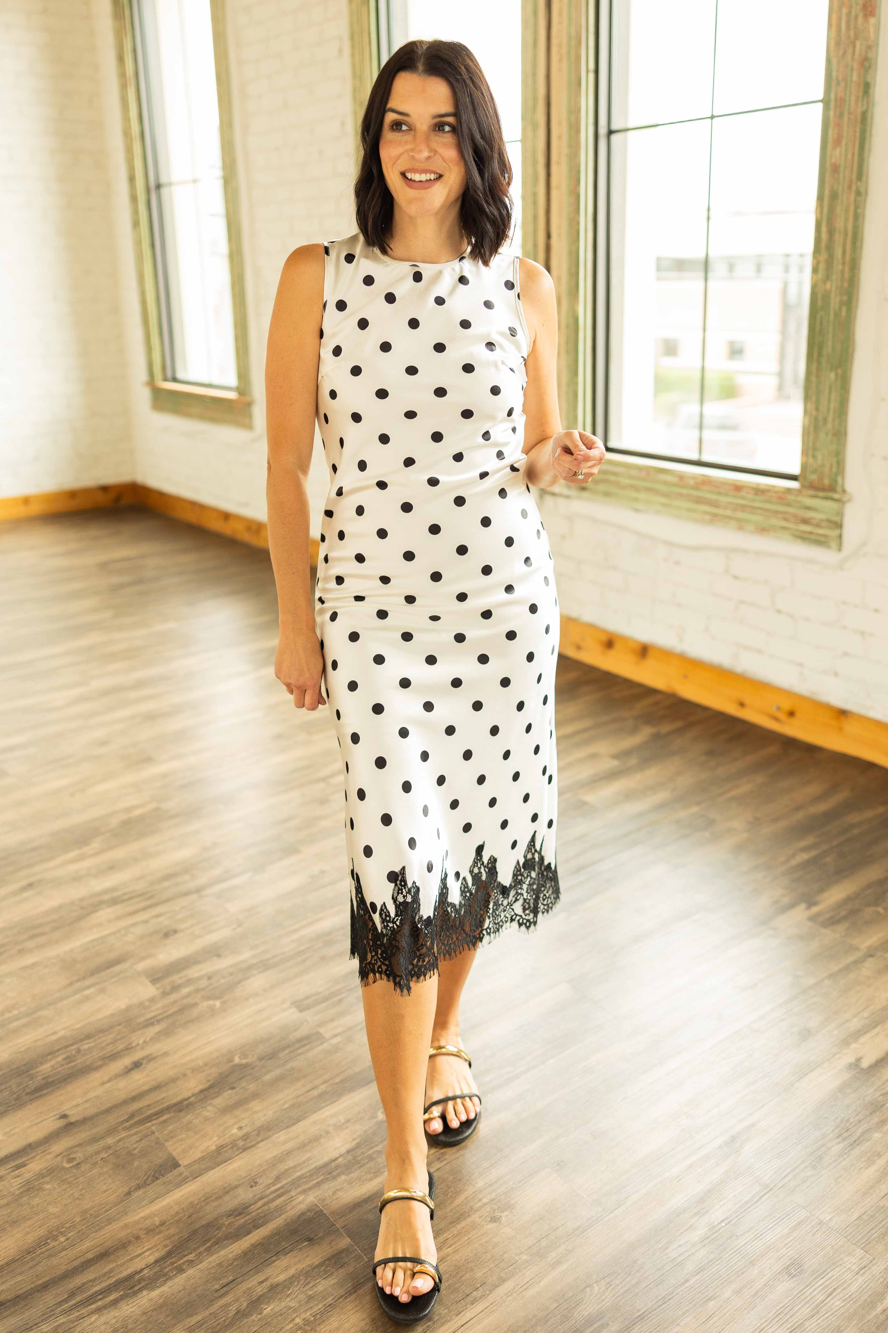 MYA SATIN LACE TRIM POLKA DOT MIDI DRESS