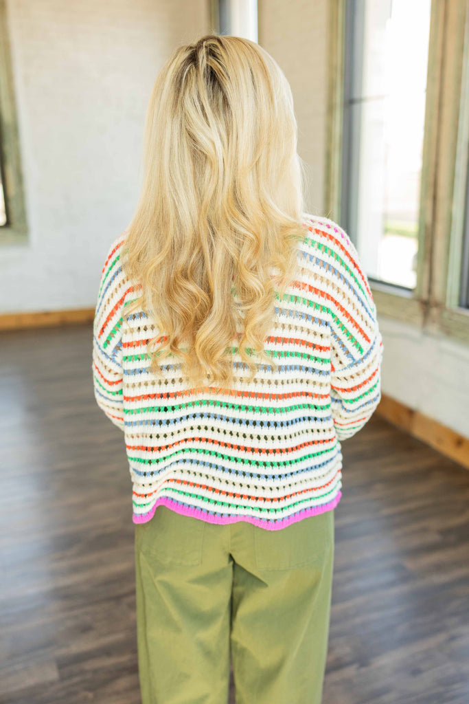The Caroline Sweater is cheerful, colorful, and ready to brighten up your day. Designed in an open crochet knit with stripes of green, orange, blue, and ivory plus a pop of hot pink trim, this roomy drop-shoulder pullover has an easy, boxy fit. Lightweight and semi-sheer, it’s perfect for layering over a tank or bralette. The kind of sweater that makes casual look fun.
