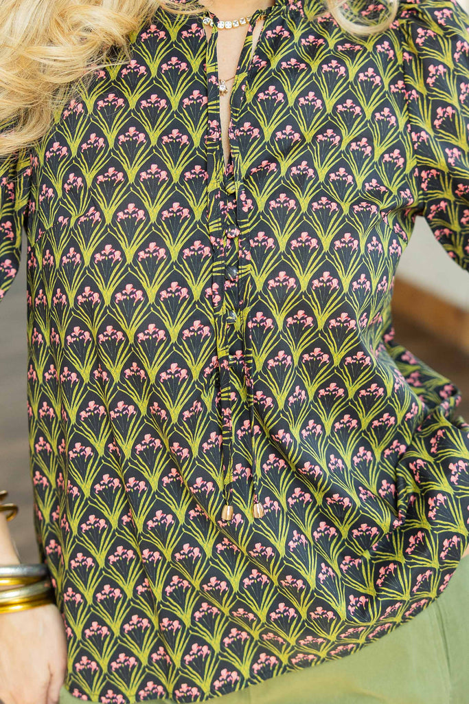 The Daleyza Top adds a bold twist to your everyday rotation. Designed in 100% cotton, it features a geometric-inspired print in shades of green, pink, and black for a fresh pop of pattern. The ruffled mock neck and adjustable self-tie detail at the neckline give it just the right amount of polish, while the relaxed fit and short sleeves keep it easy and breathable. Lightweight and versatile, it’s a top that works from desk to dinner.