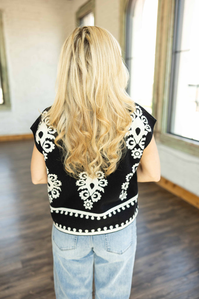 The Miriam Top is a bold statement piece in classic black and white. Designed with a striking damask pattern, this sweater knit pullover brings a polished edge to your everyday look. The cap sleeves and waist-cropped length keep it modern, while the medium-weight knit makes it perfect for year-round wear. Easy to dress up with trousers or pair down with denim.