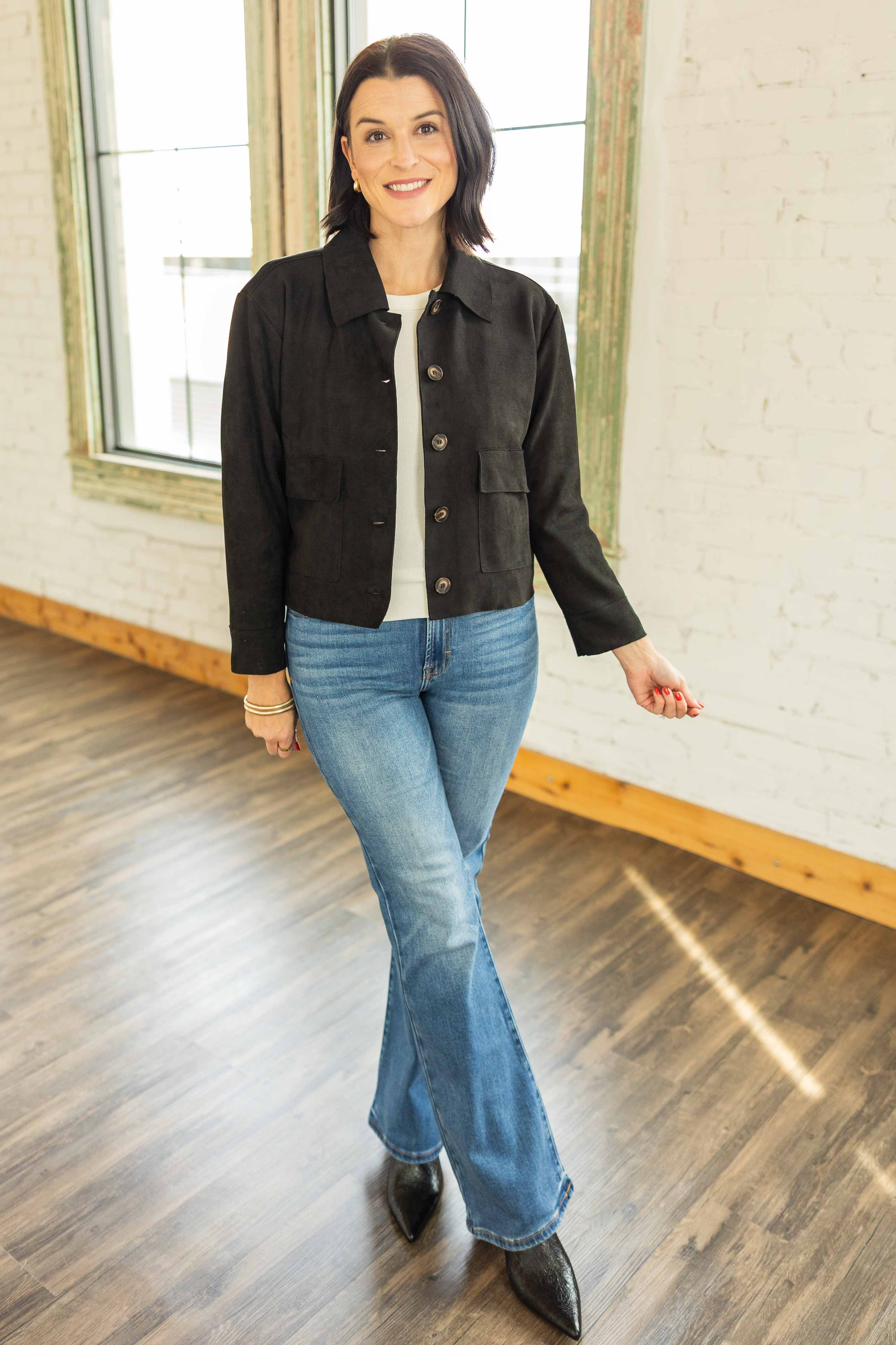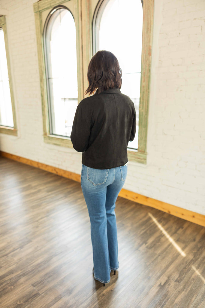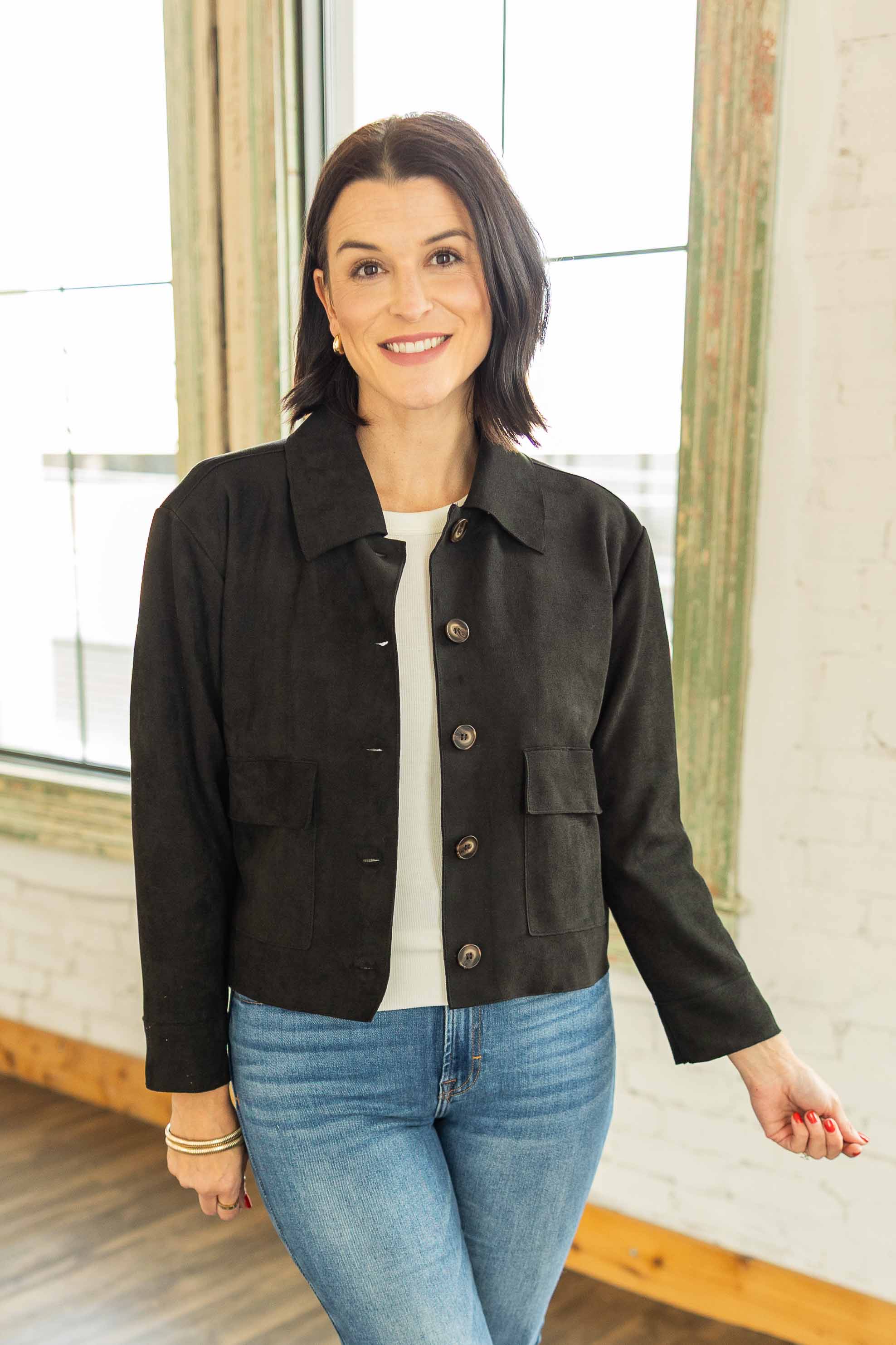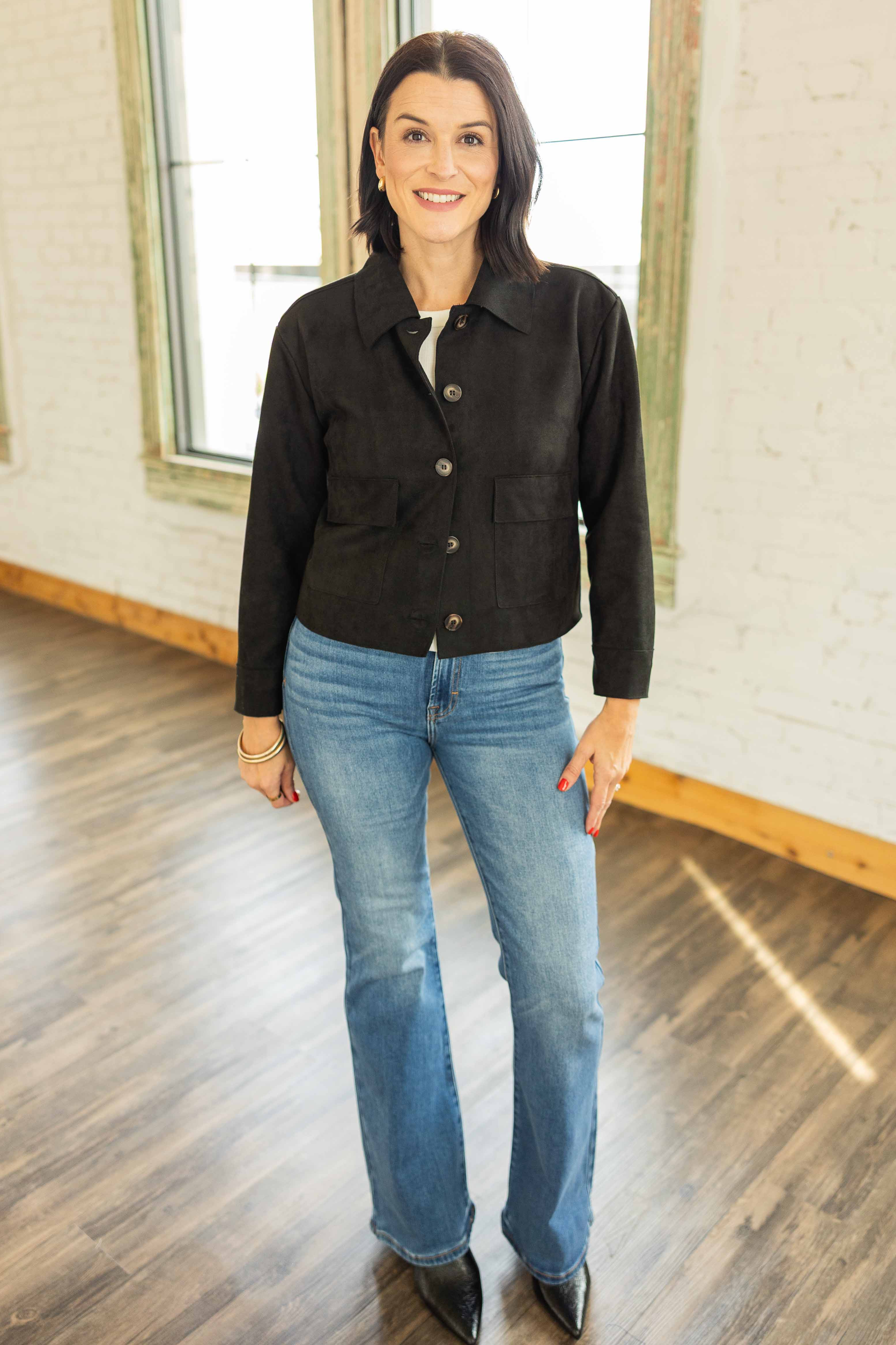 A sleek layer that goes with everything. This soft suede like jacket has a relaxed fit and a slightly cropped shape that flatters your waistline. The collared neckline and button front keep it classic. Lightweight, so it is perfect for those not quite cold winter days in Texas. Dress it up or throw it on with jeans.