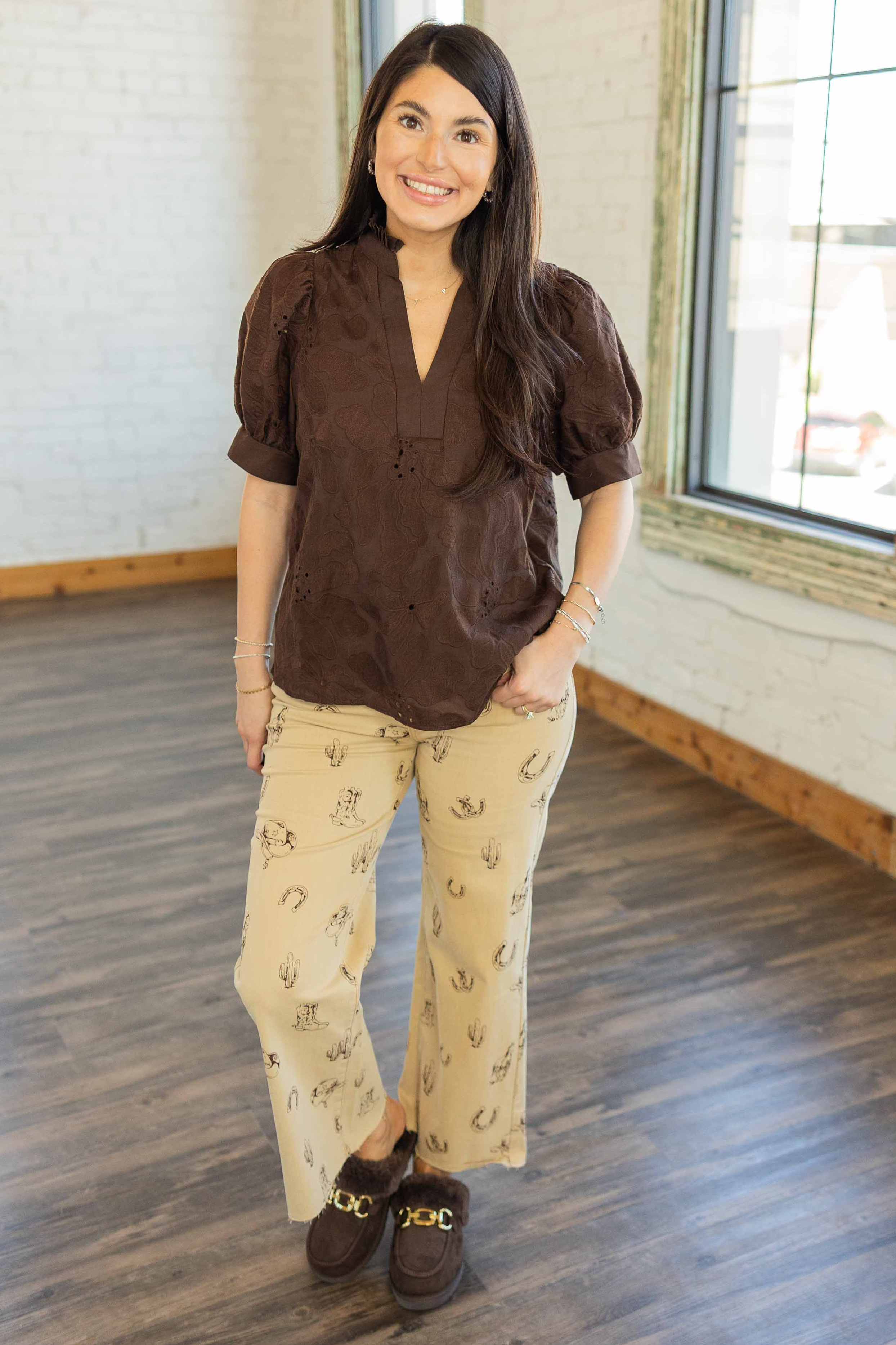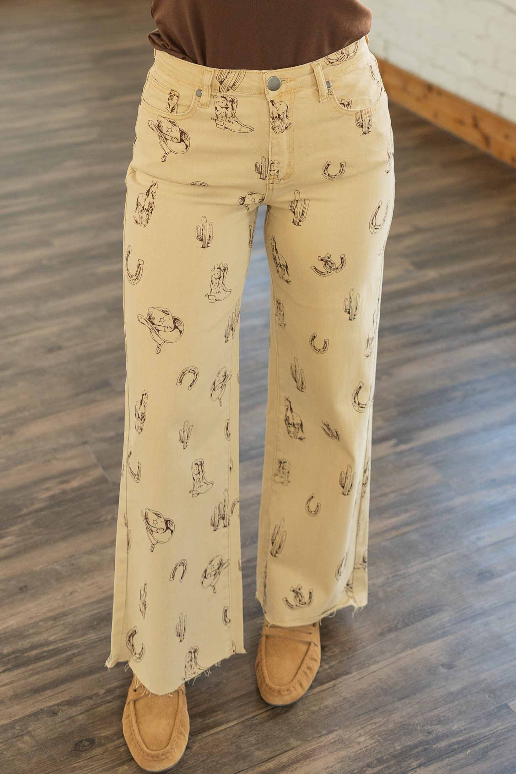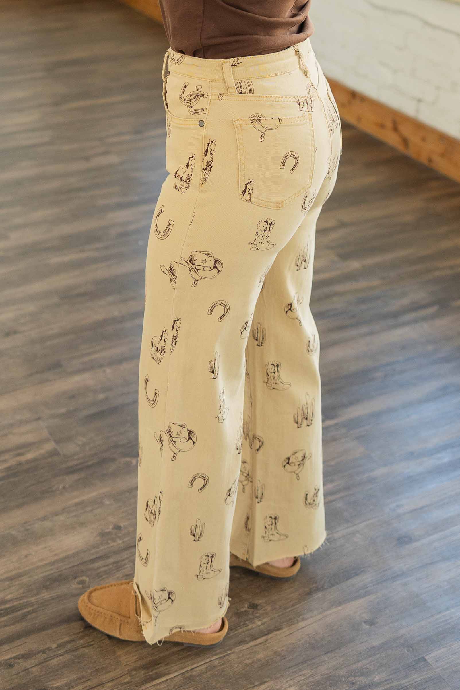 These pants are pure rodeo-meets-runway energy. The Nevaeh Pants feature a fun western print with cowboy hats, cacti, and horseshoes on a light tan base. Designed with a flattering mid-rise waist, a wide leg, and a raw hem that gives them a cool, lived-in feel. Comfy, lightweight, and full of personality.