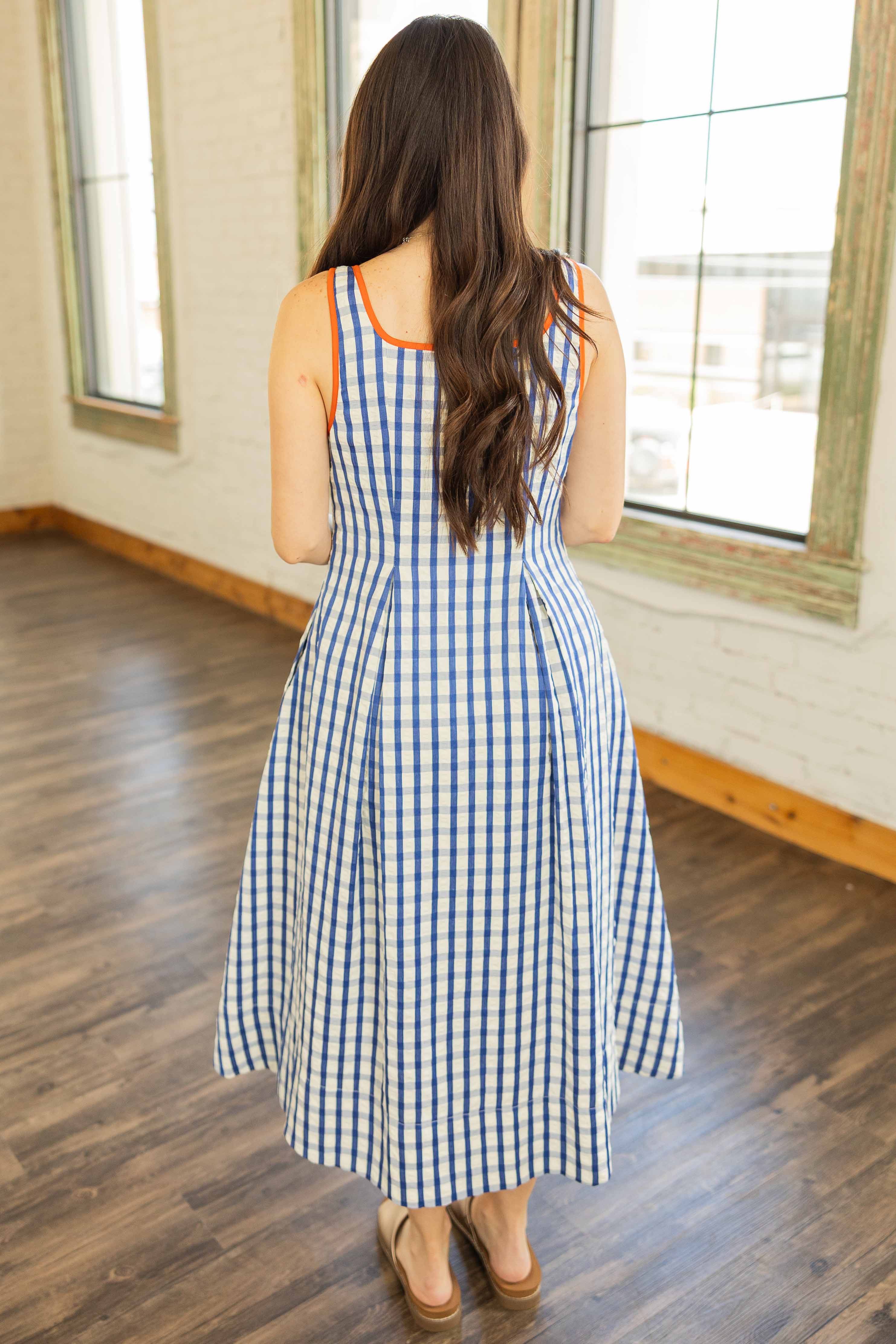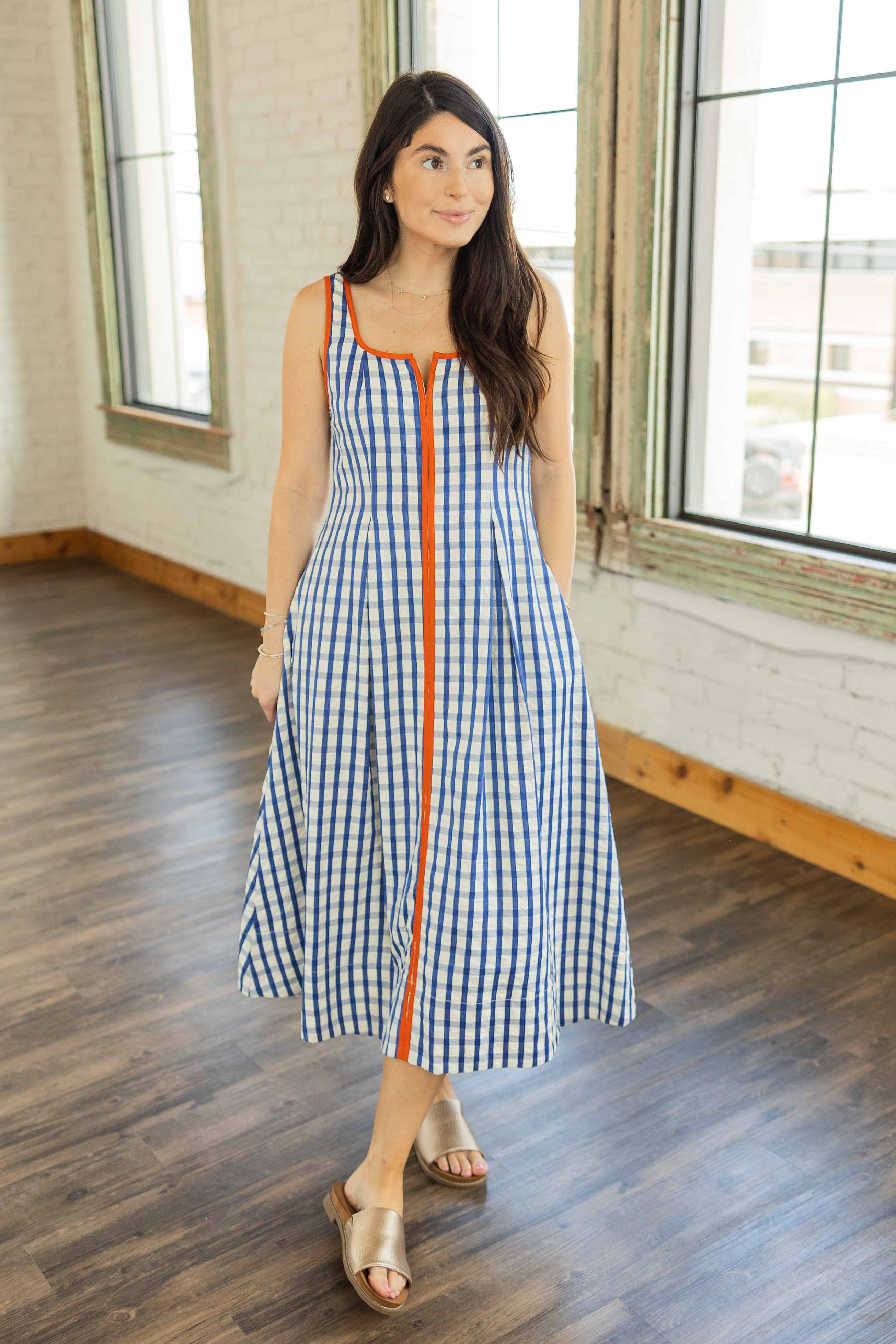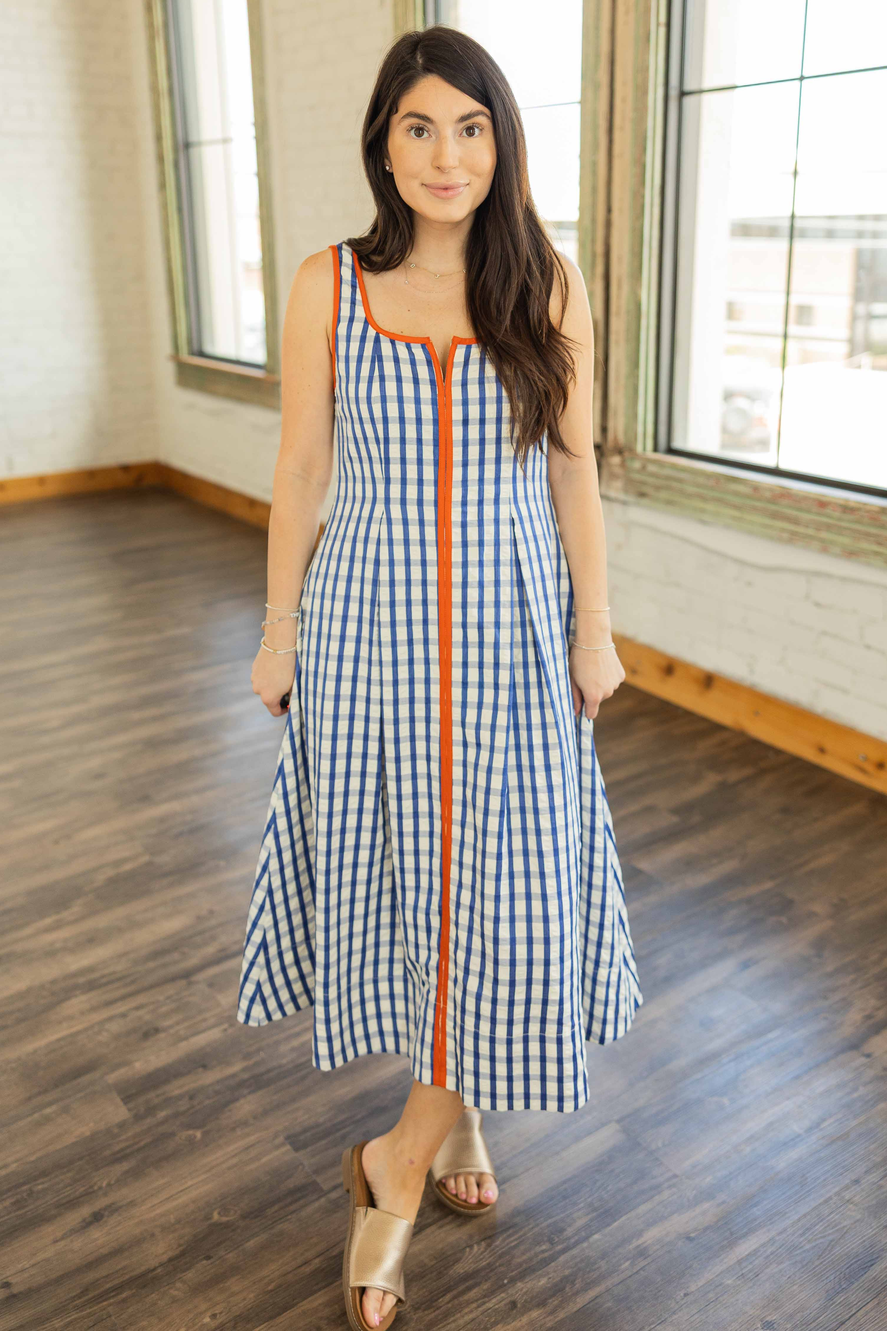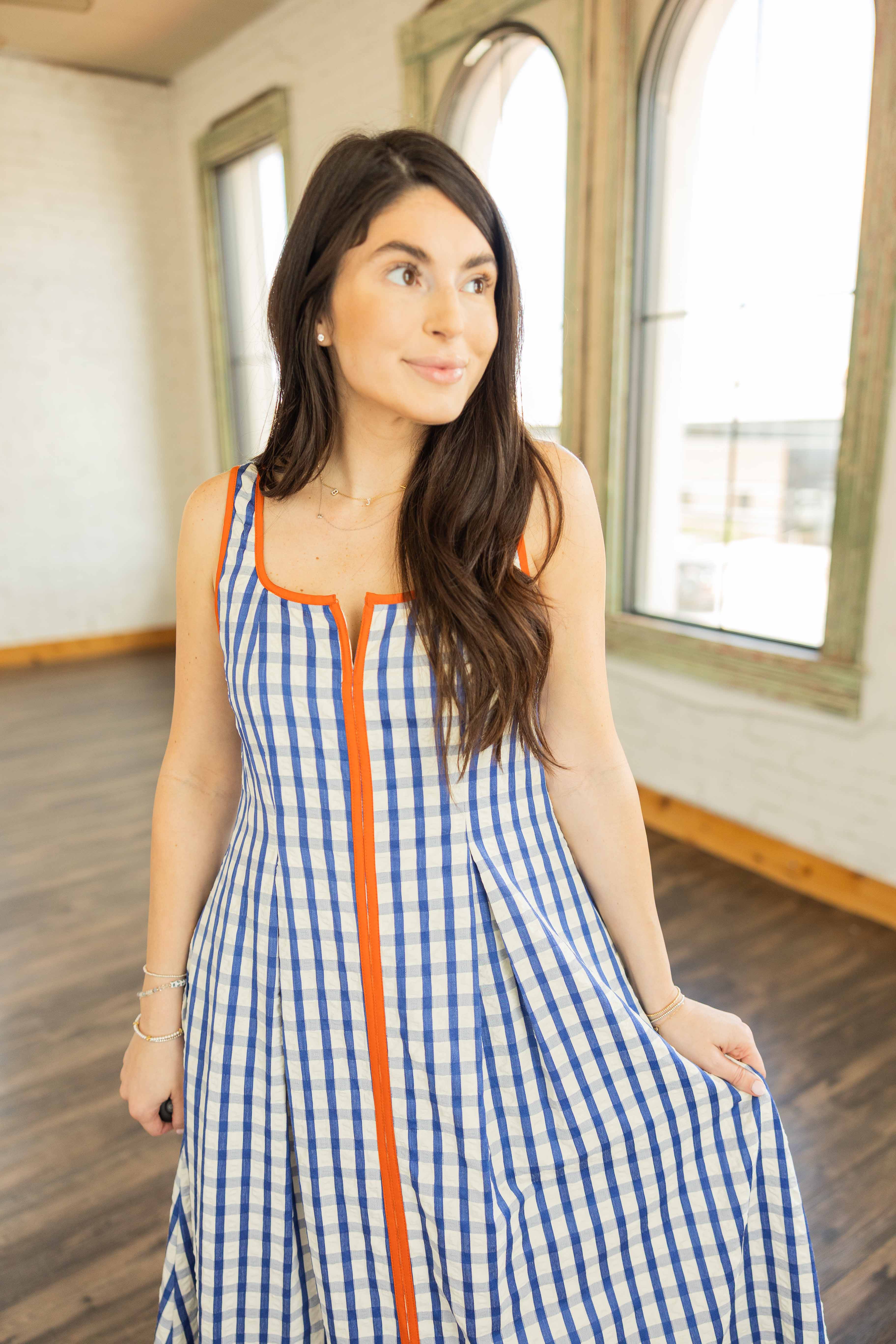 This one feels like sunshine in dress form. The Daniela Gingham Midi Dress features a classic blue and ivory gingham print with a bold pop of orange trim that runs down the front for a fun unexpected twist. The structured silhouette creates a flattering shape while the square neckline with a small V notch adds a clean modern detail. The midi length keeps it polished and the lined fabric gives it a smooth comfortable feel. It is playful, crisp, and perfect for spring days when you want something that stands out just a little.