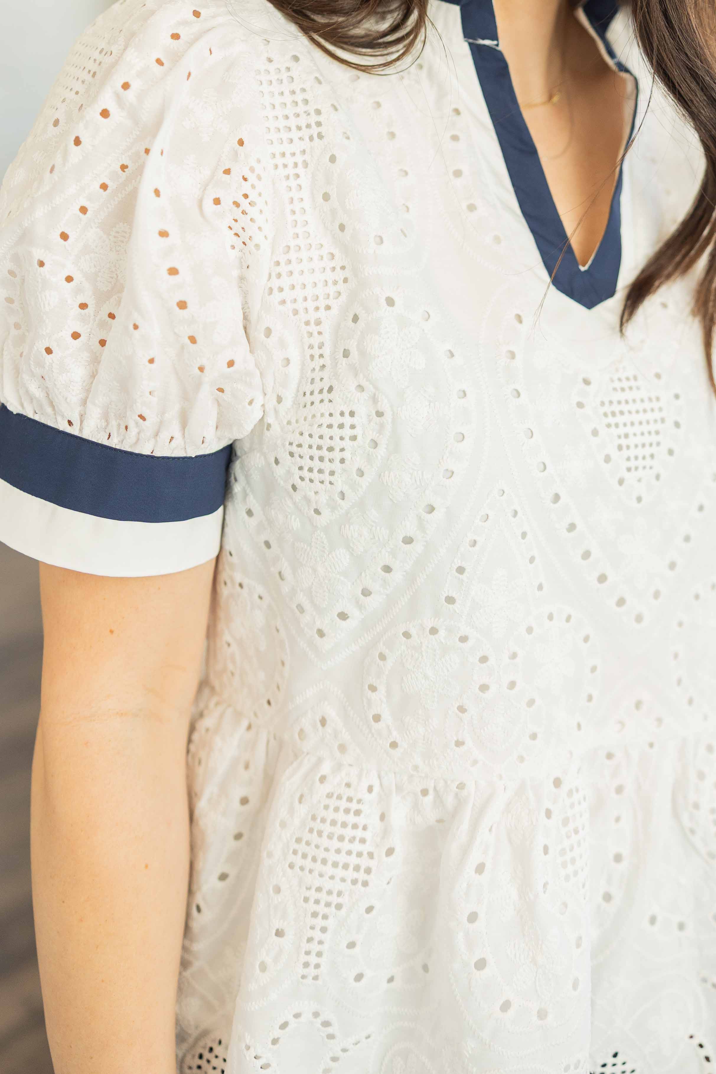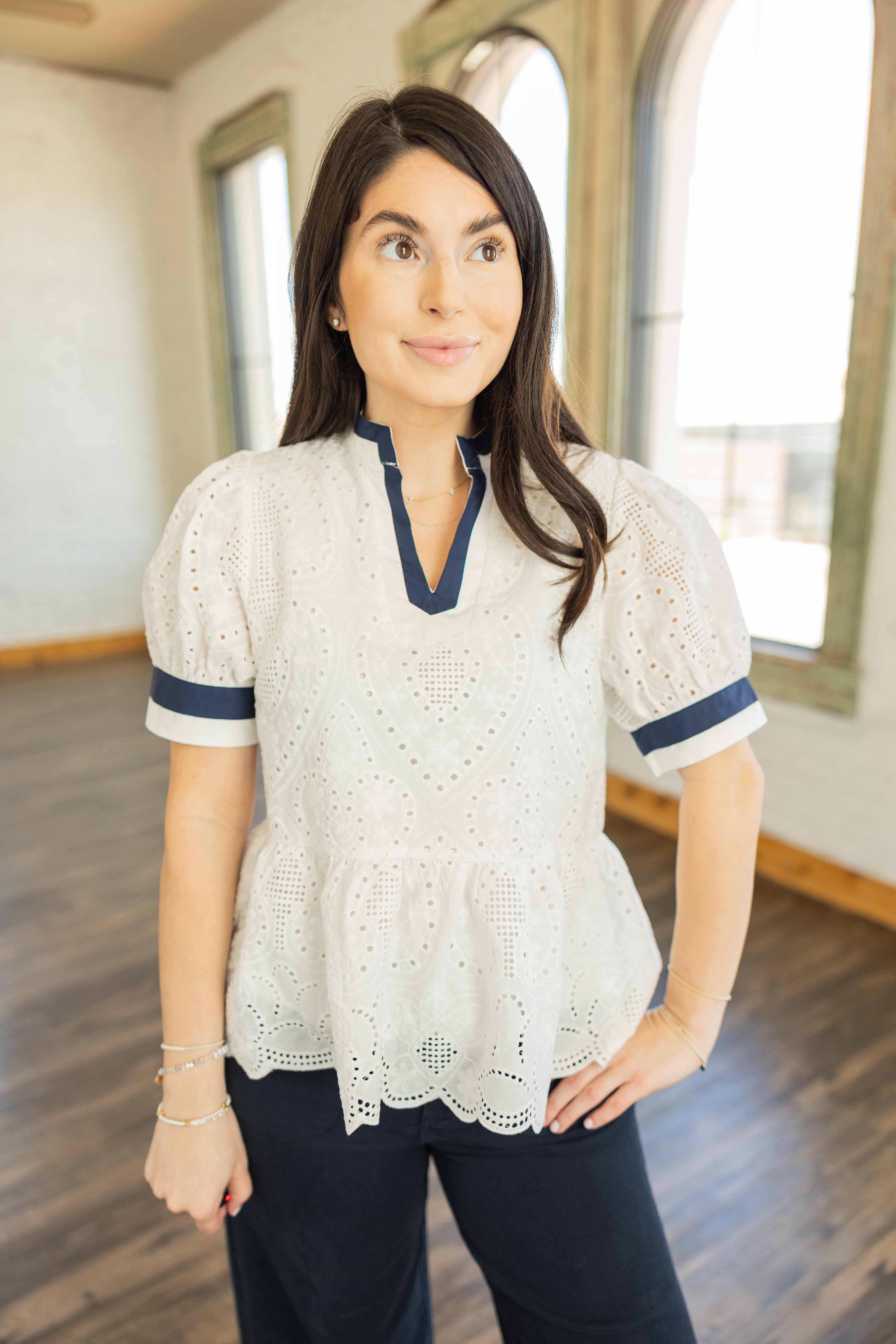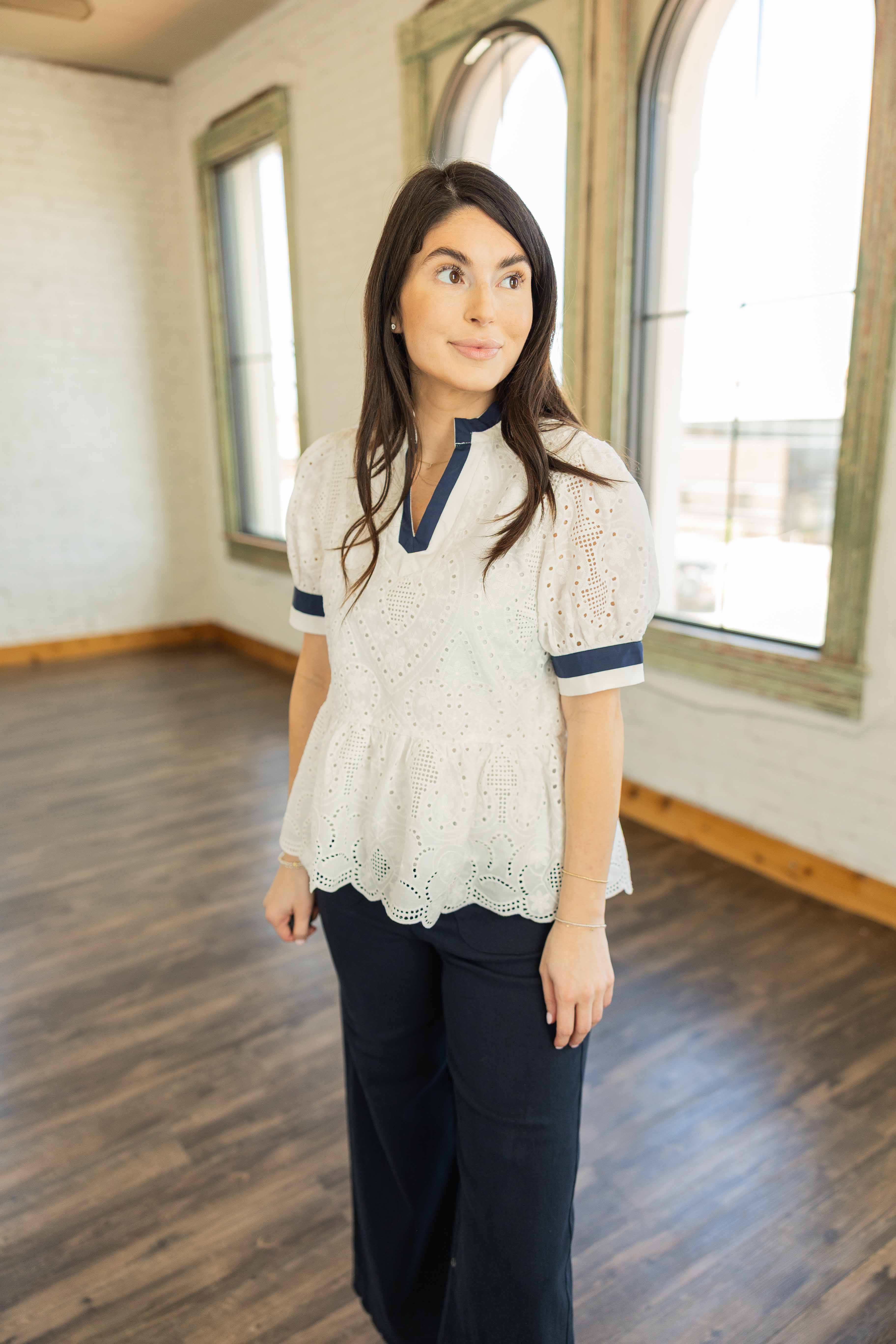 Sweet with a little structure. The Julia Eyelet Peplum Top brings classic charm with a crisp navy and ivory color combo. The ivory eyelet fabric gives this top beautiful texture while the navy contrast trim at the standing neckline and sleeves adds a polished touch. The relaxed peplum shape creates an easy, flattering fit and the scalloped hem detail keeps it feminine and fun. This is the kind of top that looks dressed up without trying too hard.