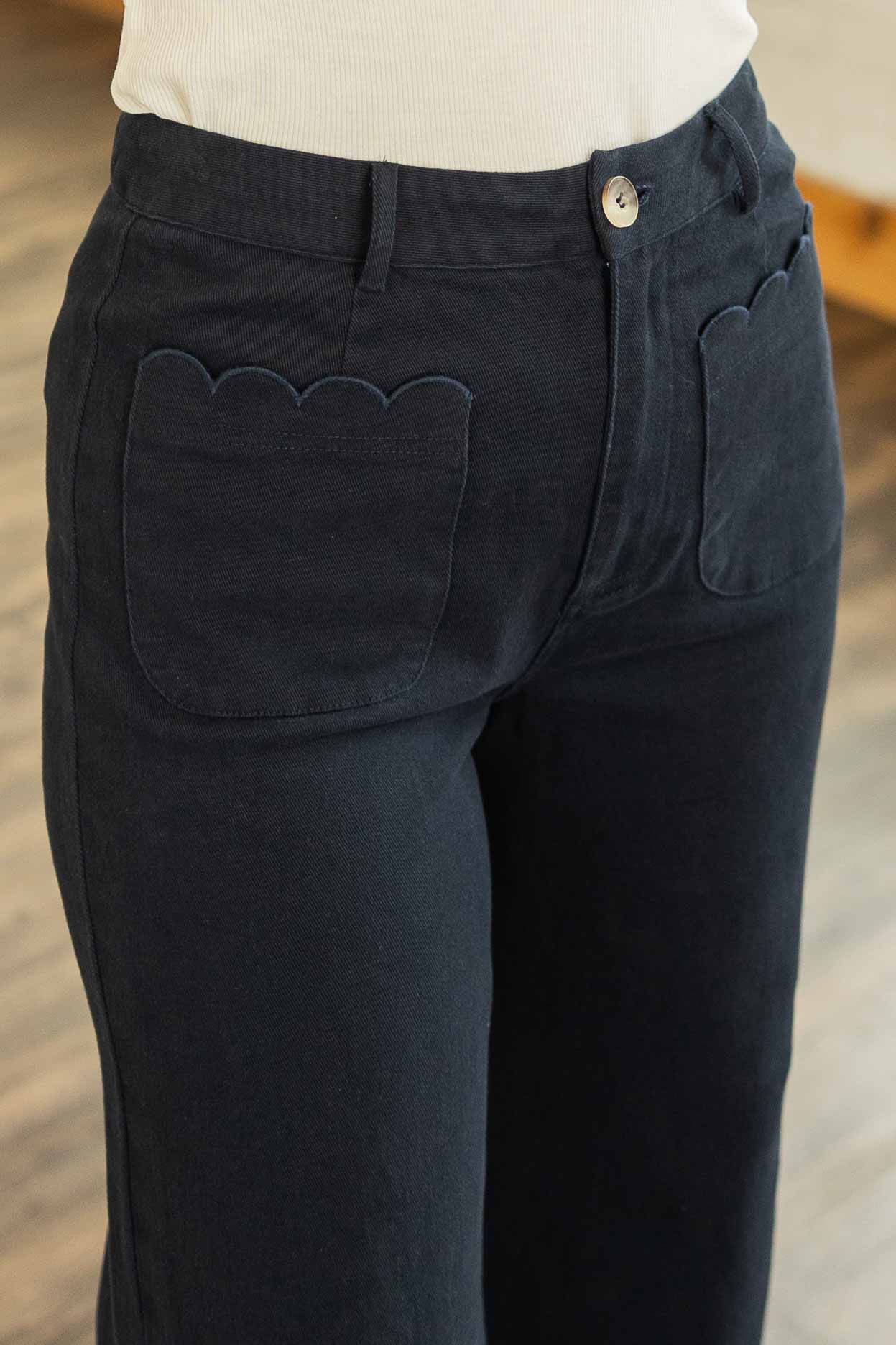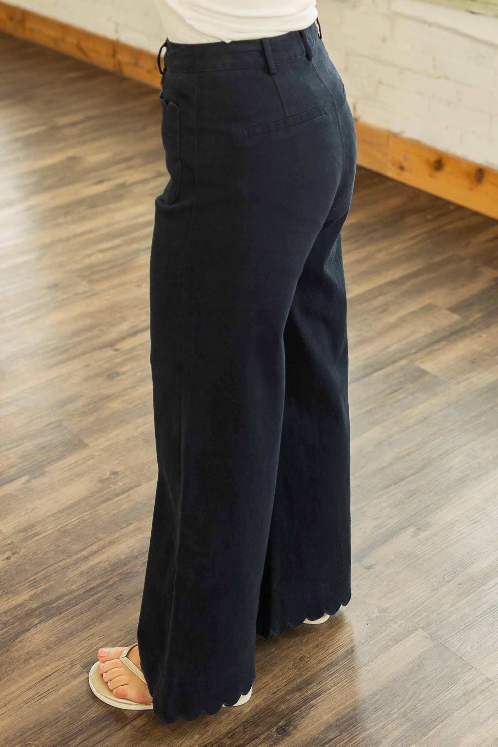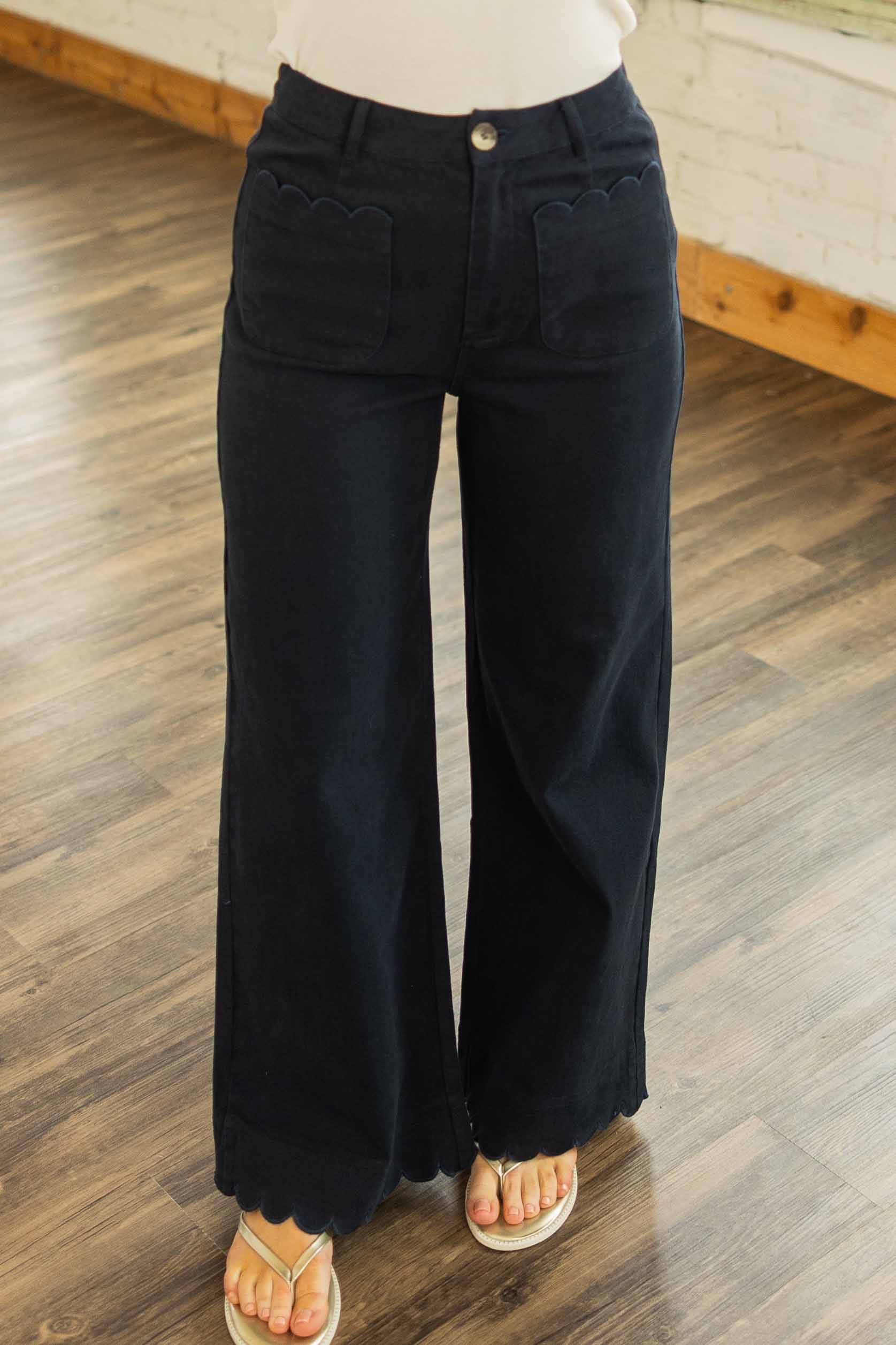 A good black pant is a wardrobe staple. This one just happens to be extra cute. The Kaia Scallop Trim Cropped Pants feature a flattering high waist with a relaxed wide leg silhouette that feels polished but still easy to wear. The scalloped trim detail along the front patch pockets and hem adds a playful twist that makes these stand out from your everyday black pants. The cropped length pairs perfectly with sandals, sneakers, or wedges and the slight stretch keeps them comfortable all day.