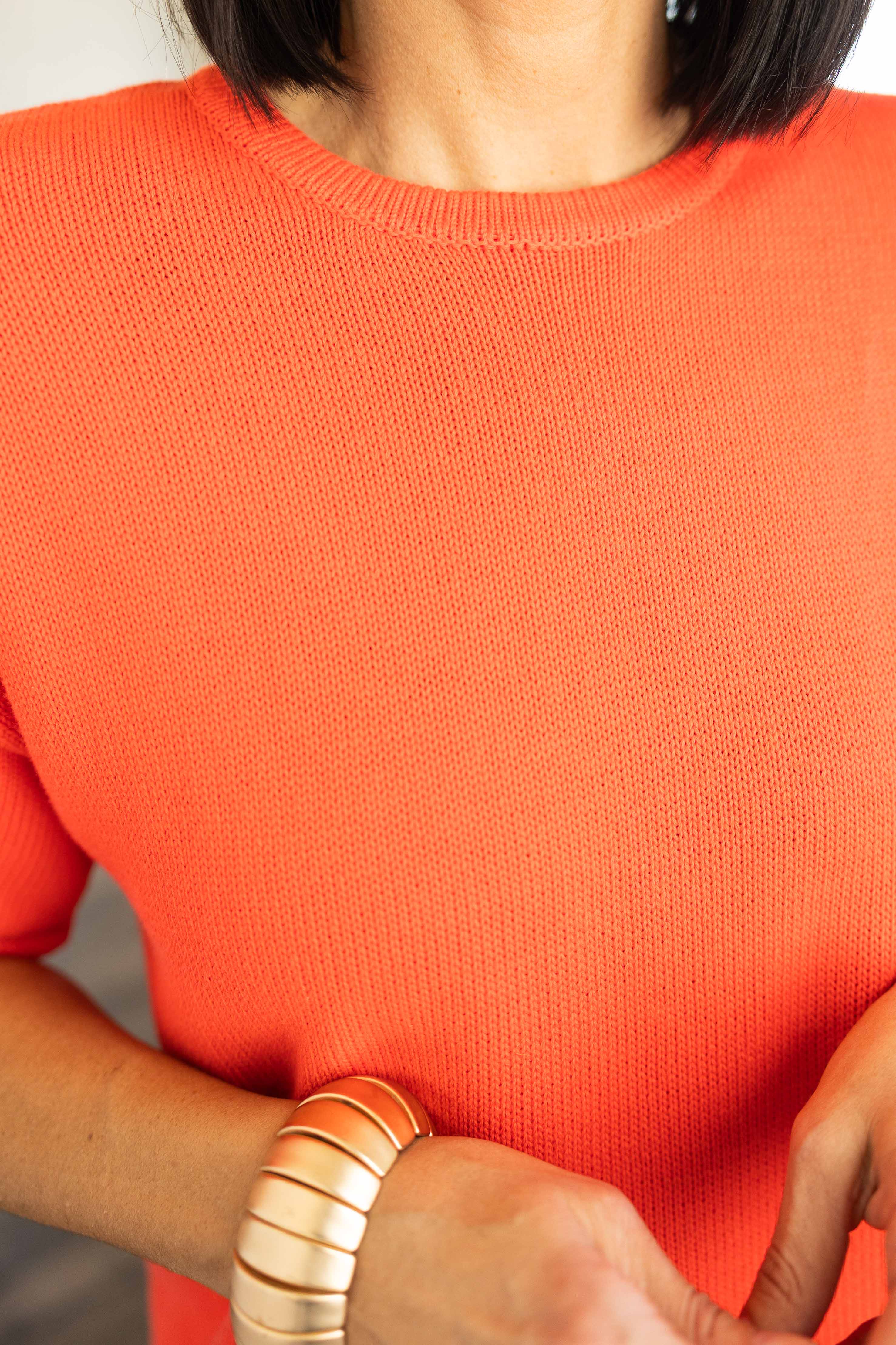 Bright, comfy, and ready for anything. The Rachel Sweater Set comes in a bold coral orange that instantly brings the fun. The lightweight sweater knit top has a relaxed drop shoulder fit with rolled sleeves and easy movement. The matching shorts feature a comfortable elastic waistband and a short 3 inch inseam that keeps the whole look playful and relaxed. Wear the set together for an effortless outfit or mix the pieces with your favorite basics.