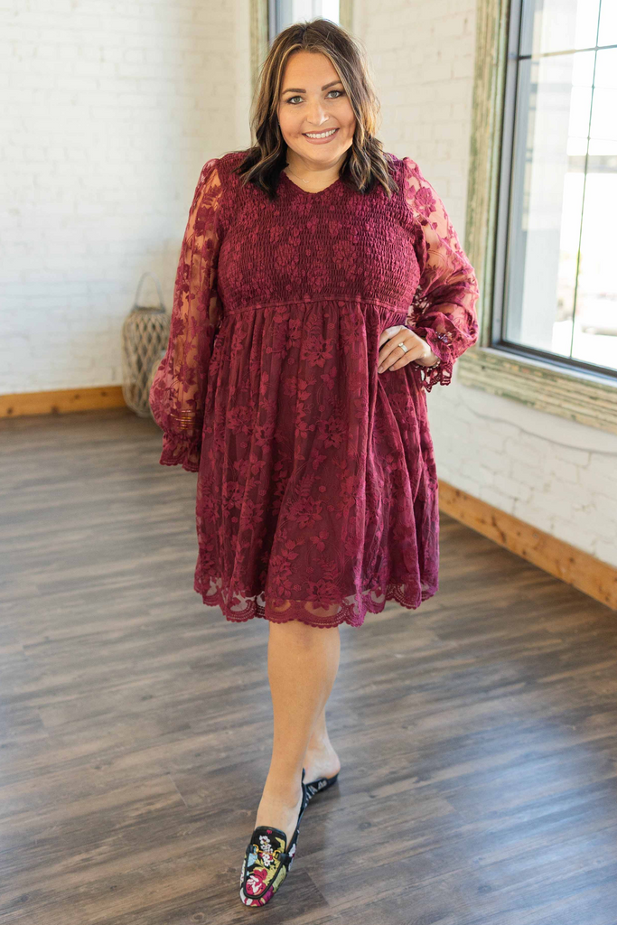 BRISTOL PLUS LACE LONG SLEEVE SMOCKED BODICE MINI DRESS
